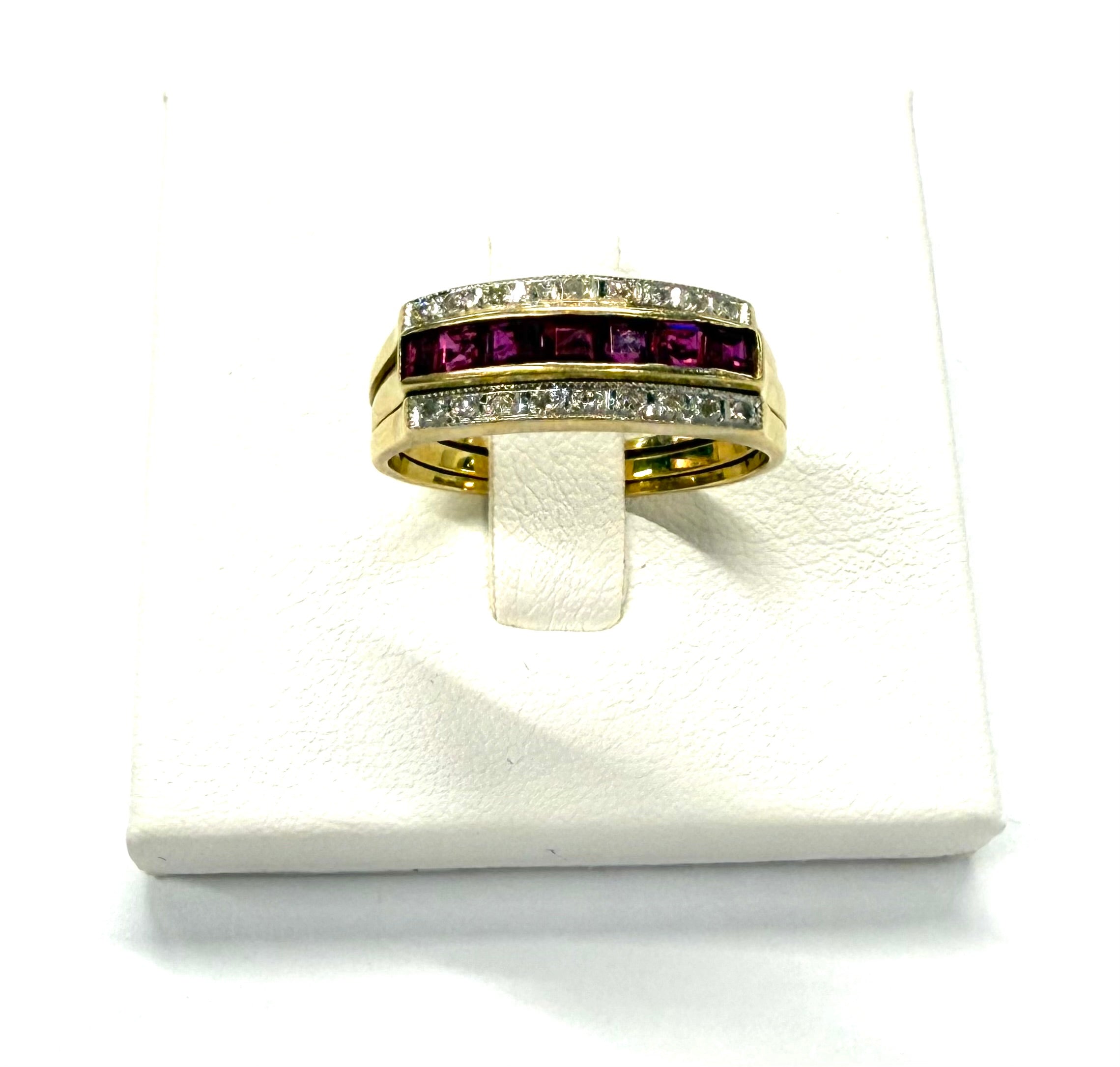 Ces sublimes bagues interchangeables en or jaune 18 carats (750/1000) offrent une élégance modulable et raffinée. Avec un poids total de 6,94 grammes et une taille 52, elles s’adaptent parfaitement au doigt et permettent de varier les styles selon l’envie. Ornées d’éclats de diamants ainsi que de précieuses pierres — rubis, saphir et émeraude — elles allient éclat et couleur pour une touche sophistiquée et unique.