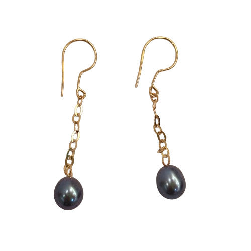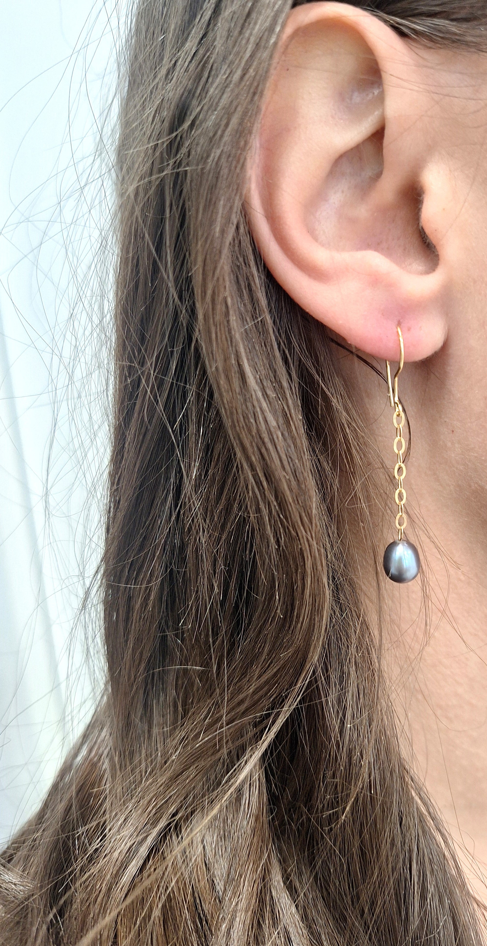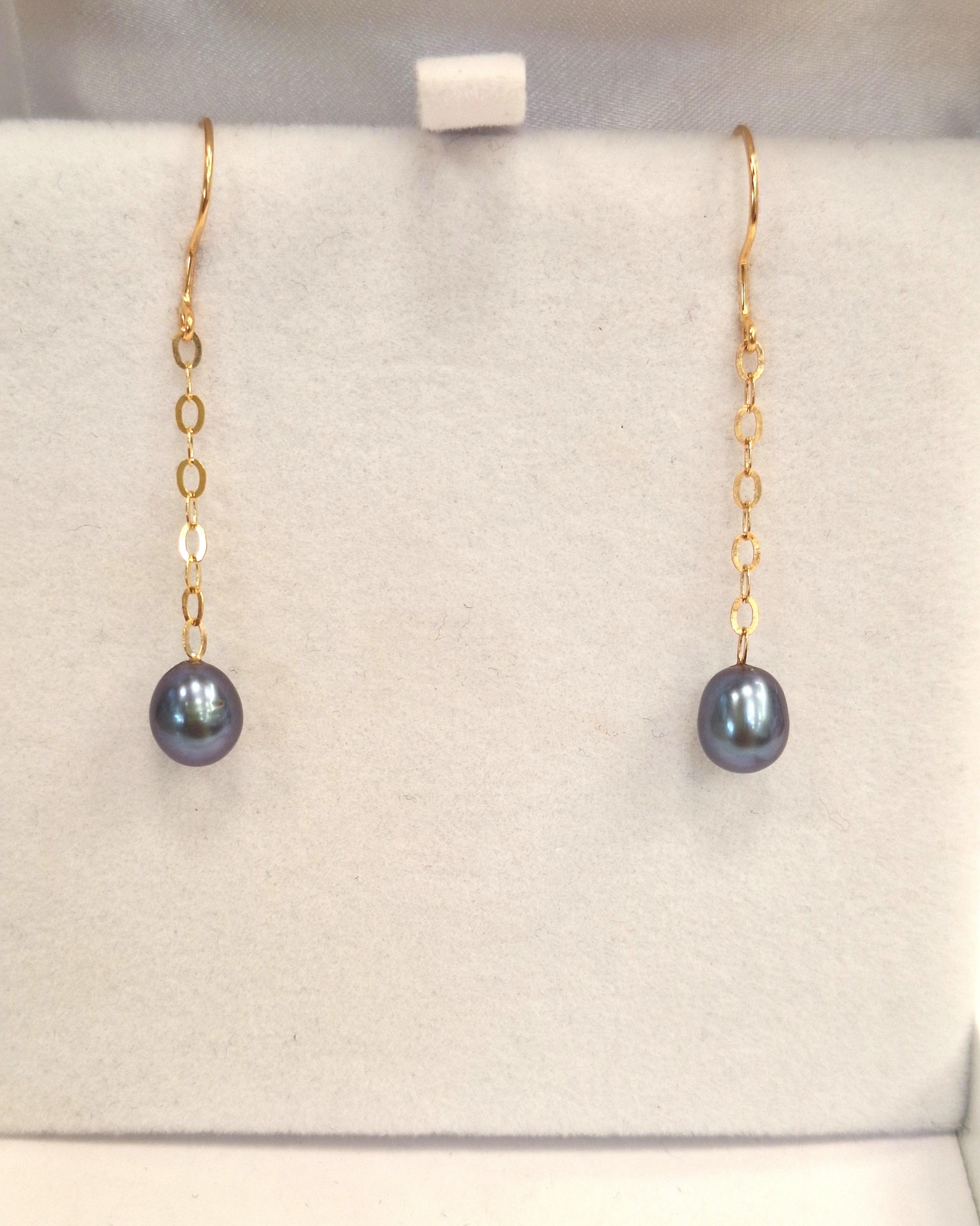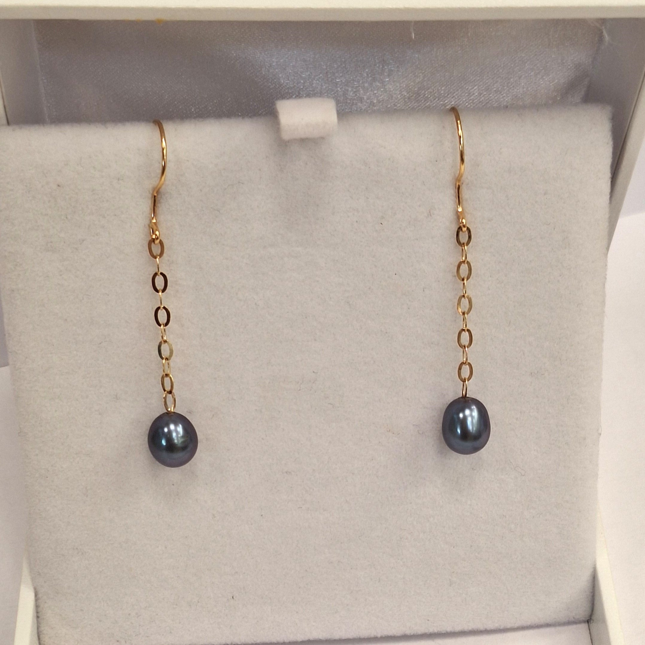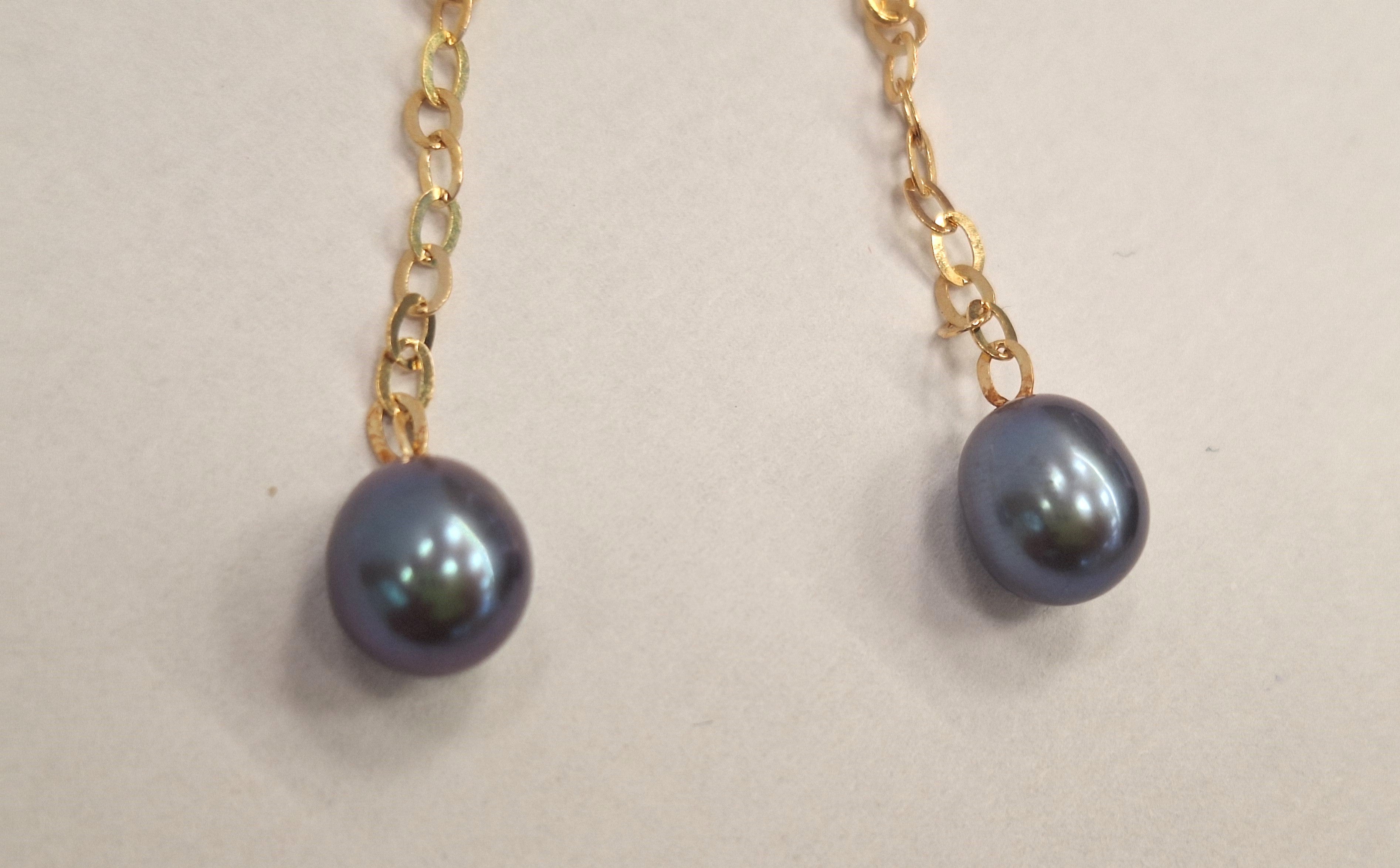 Très jolie boucle d'oreilles pendante (crochet) en or jaune 18 carats sertie de deux perles de culture bleutées en forme de goutte