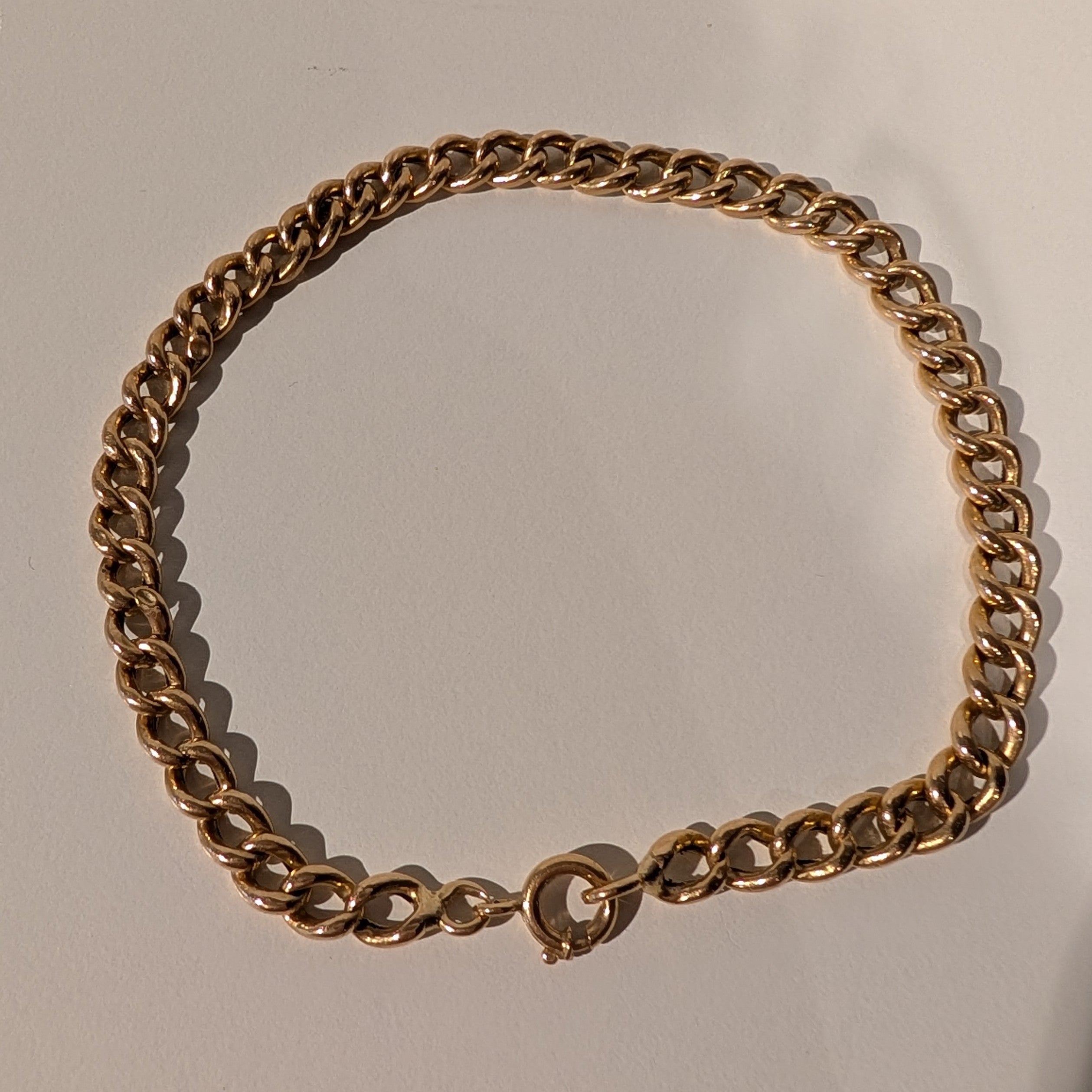 Bracelet gourmette en or jaune 18 carats (750/1000). Pesant 6,63 grammes et mesurant 23 cm de longueur, il se distingue par sa largeur de 0,5 cm et son épaisseur de 0,1 cm, qui apportent un équilibre parfait entre raffinement et présence. Doté d’un fermoir anneau ressort pratique, ce bracelet en bon état est idéal pour une utilisation quotidienne.