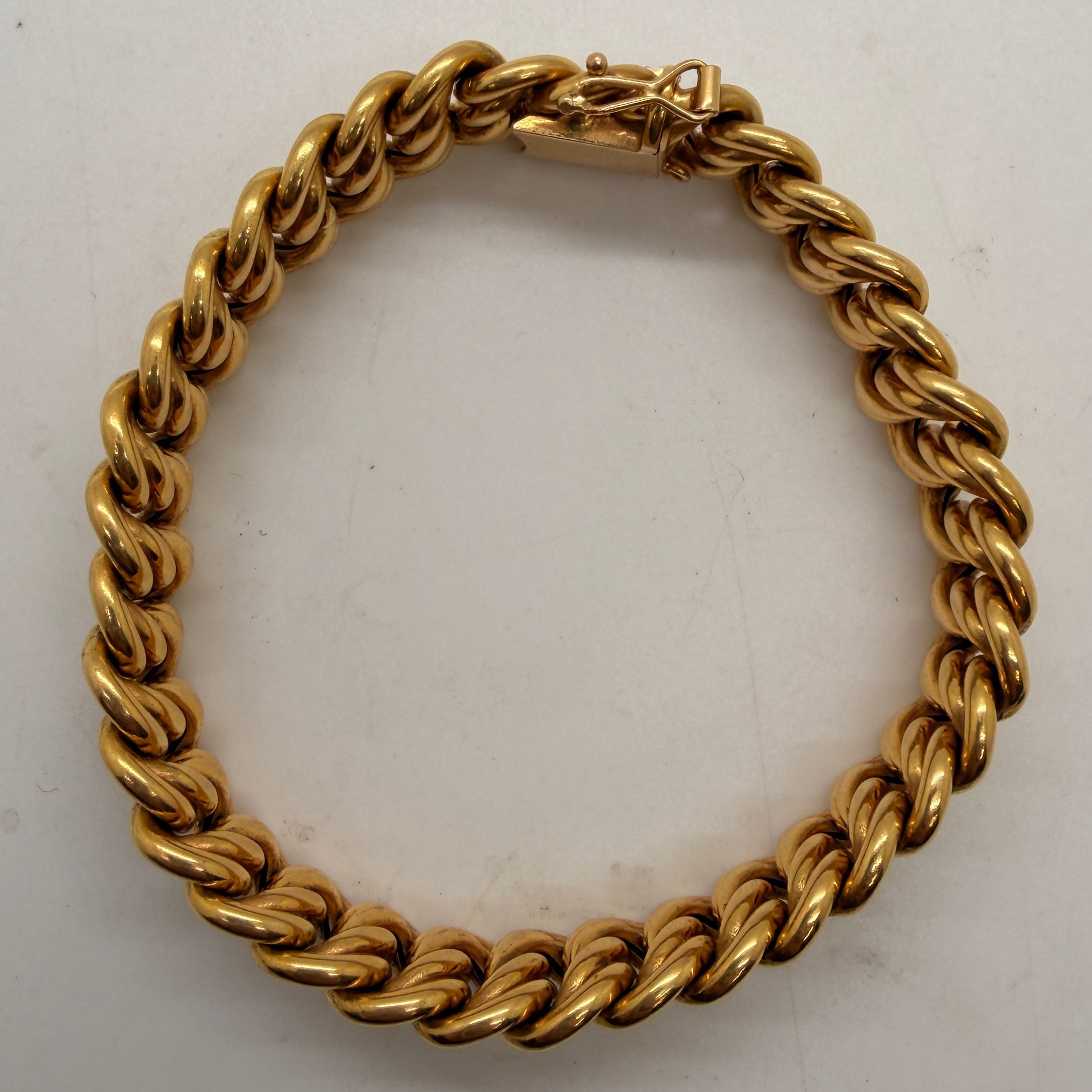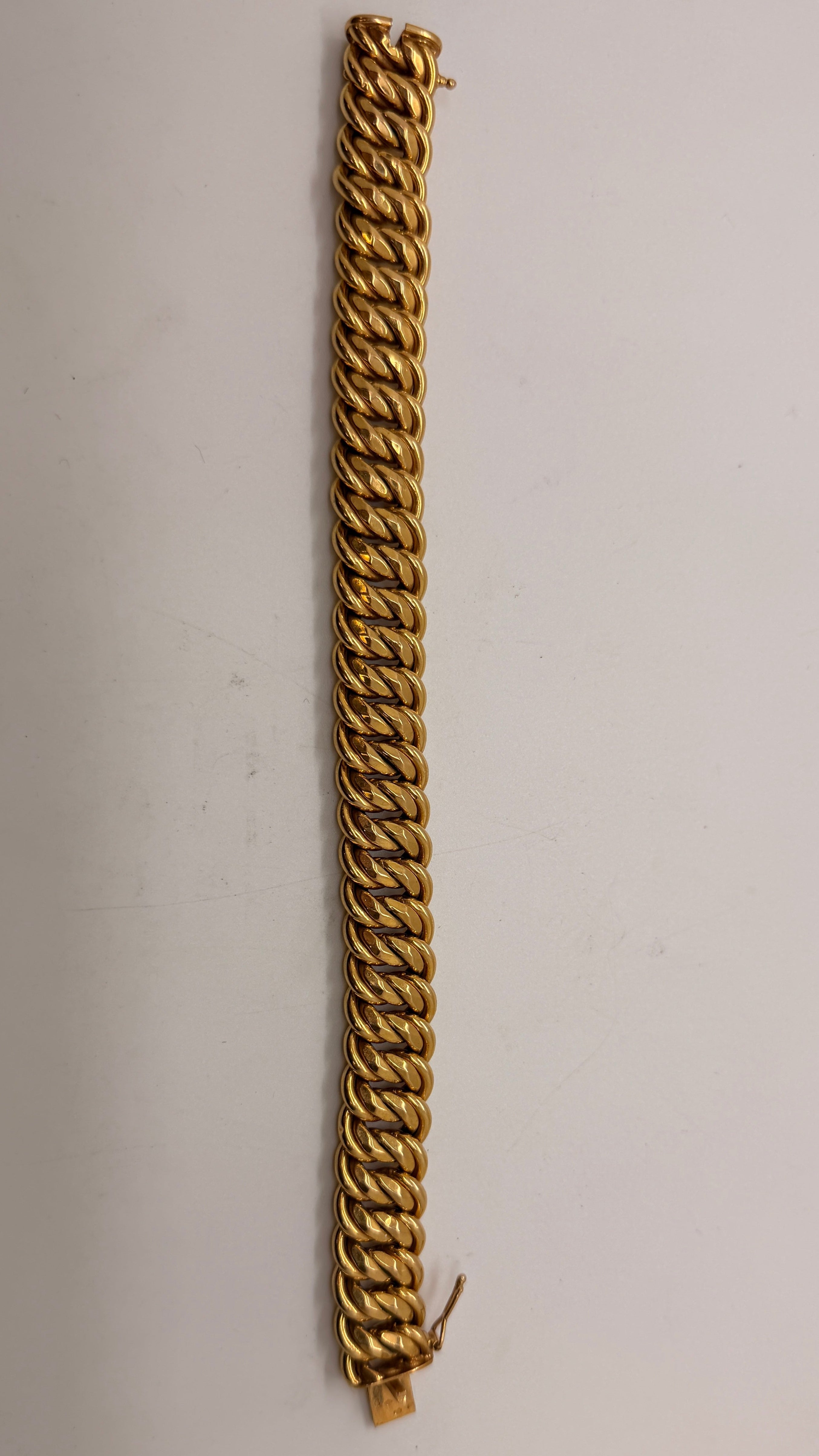Bracelet gourmette maille américaine en or jaune 750/1000 (18 carats), poinçon Tête d’Aigle, poids 28,56 g. Dimensions : 21 cm de long, 1,5 cm de large, 4 mm d’épaisseur. Fermoir à cliquet sécurisé. En très bon état.