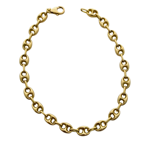 Ce bracelet en or jaune 18 carats, avec sa maille grain de café, incarne à la fois élégance et solidité. Son poids de 9,96 g, son poinçon 750 et son fermoir mousqueton en font un bijou aussi raffiné que pratique.
