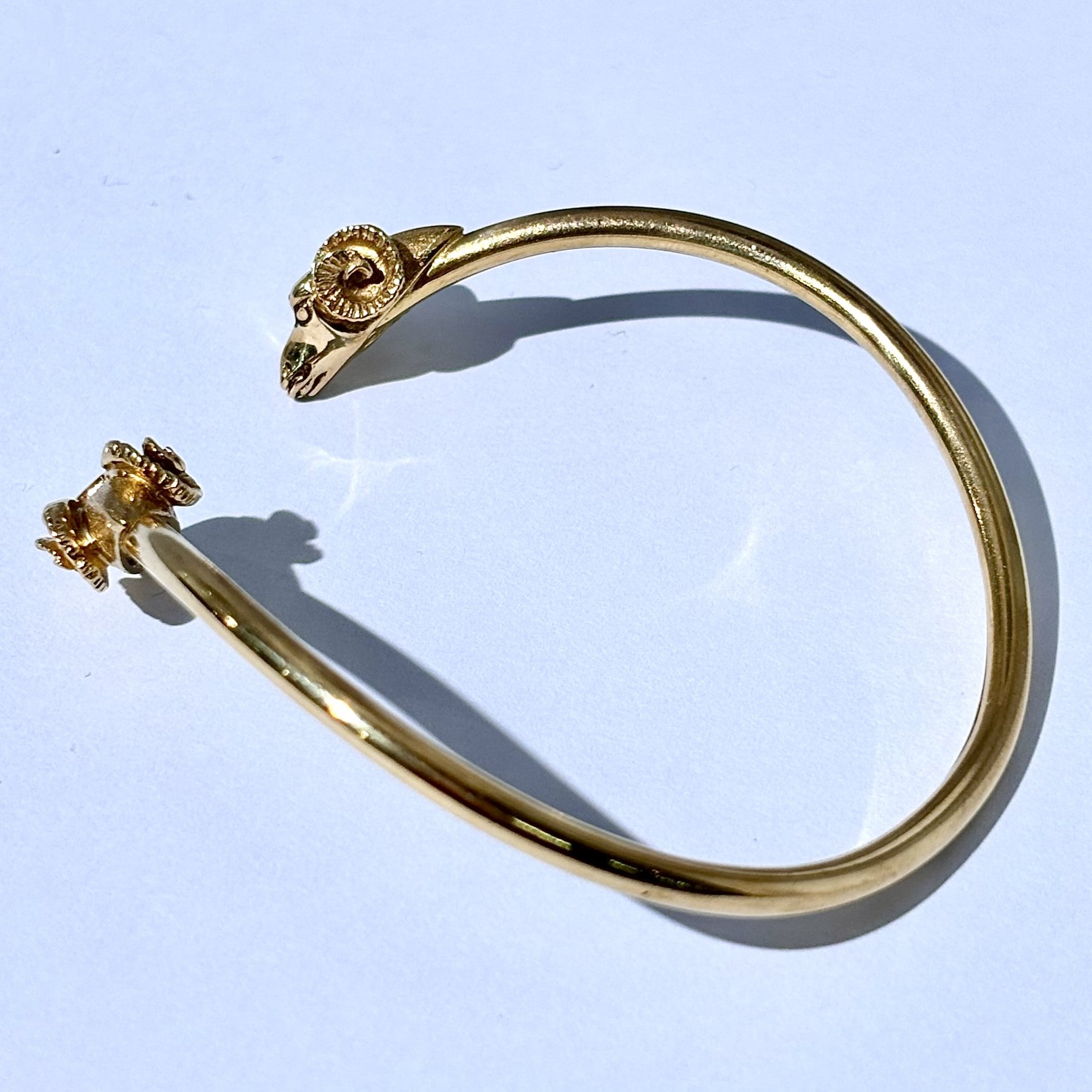 Ce jonc ouvert en or, finement malléable, s’orne de têtes de béliers majestueuses, symbole de puissance et de protection, fusionnant élégance et caractère dans un bijou d’exception.
