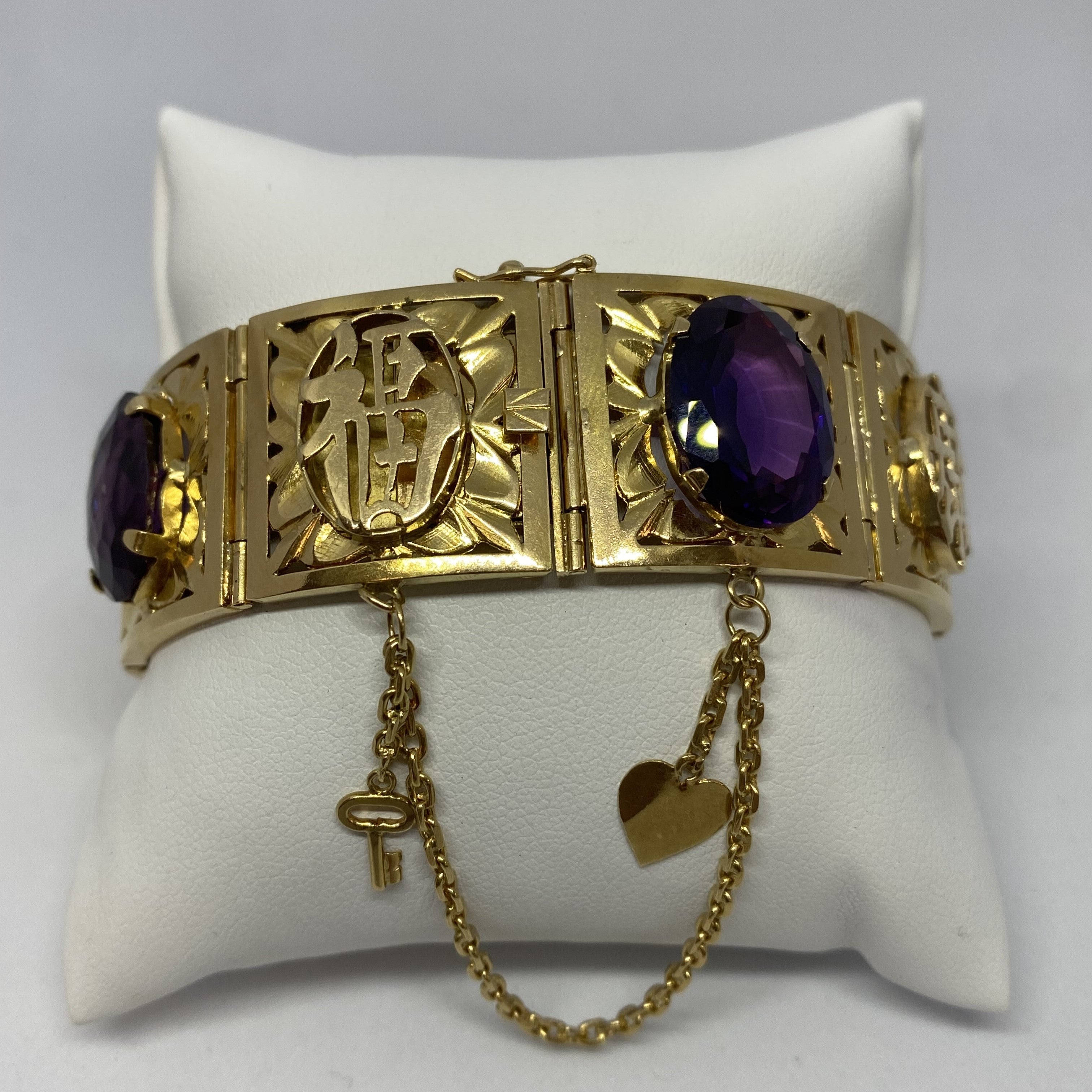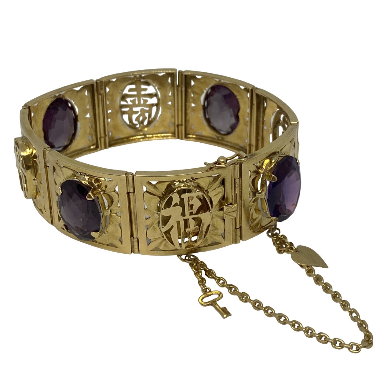 Très joli bracelet articulé en or 18k avec ces symboles chinois en relief et ces magnifiques améthystes