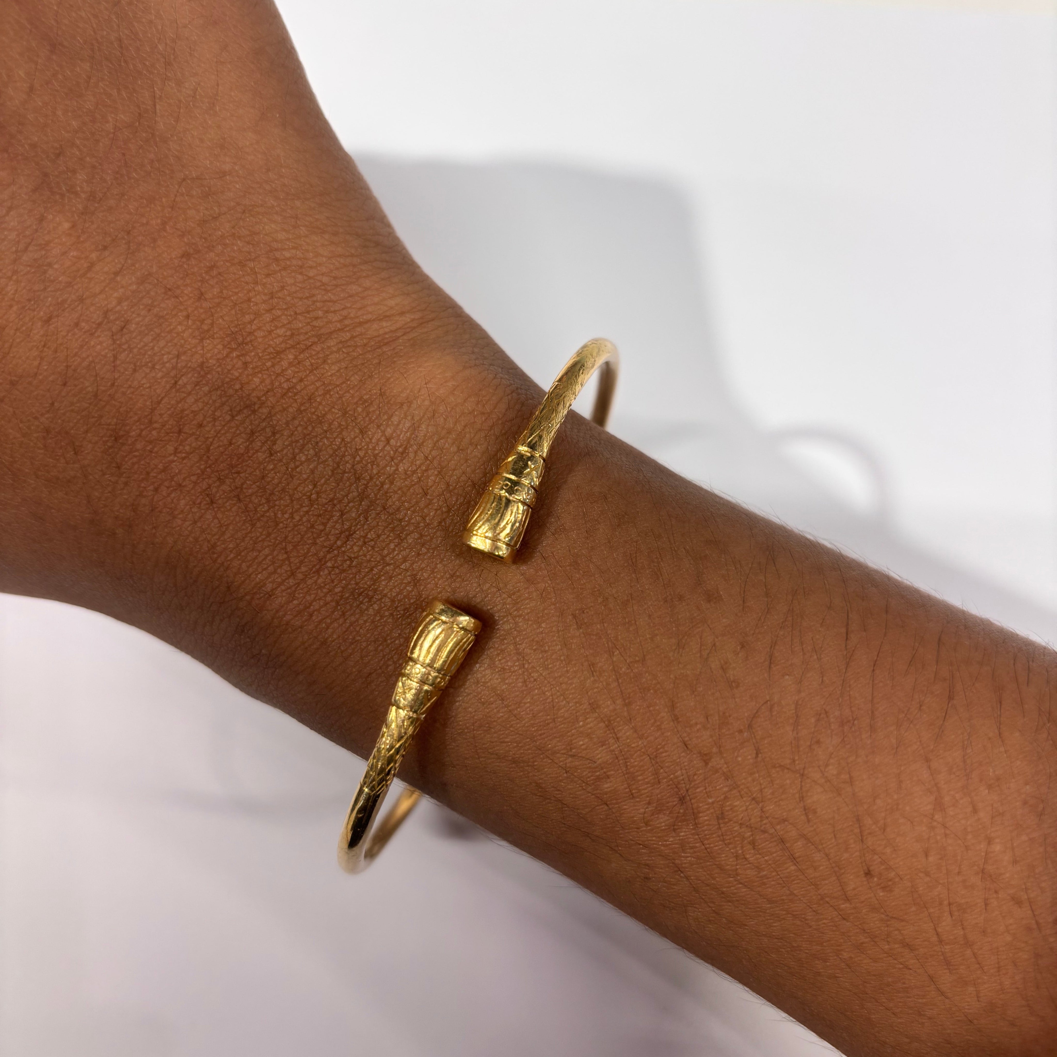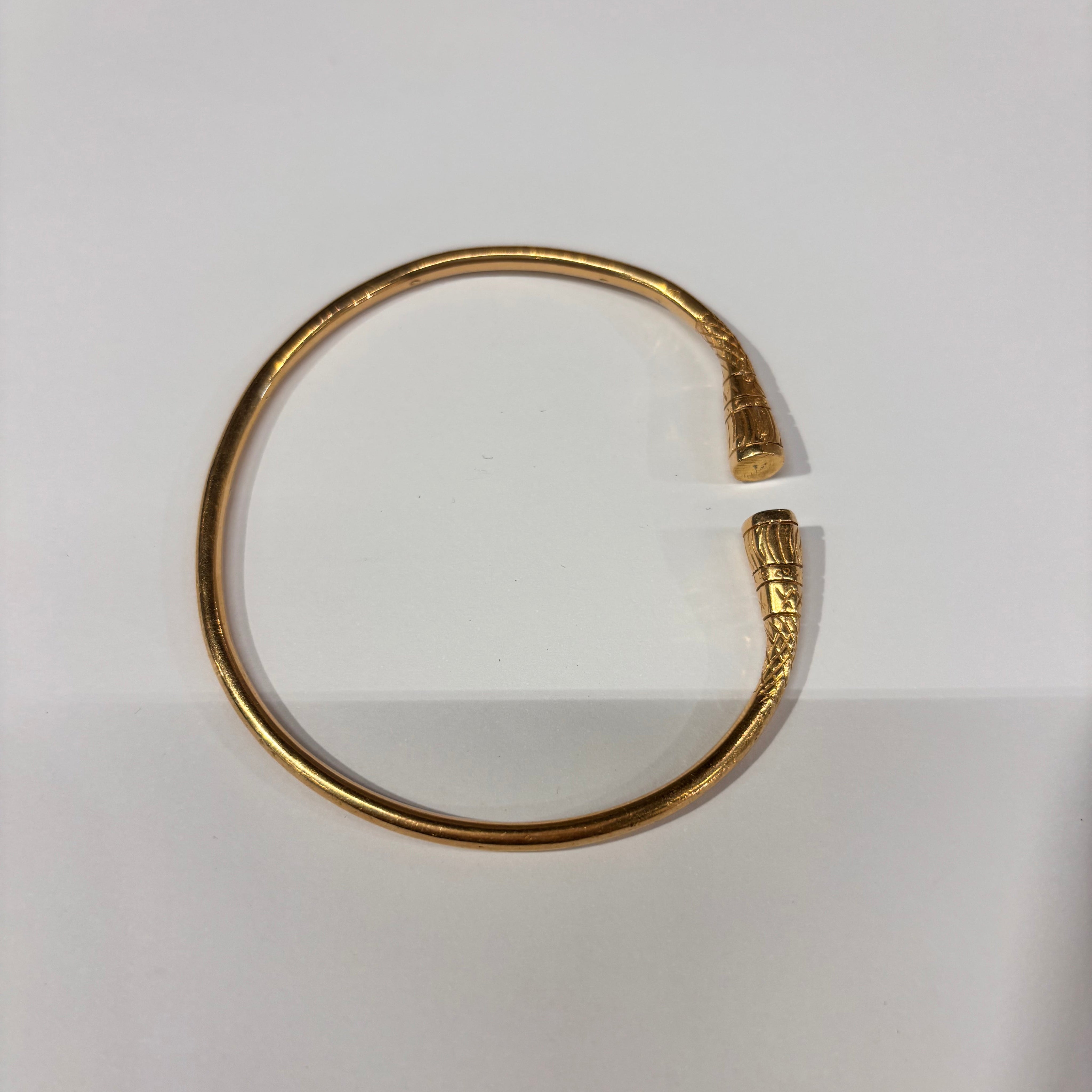 Bracelet de type jonc en or jaune 18 carats (750/1000), sans poinçon, d’un poids de 28,57 grammes. Il présente une structure rigide sans fermoir, avec une longueur de 6 cm, une largeur de 7,5 cm et une épaisseur de 0,3 mm. Ce modèle épuré, sans pierres, est proposé en très bon état.