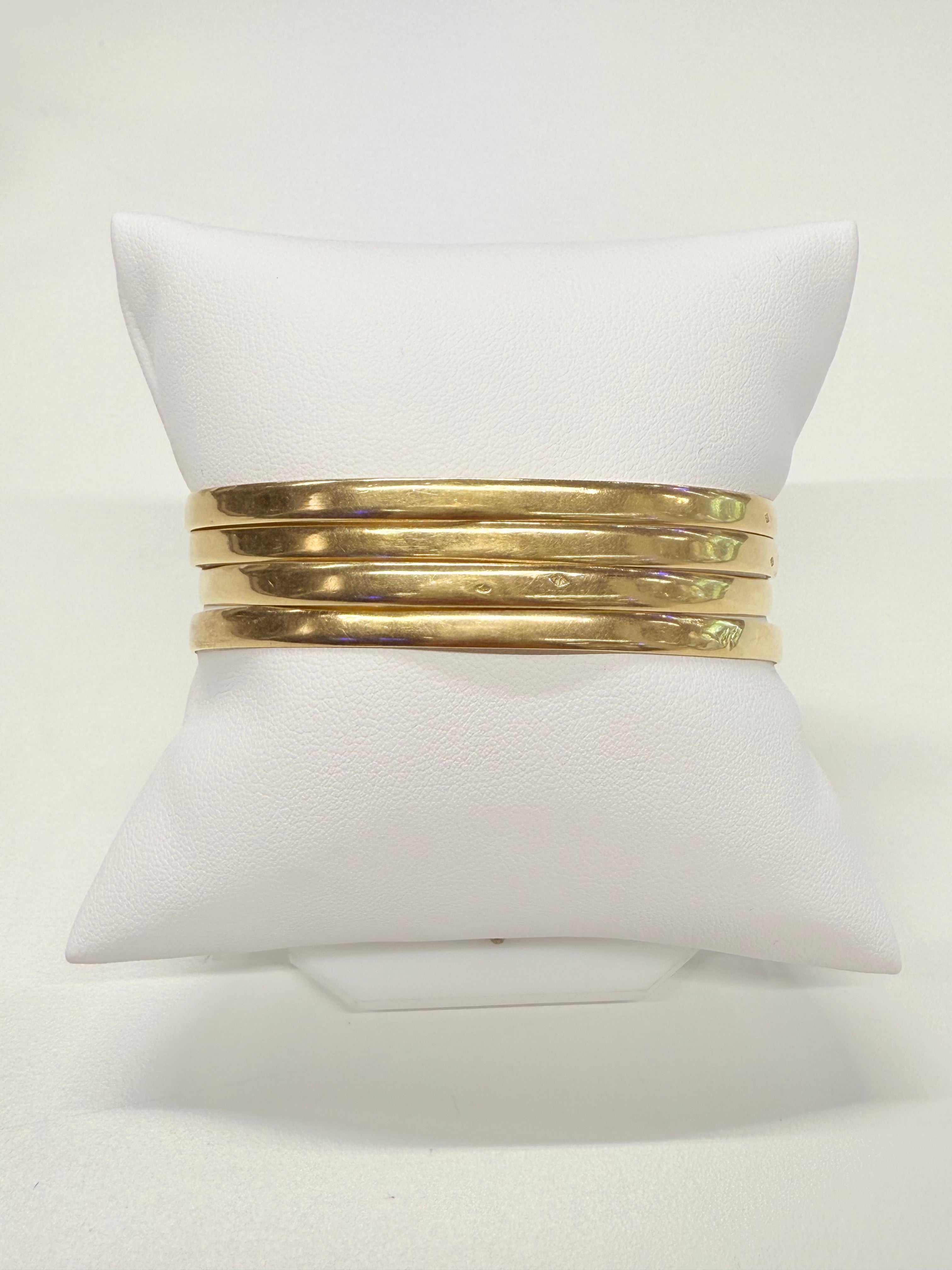 Ensemble de 4 joncs en or jaune 18 carats (750/1000), poinçonnés Tête d’Aigle. Chacun a un diamètre de 6,5 cm, une largeur fine de 0,4 cm et une épaisseur de 0,1 cm. Avec un poids total impressionnant de 37,11 grammes, ces joncs affichent une élégance classique et un confort de port unique. Bien qu’ils soient en très bon état, ils présentent une légère ovalisation, ajoutant une touche de caractère à leur charme. Idéals pour compléter votre look avec une touche de sophistication.