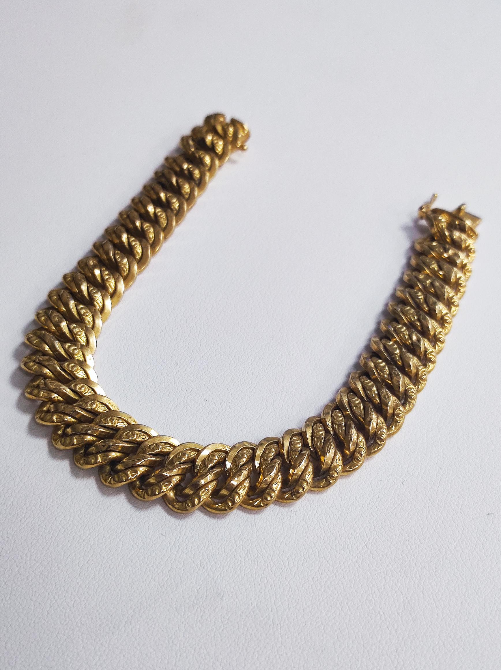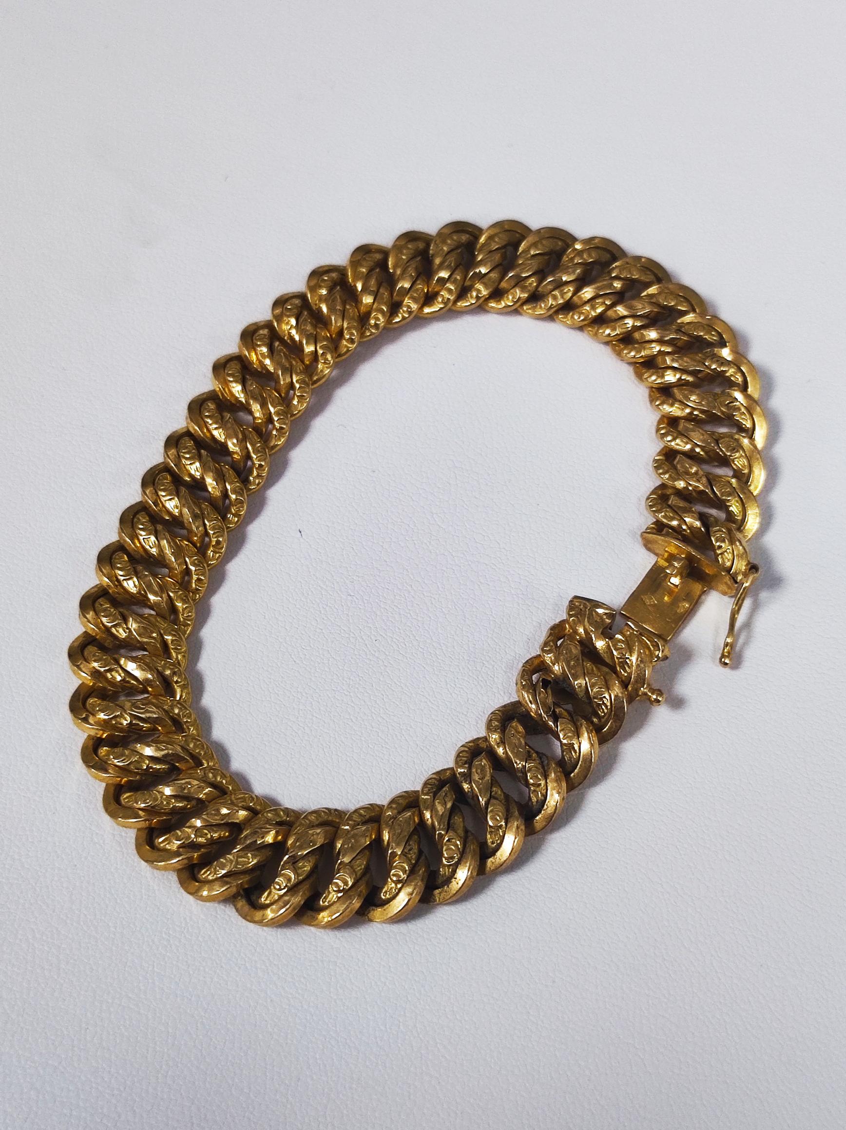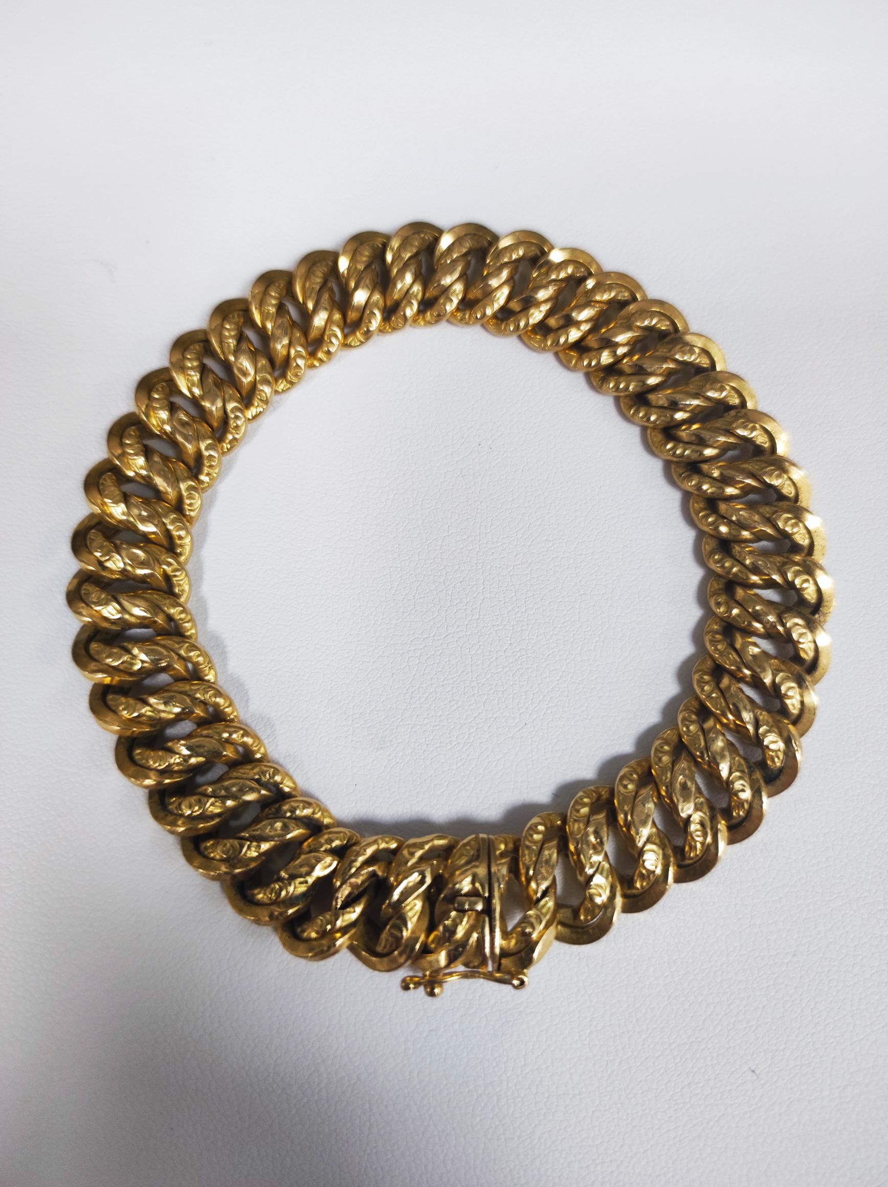 Bracelet à mailles américaine en or jaune 18 carats (750/1000), poinçonné 750 et Tête d’Aigle. Pesant 24,21 grammes, il mesure 21,5 cm de longueur avec une largeur de 1,3 cm et une épaisseur de 0,6 mm, offrant une présence élégante et robuste. Doté d’un fermoir à cliquet sécurisé, ce bracelet combine parfaitement solidité et raffinement.