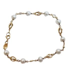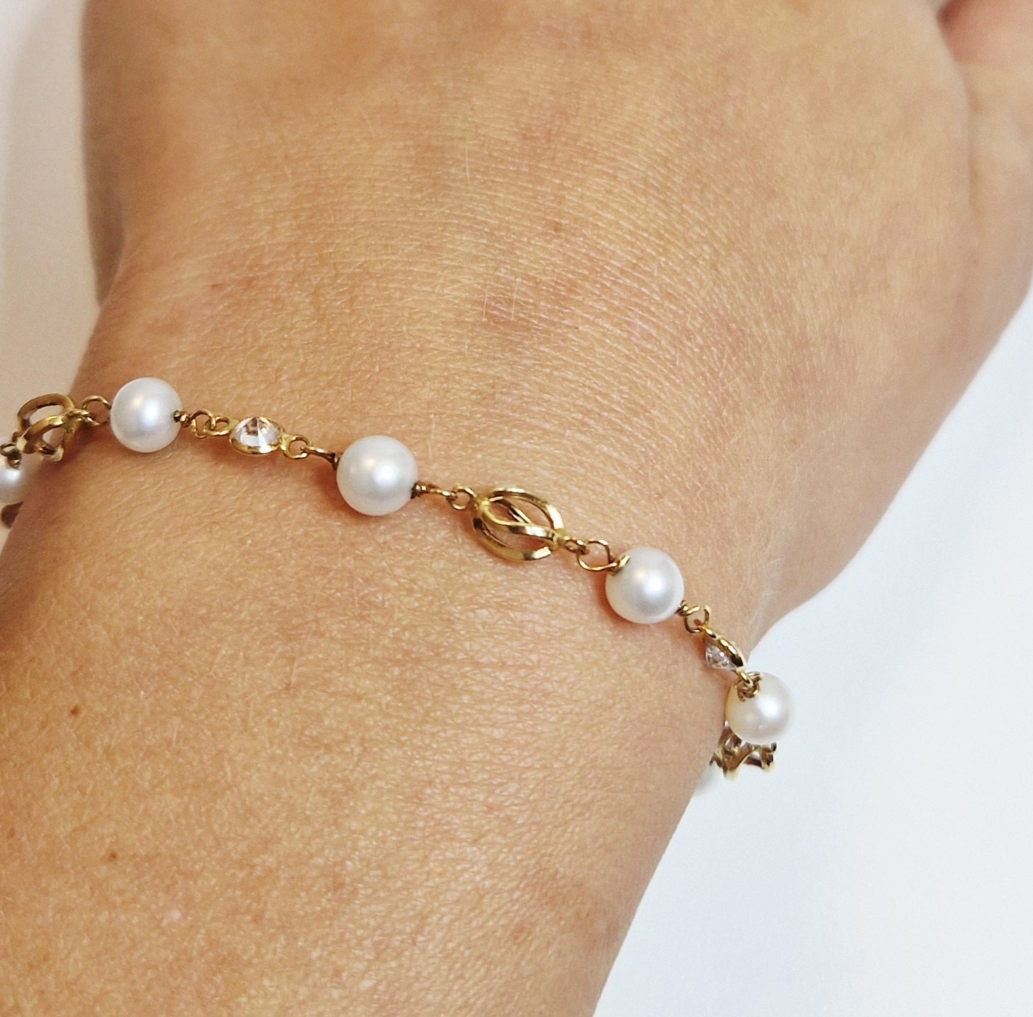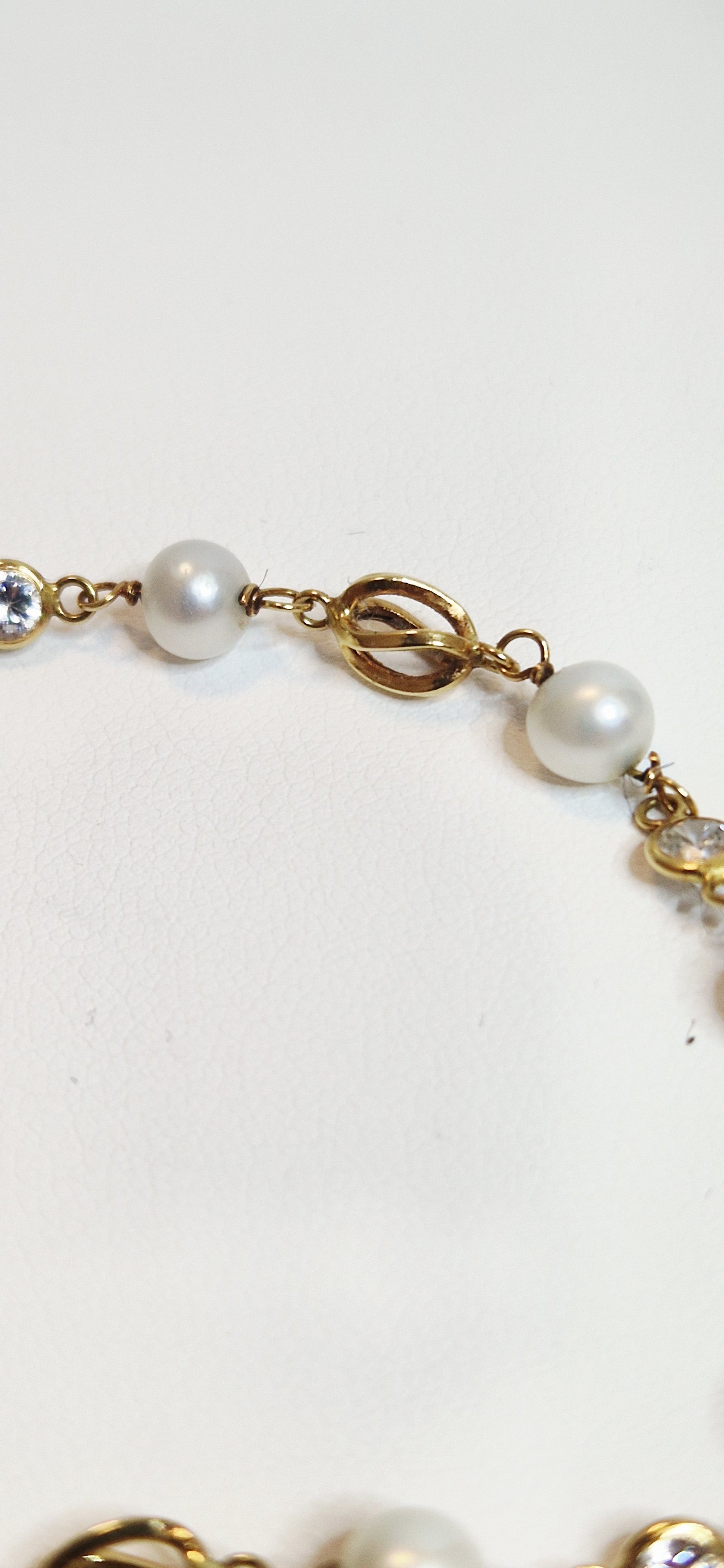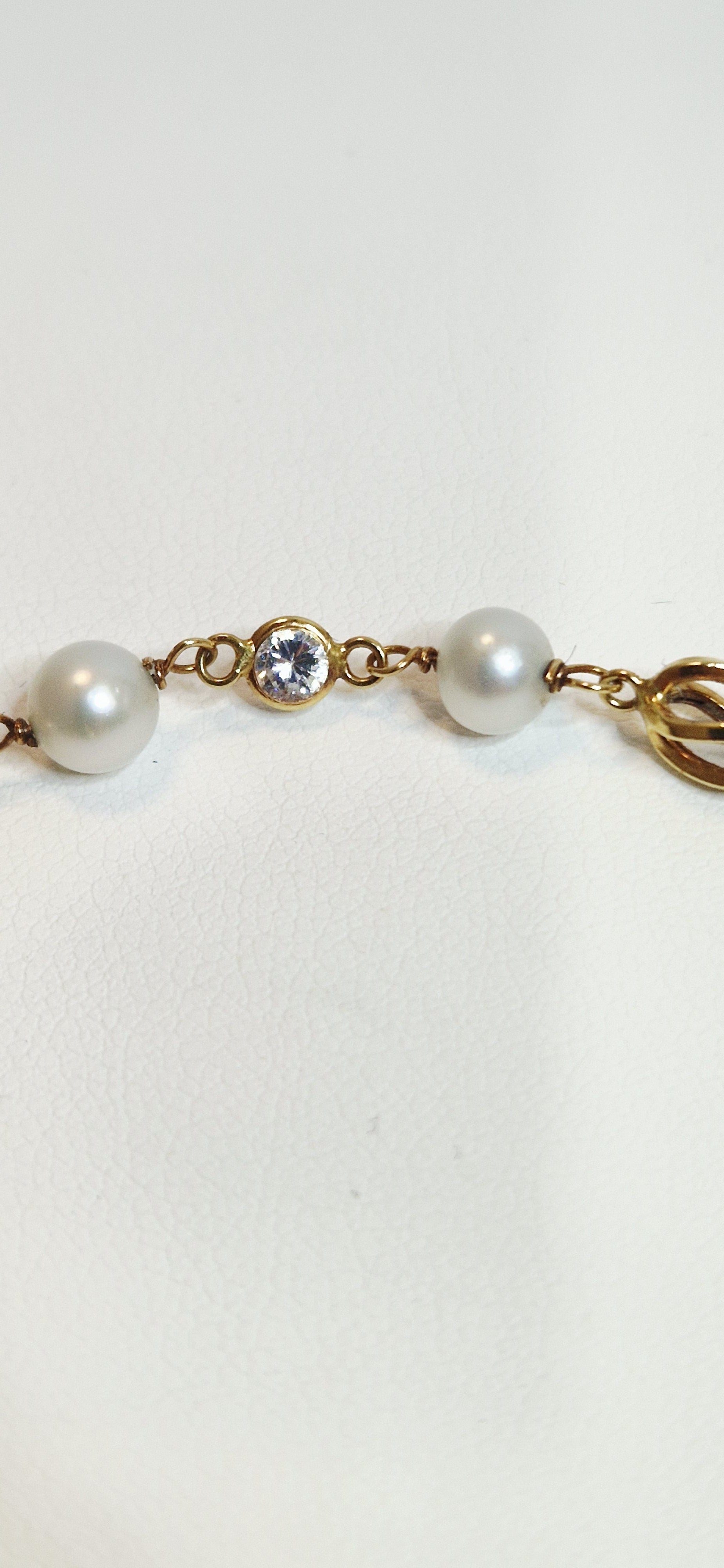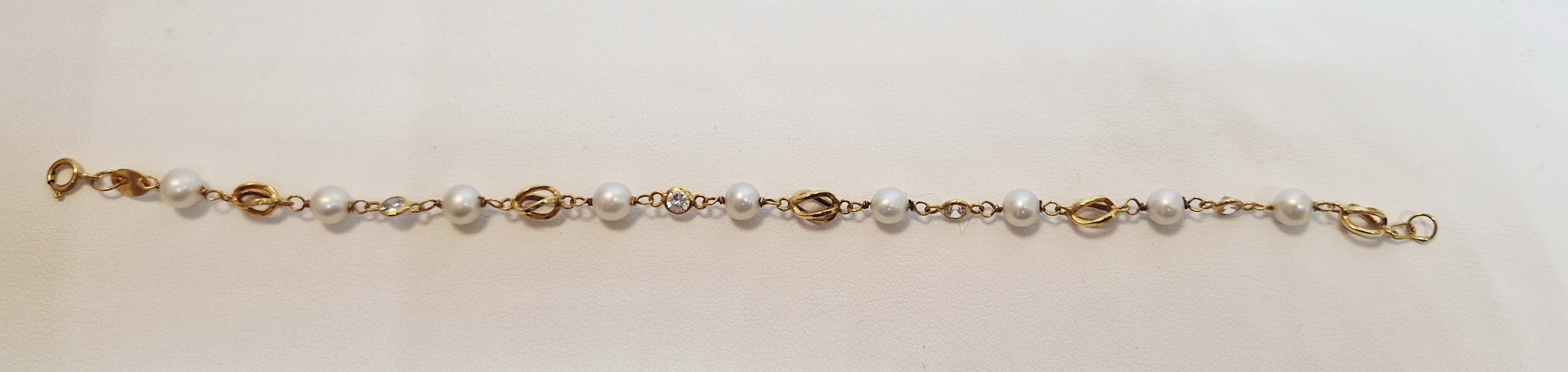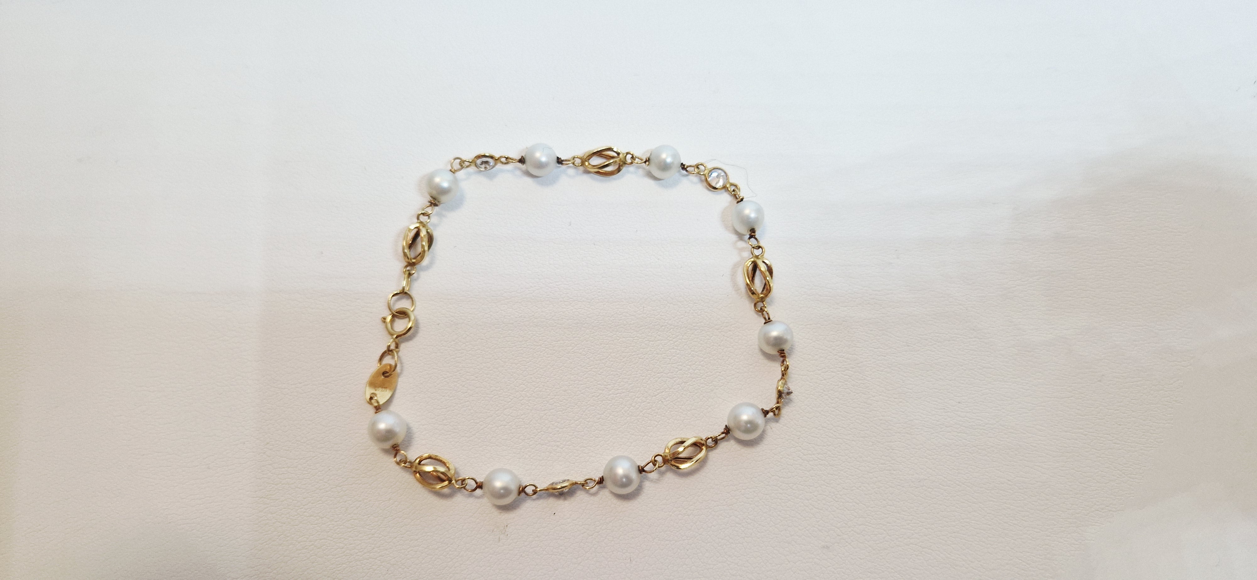 Bracelet à maillons en or jaune 18 carats (750/1000), poinçonné 750, pèse 3.83 grammes et mesure 19 cm de longueur. Il présente une maille fantaisie avec un fermoir à anneau ressort. Il est orné de 9 perles et de 4 zircons en oxyde de zirconium. Avec une largeur de 1.8 cm et une épaisseur de 2.35 cm, le bracelet est en bon état général.