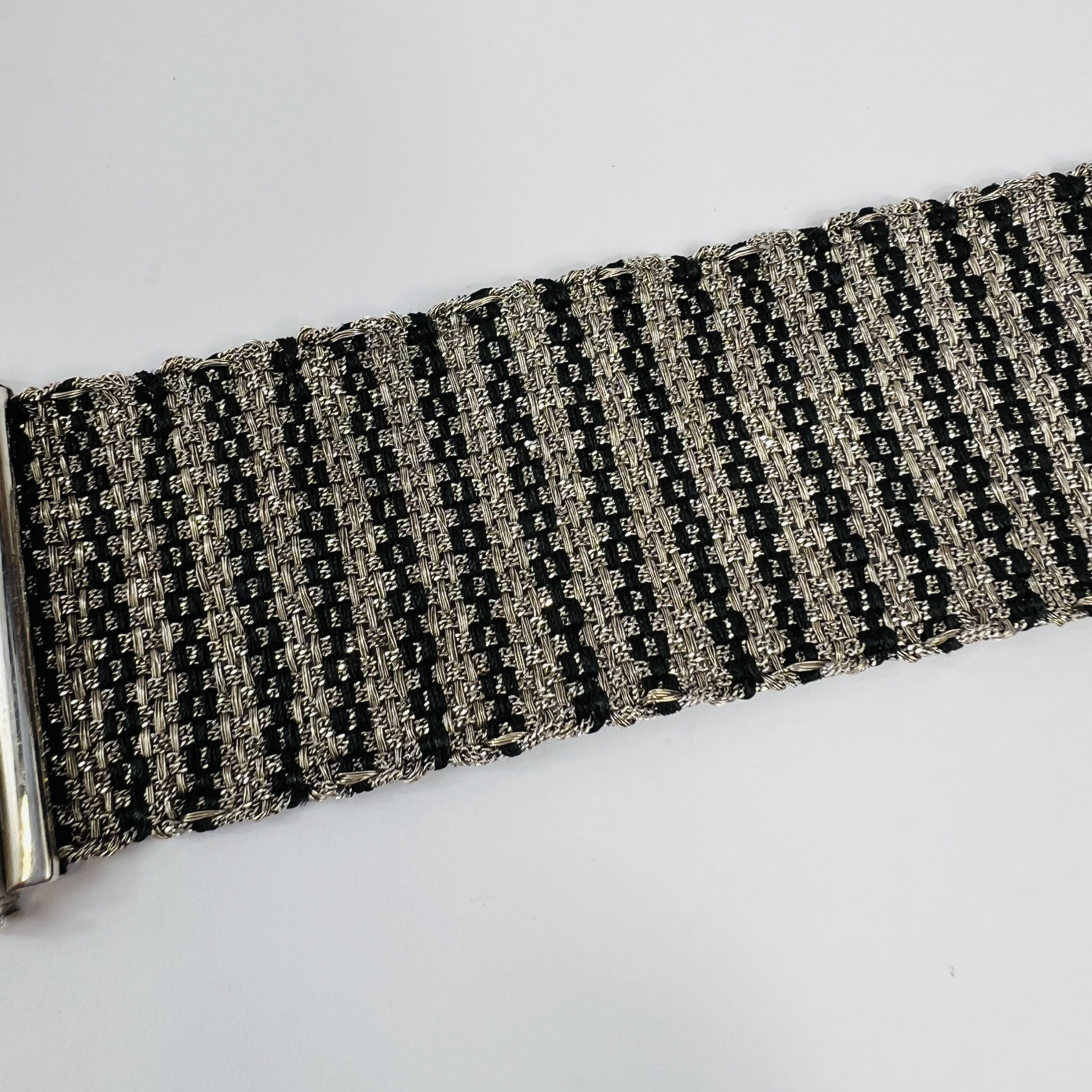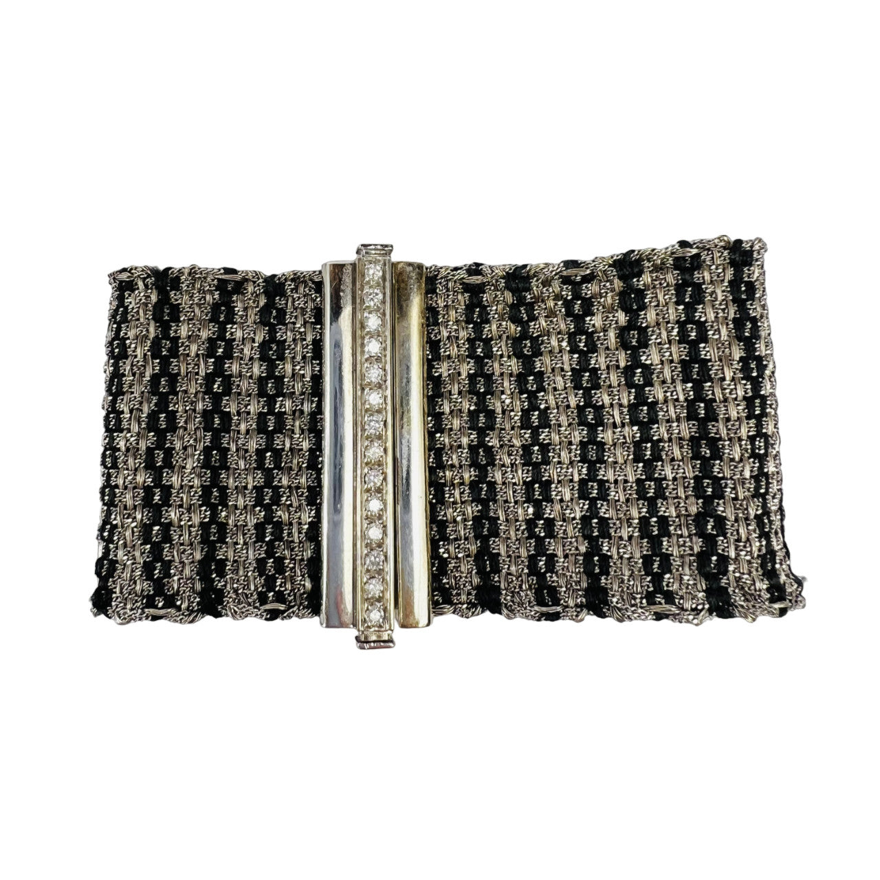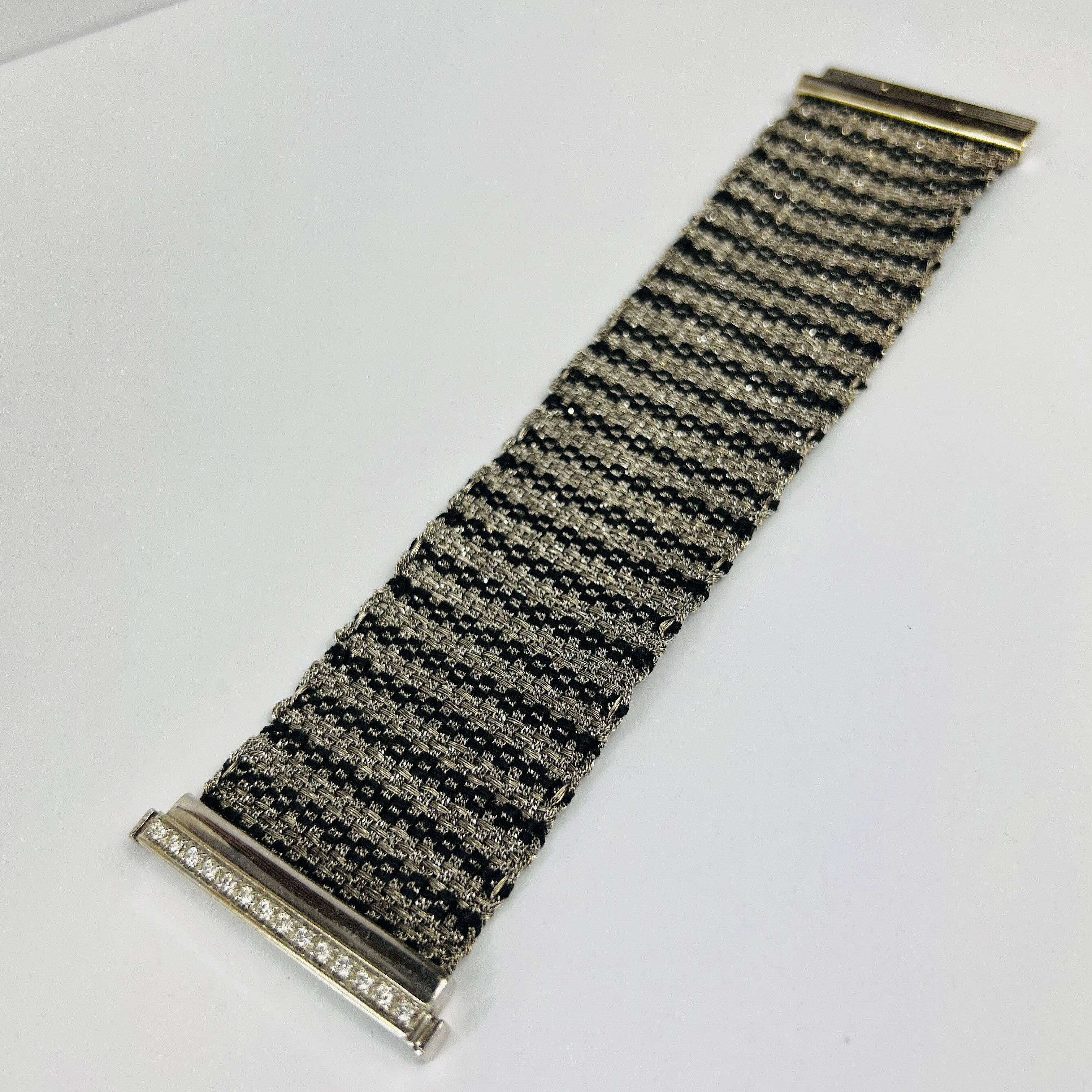 Magnifique bracelet manchette signé Carolina Bucci en or gris 750/1000 et soie noire non tissés. Le fermoir est serti d'une ligne de diamant brillantés.