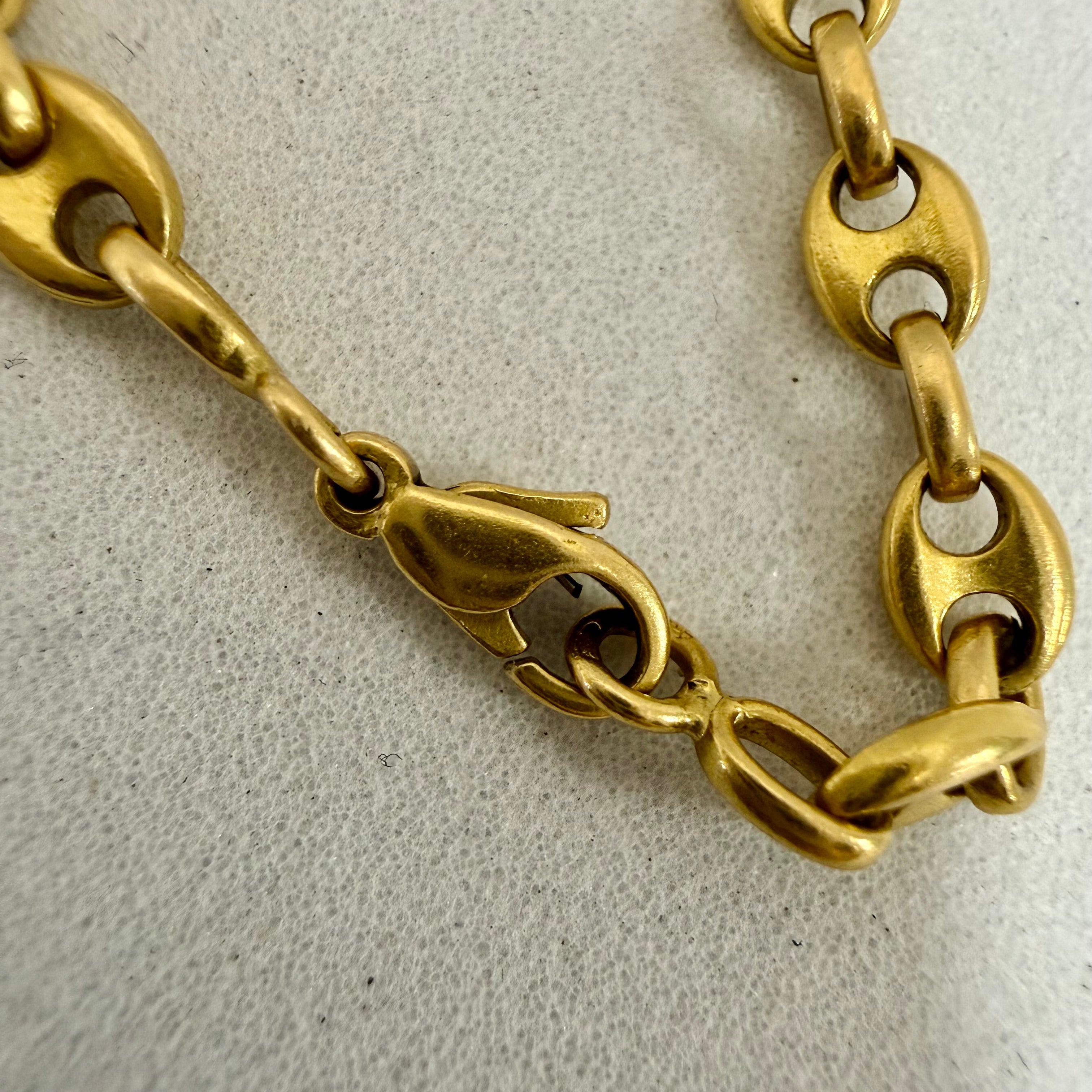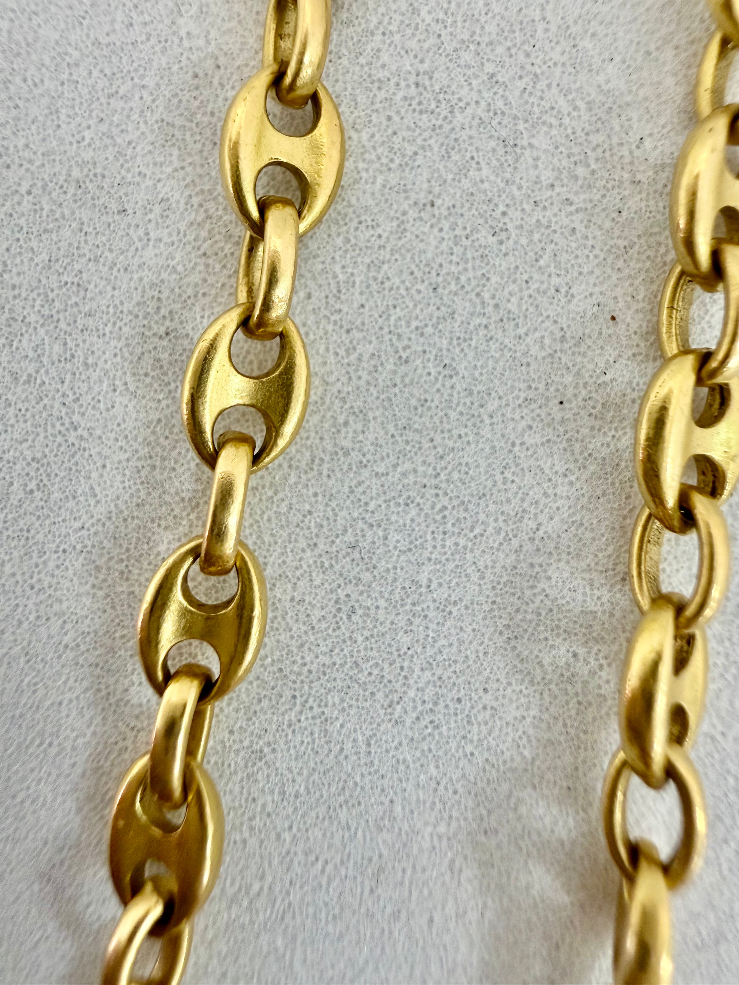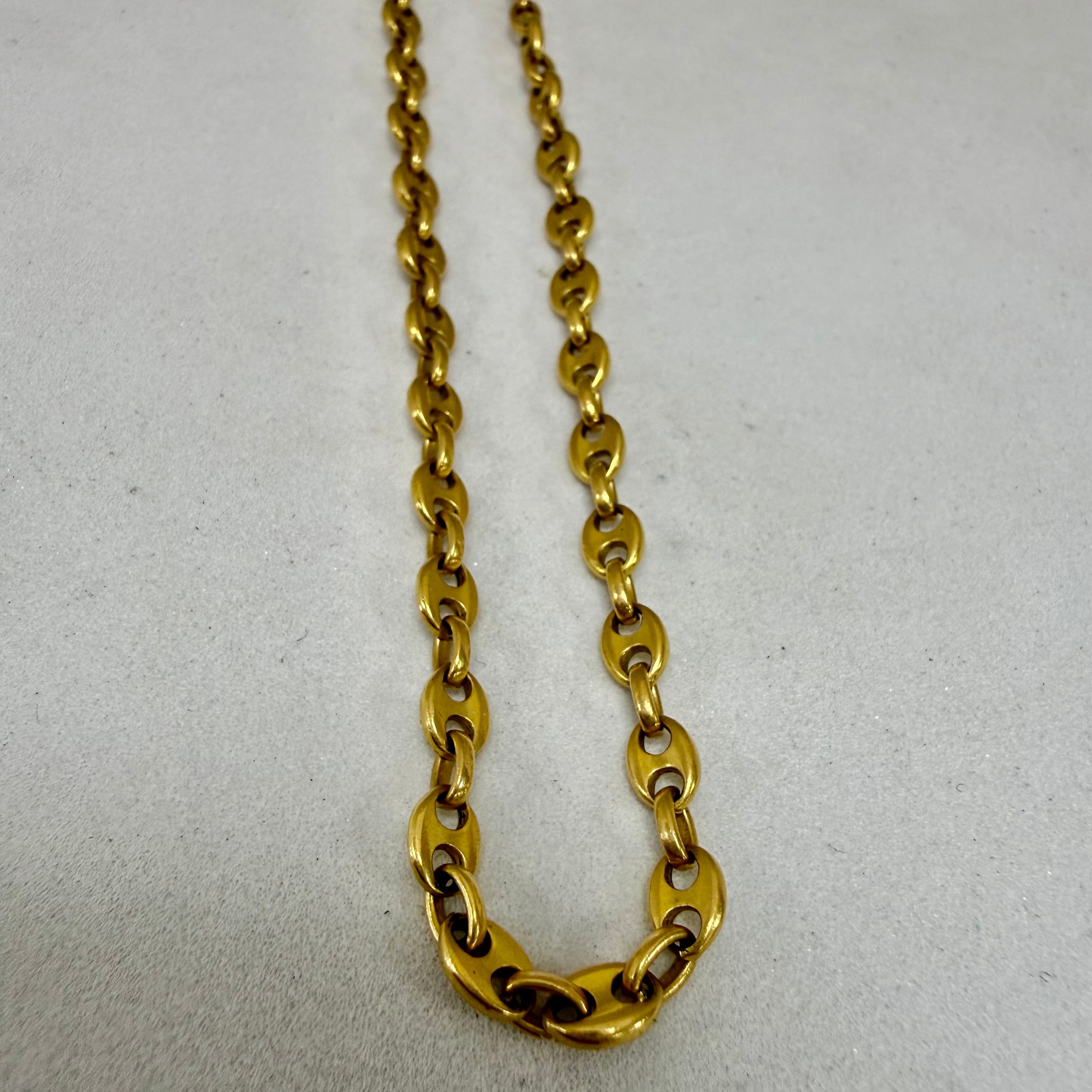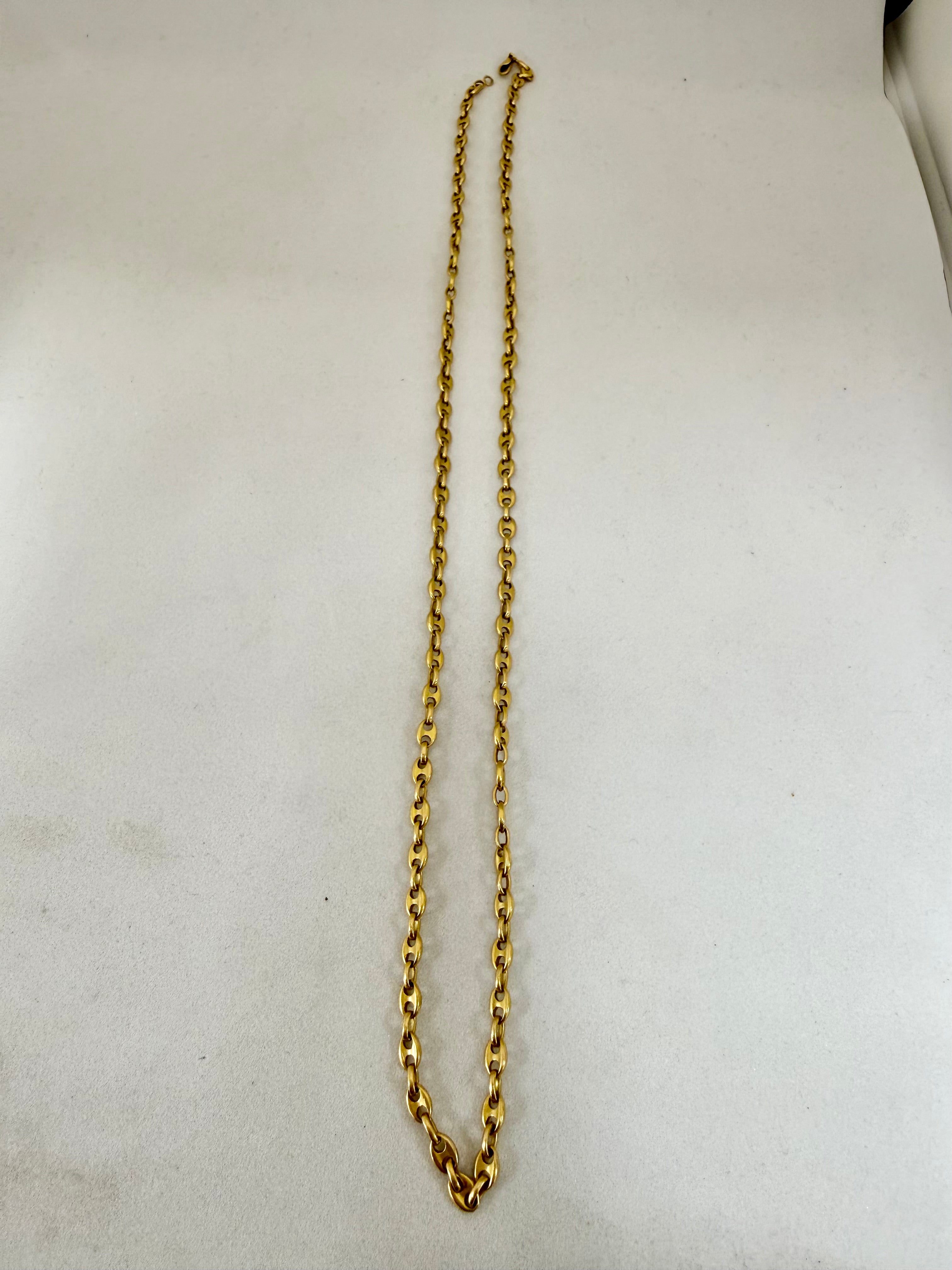 Chaîne longue en or jaune 750/1000 (poinçon tête d’aigle), au design maille grain de café, reconnaissable par ses maillons ovales entrelacés. Une pièce de caractère, à la fois élégante et robuste, idéale pour un port quotidien ou avec pendentif.