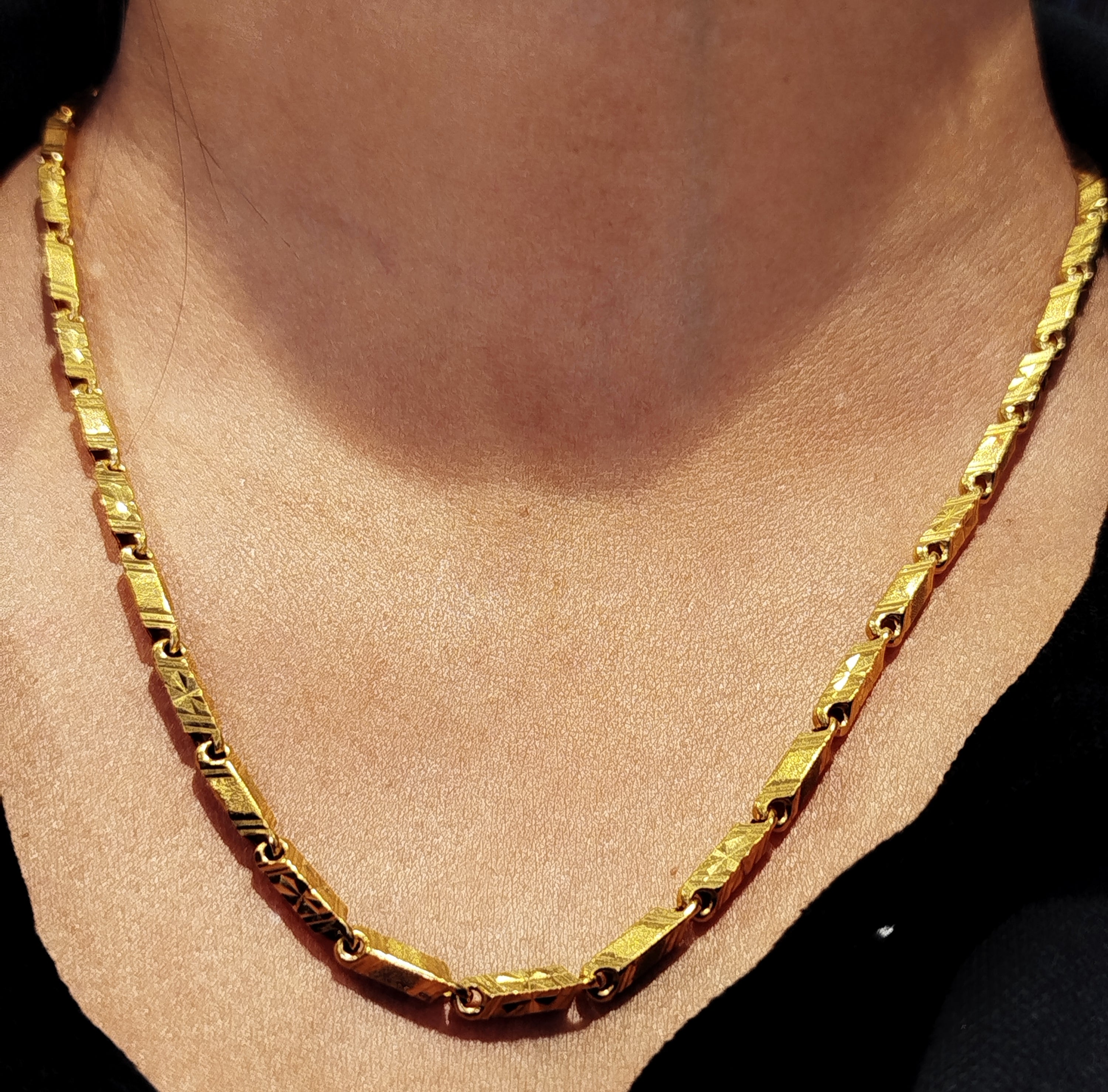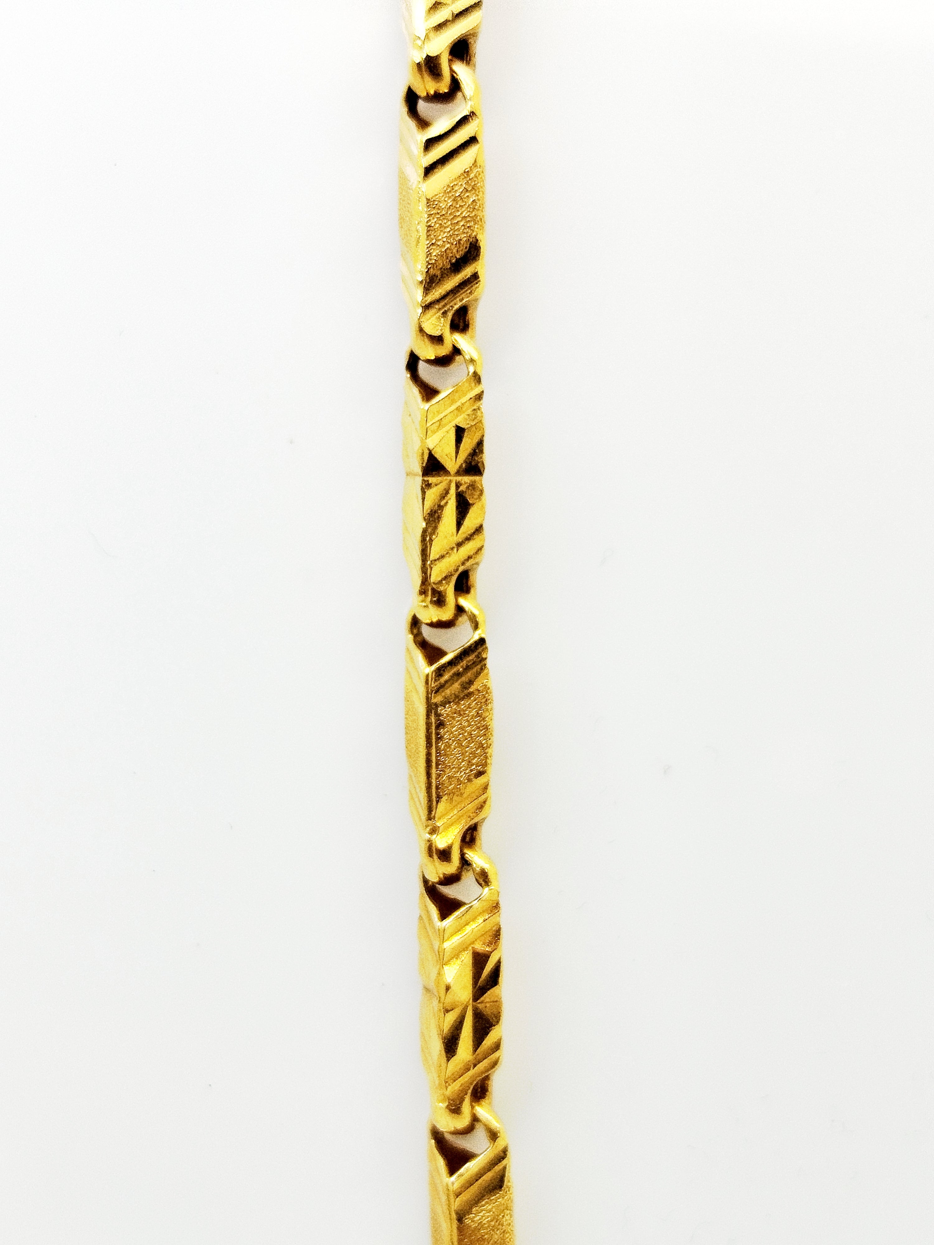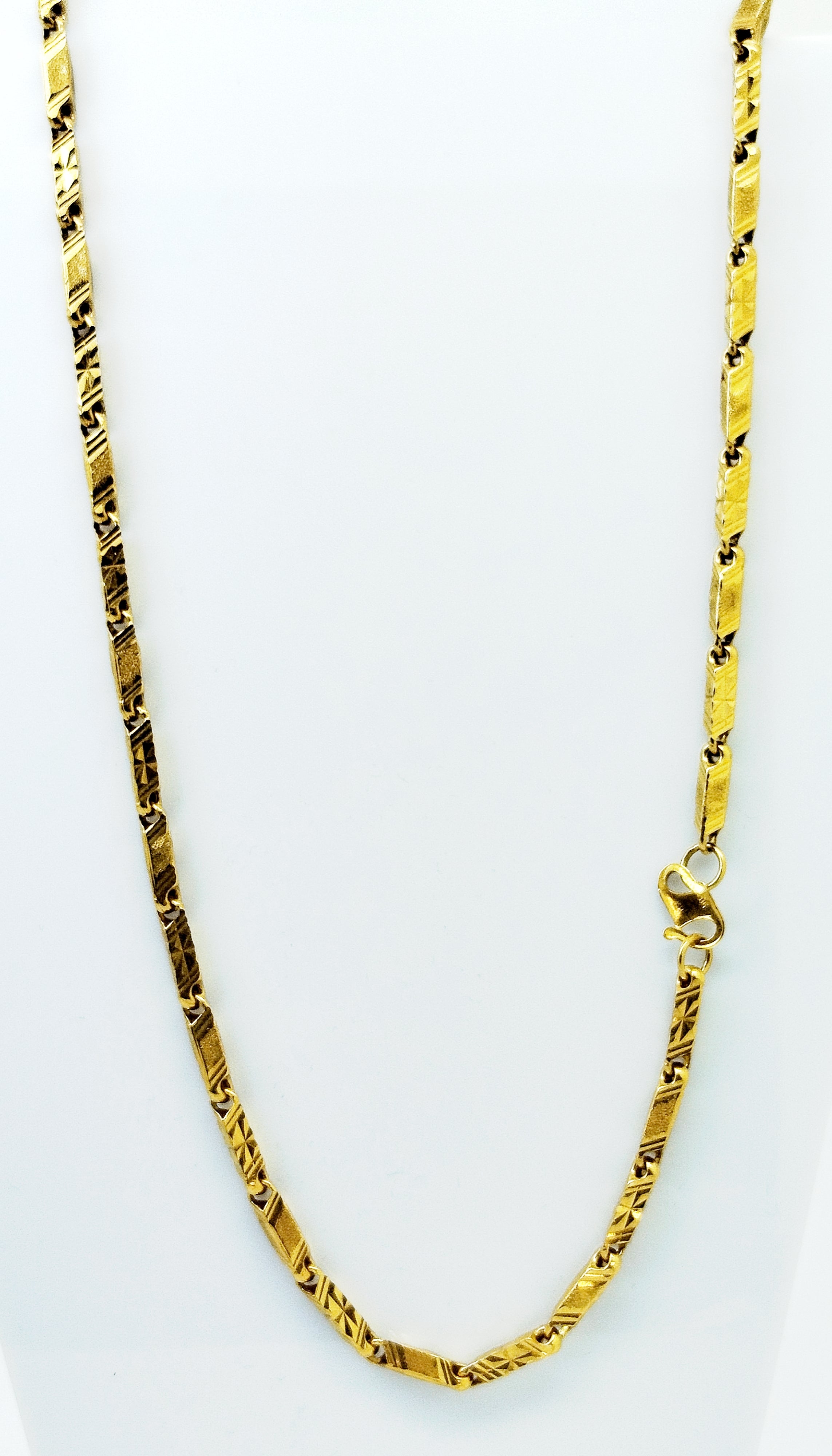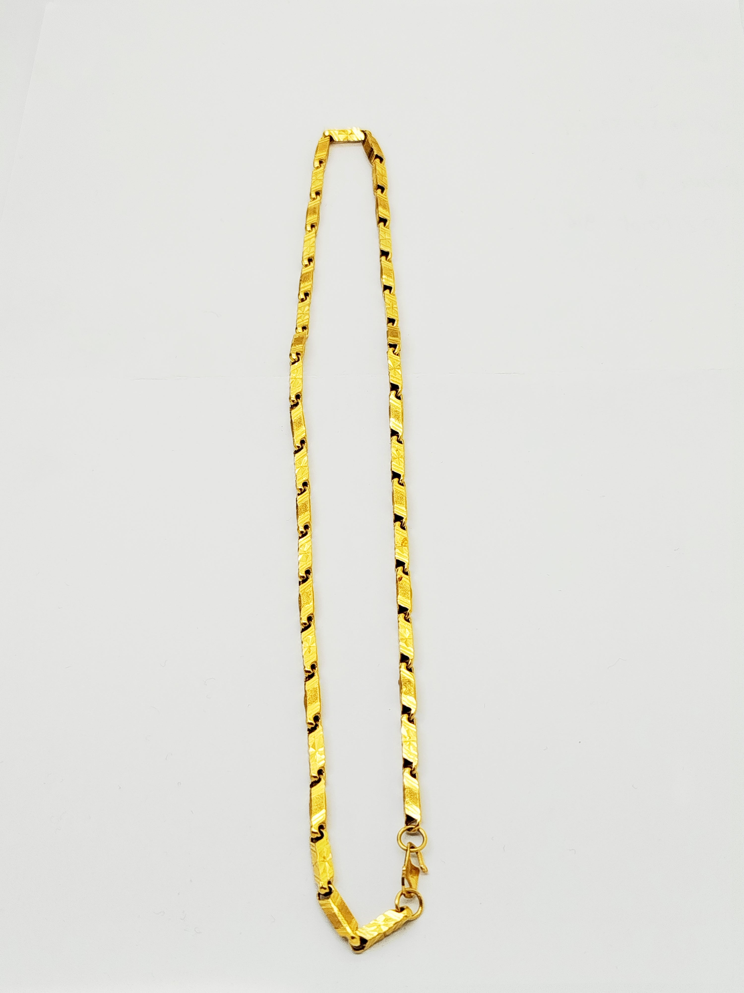 Un bijou élégant au design travaillé, sans pierres, doté d’un fermoir crochet S sécurisé. Longueur de 47 cm, largeur 0,4 cm, pour un poids de 21,48 g. Poinçon 21K, en très bon état.