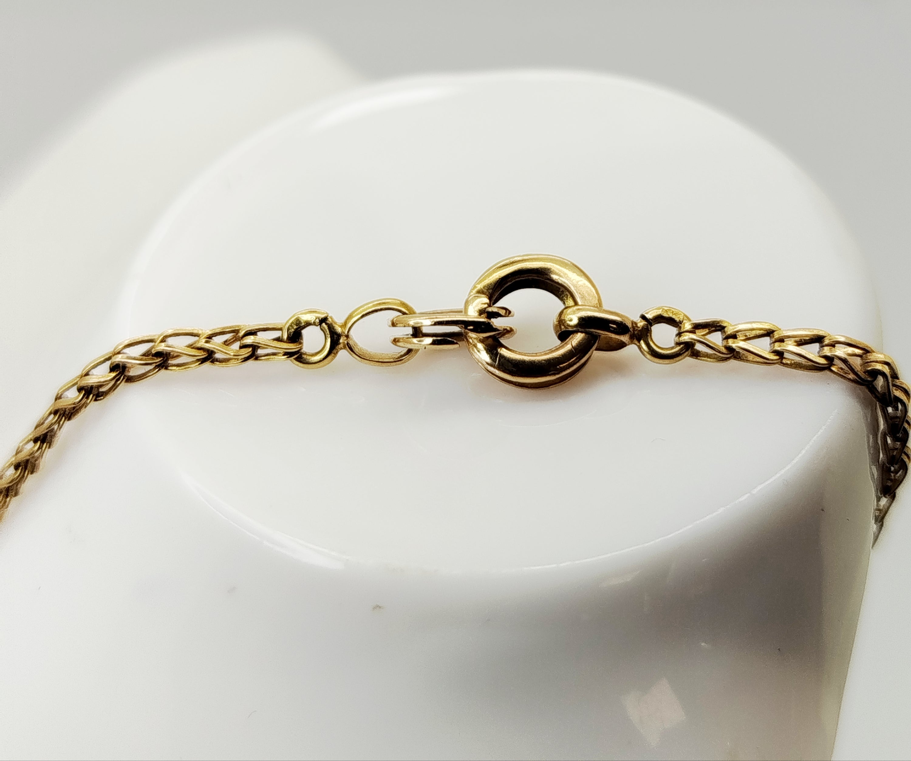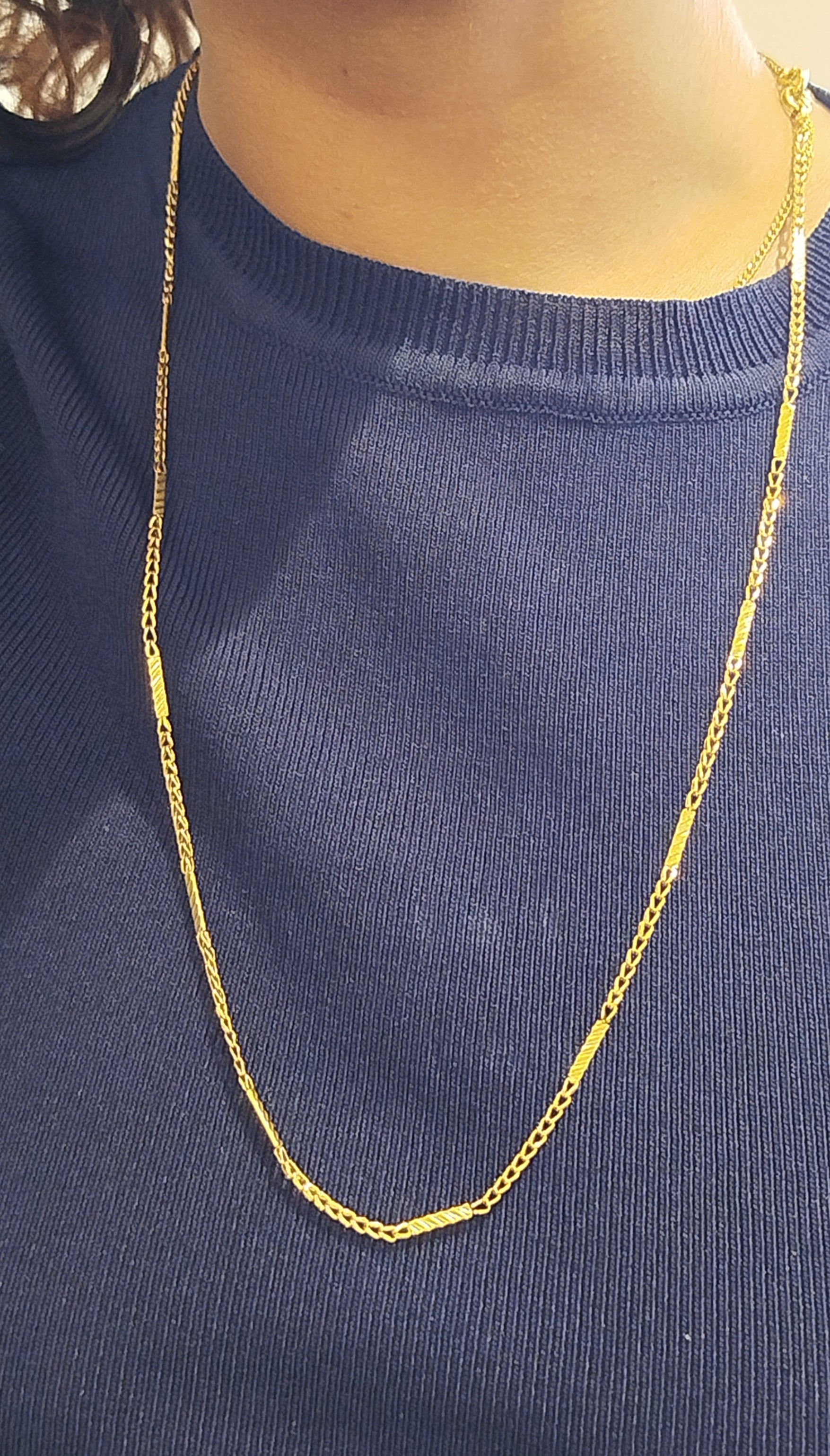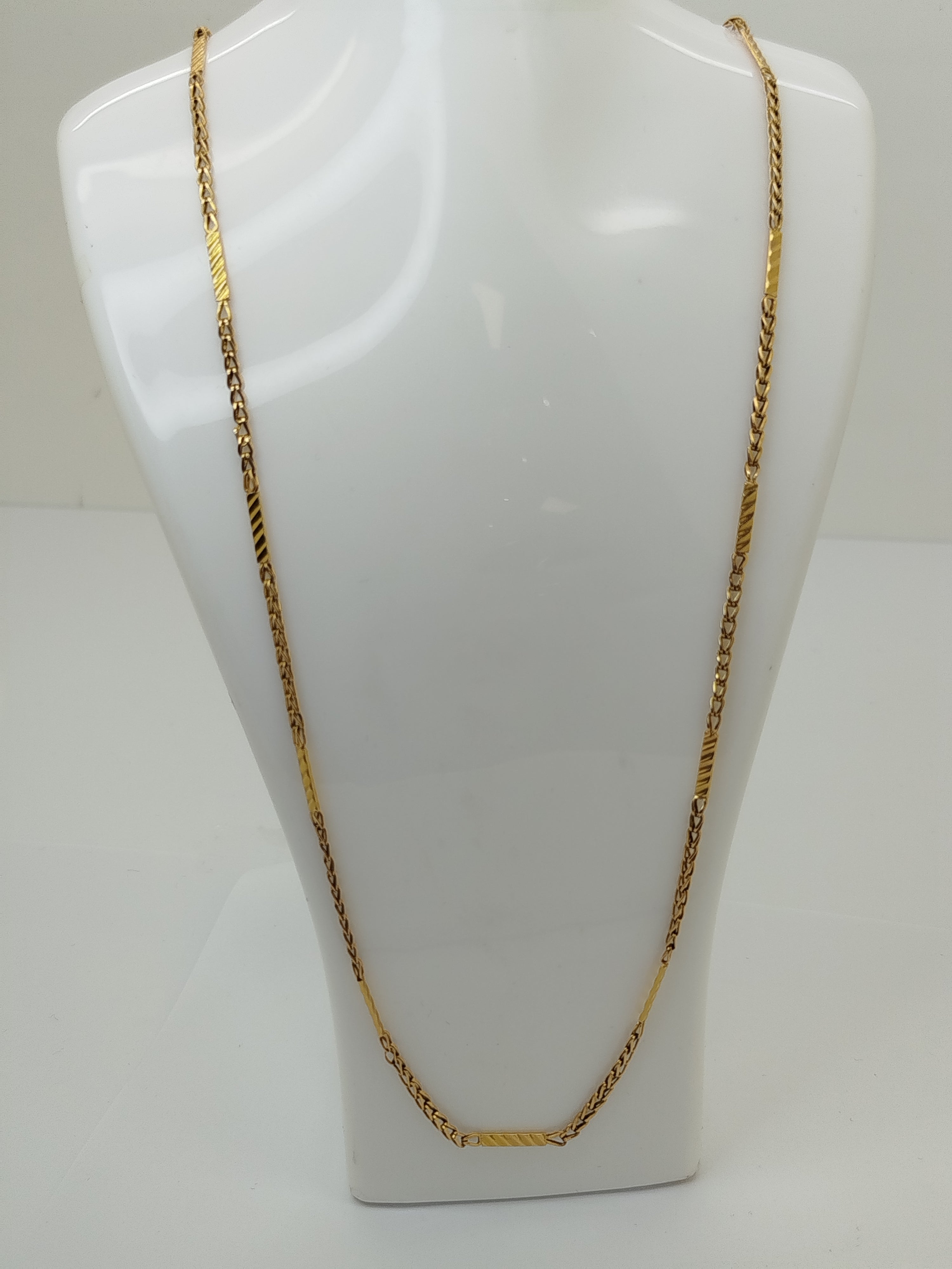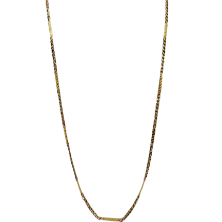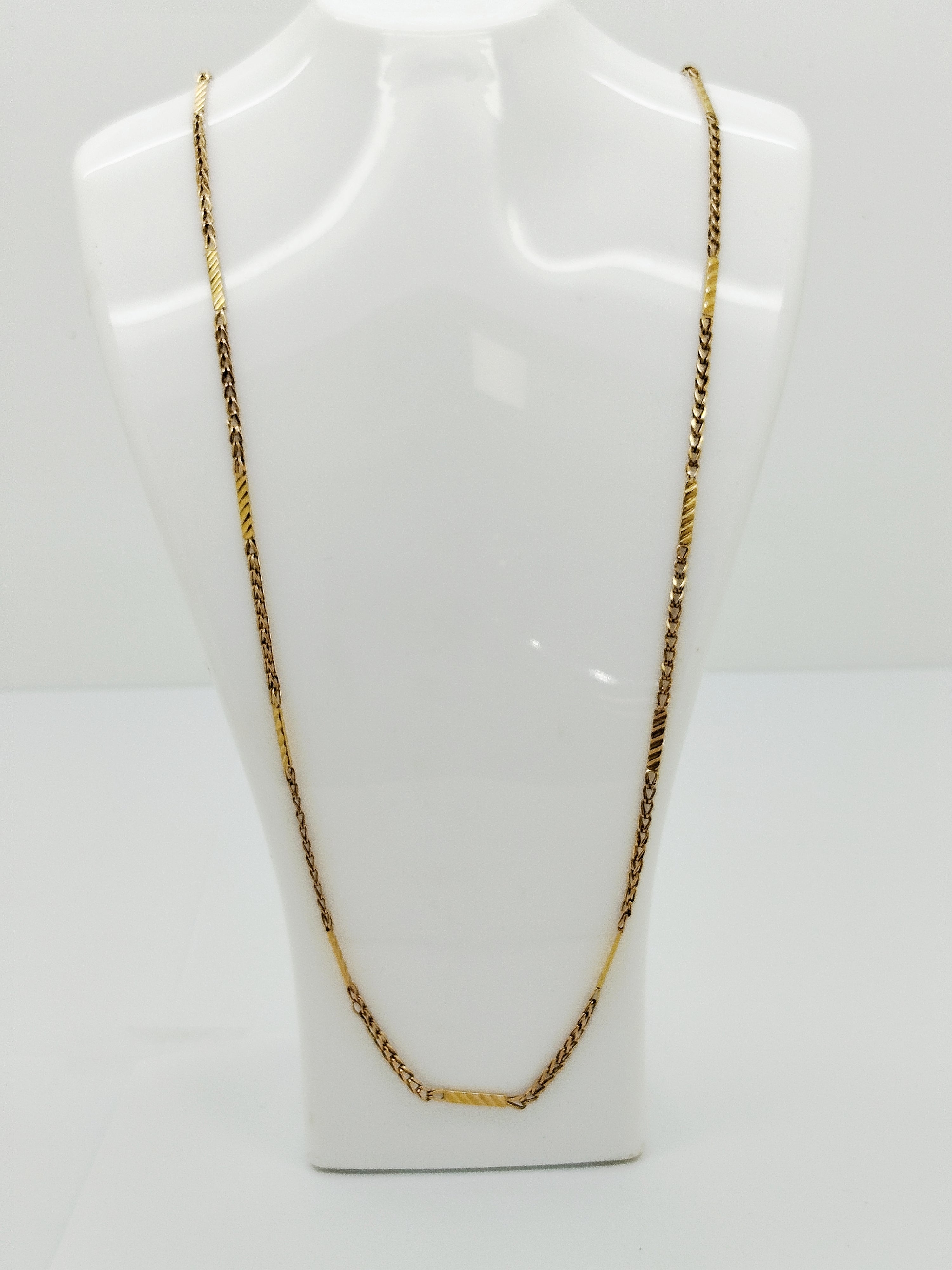 Collier matinée en or jaune 18 carats (750/1000), maille fantaisie subtile, sans poinçon. Longueur 63 cm, largeur 0,2 cm, épaisseur 0,1 cm. Poids : 9,51 g. Fermoir spirale. En très bon état.
