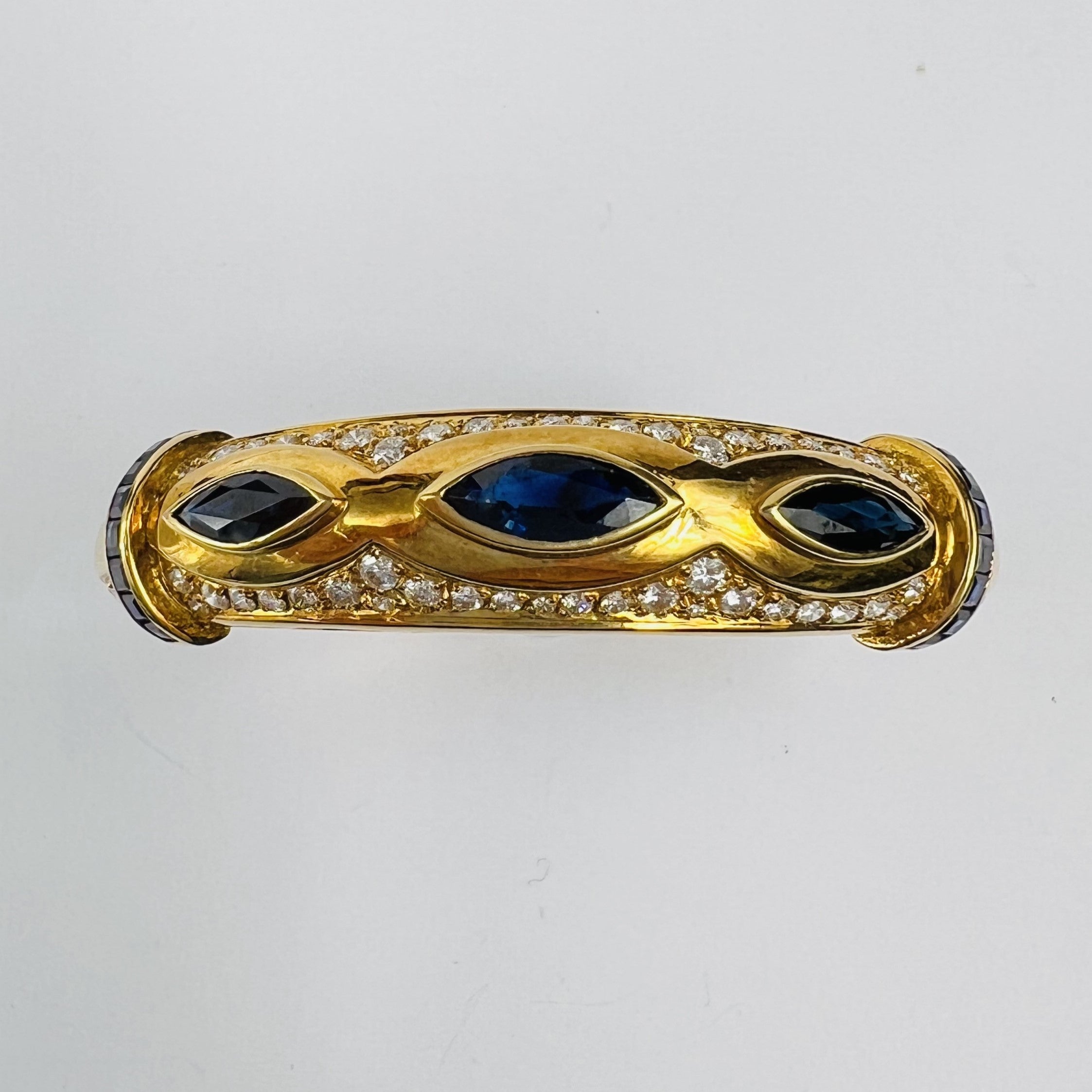 Beau bracelet semi rigide articulé en chute en or jaune 750/1000 serti de diamants brillantés et de saphir taille navette et calibrés