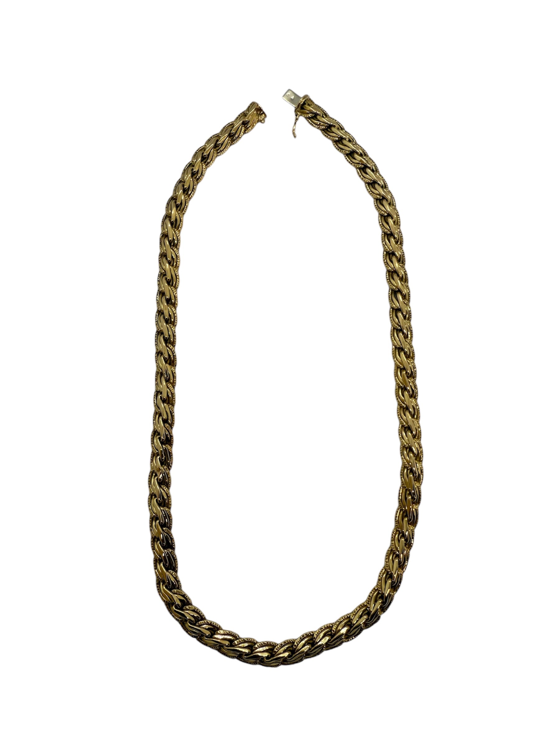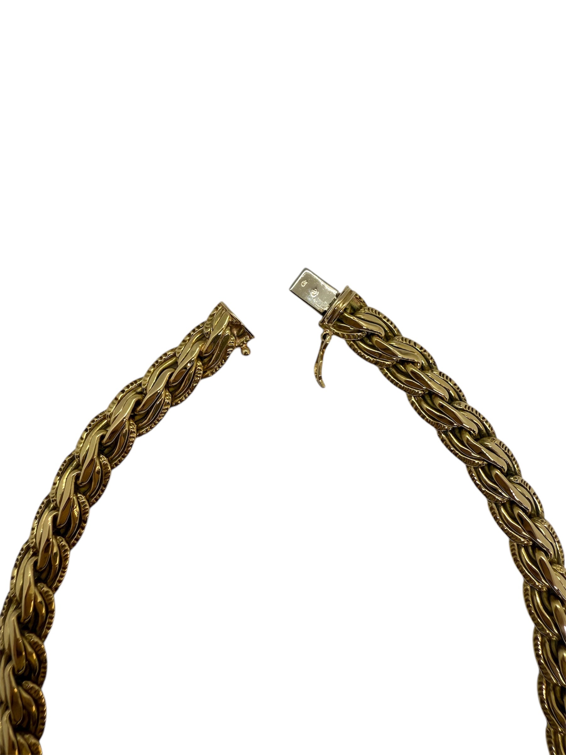 Ravissant collier ras du cou en maille haricot, conçu en or jaune 18 carats (750/1000), poinçonné Tête d’Aigle. Pesant 25,55 grammes et mesurant 46,7 cm de longueur, il présente une largeur de 7 mm et une épaisseur de 3 mm, offrant un design à la fois robuste et raffiné.