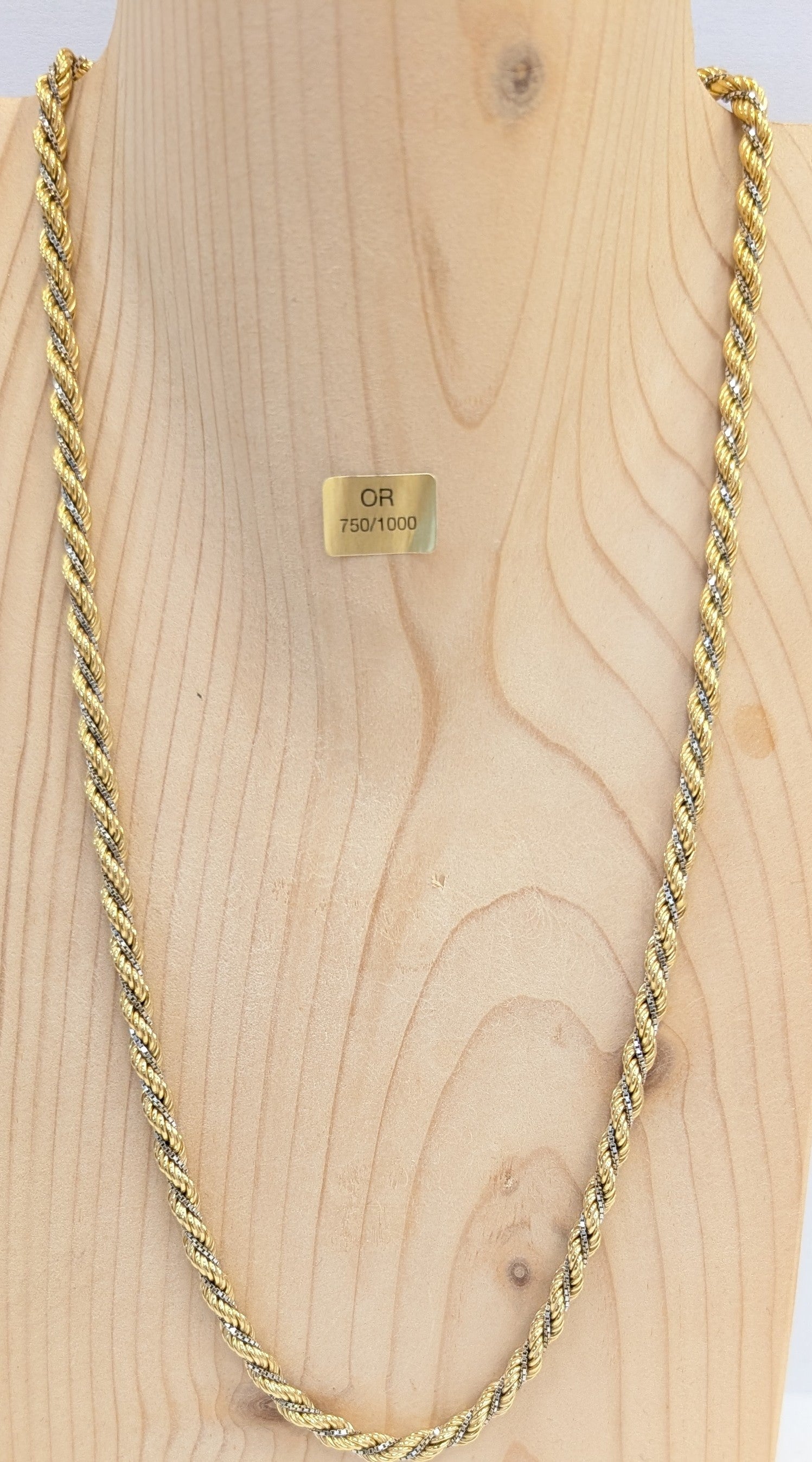 Collier princesse en or jaune et or blanc 18 carats (750/1000), poinçonné tête d’aigle, pèse 12.94 grammes. Il présente une maille vénitienne torsadée, mesure 42,5 cm de long et est doté d’un fermoir mousqueton. Sans pierres, il est en très bon état général.