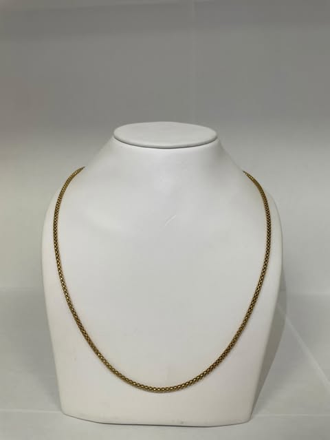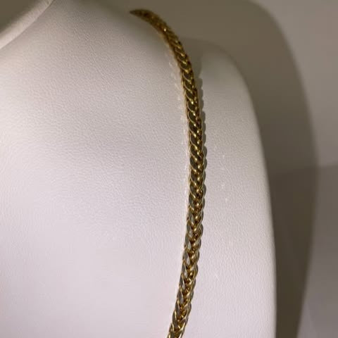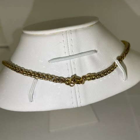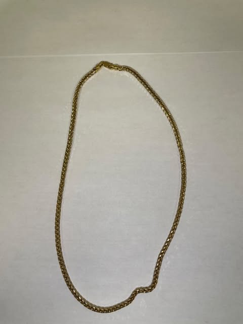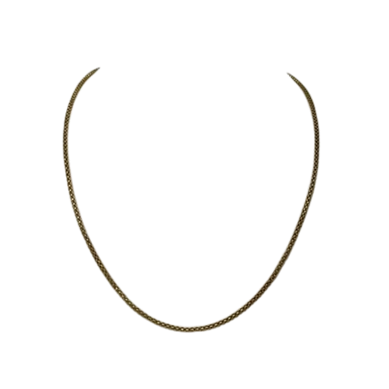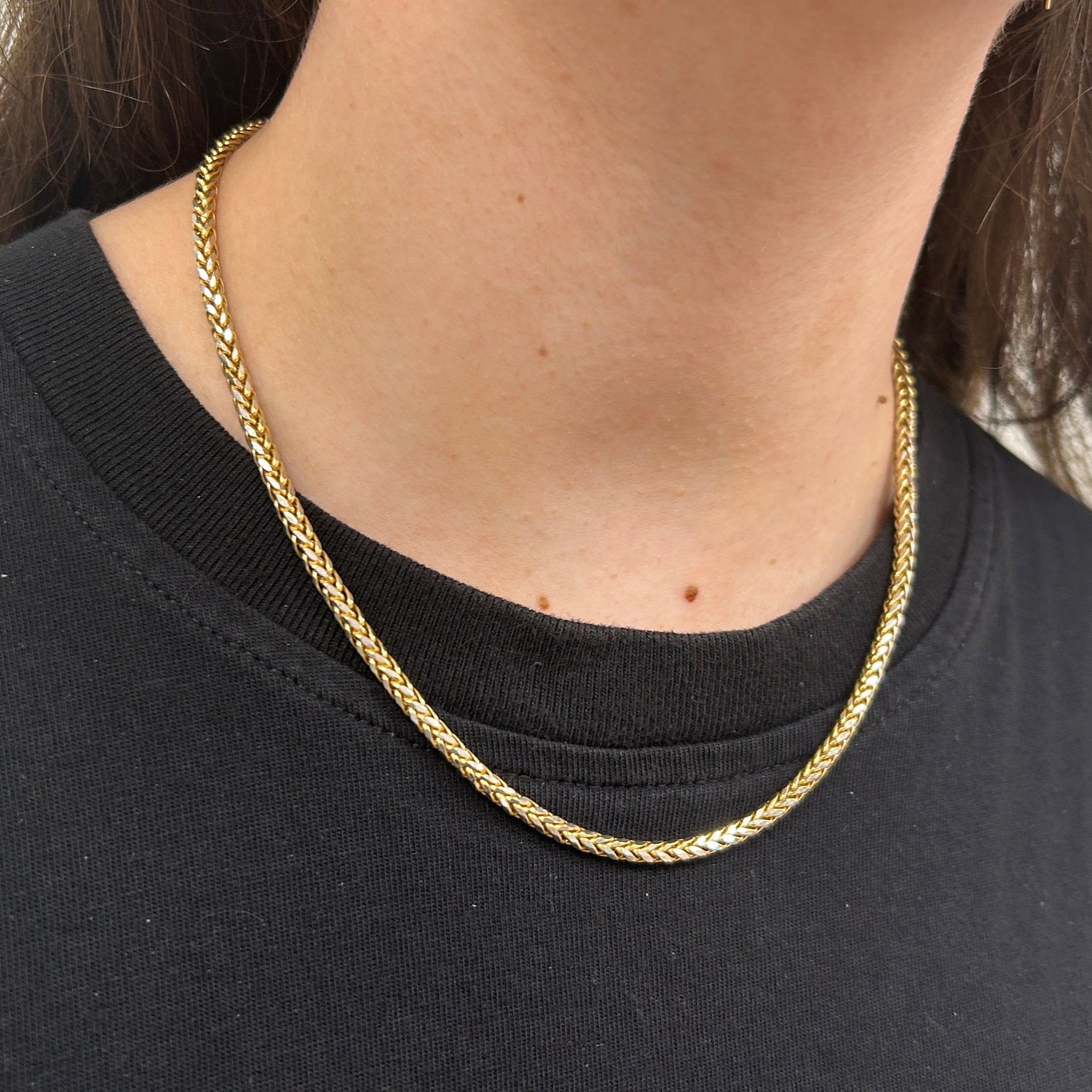 Collier ras du cou en or jaune 18 carats (750/1000), maille tressée, doté d’un fermoir mousqueton sécurisé. Il pèse 12,12 grammes et mesure 45 cm de long, avec une largeur de 0,5 cm. Sans pierres, il présente un poinçon 750 et se trouve en bon état général.