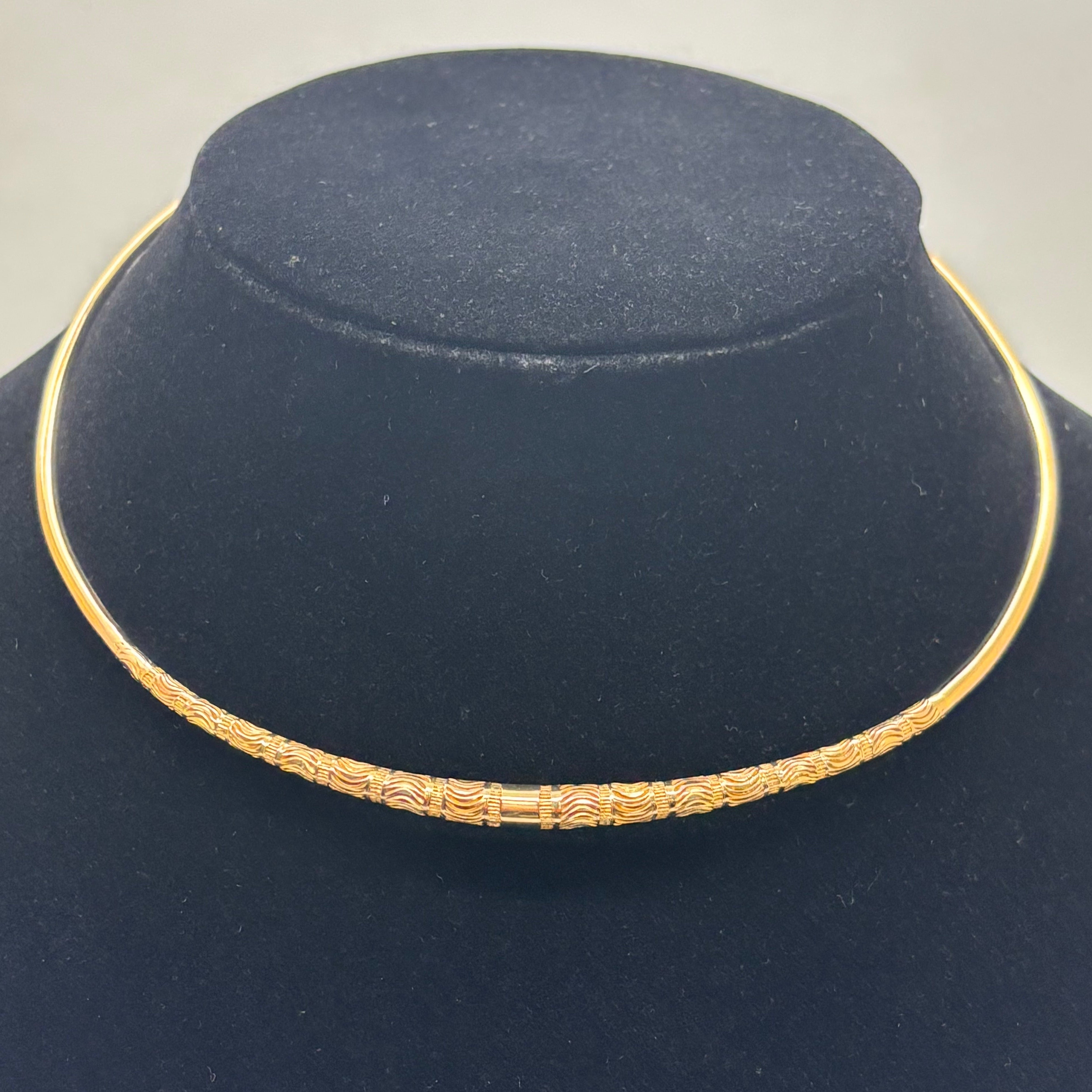 Collier rigide de type jonc en or jaune 750/1000 (18 carats), au design épuré et élégant. Son format ras du cou (40 cm) met en valeur le port de tête, avec une belle largeur de 12,6 mm et une épaisseur de 2 mm.