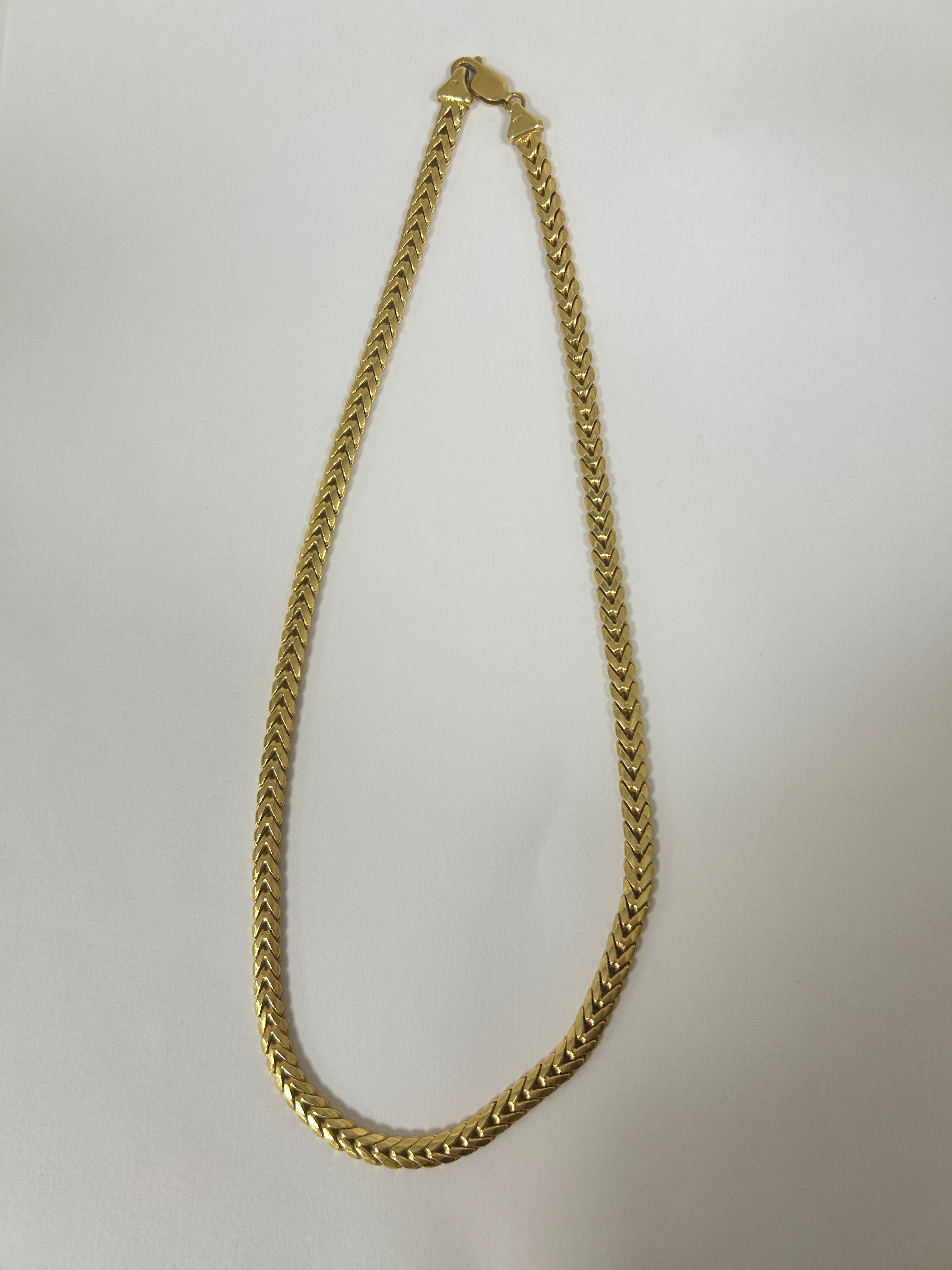 Collier ras du cou en or jaune 18 carats (750/1000), à maille gourmette, avec fermoir mousqueton. Il est poinçonné 750, pèse 19,30 grammes et mesure 43 cm de longueur pour une largeur de 1 cm. Sans pierres, il est proposé en bon état général.