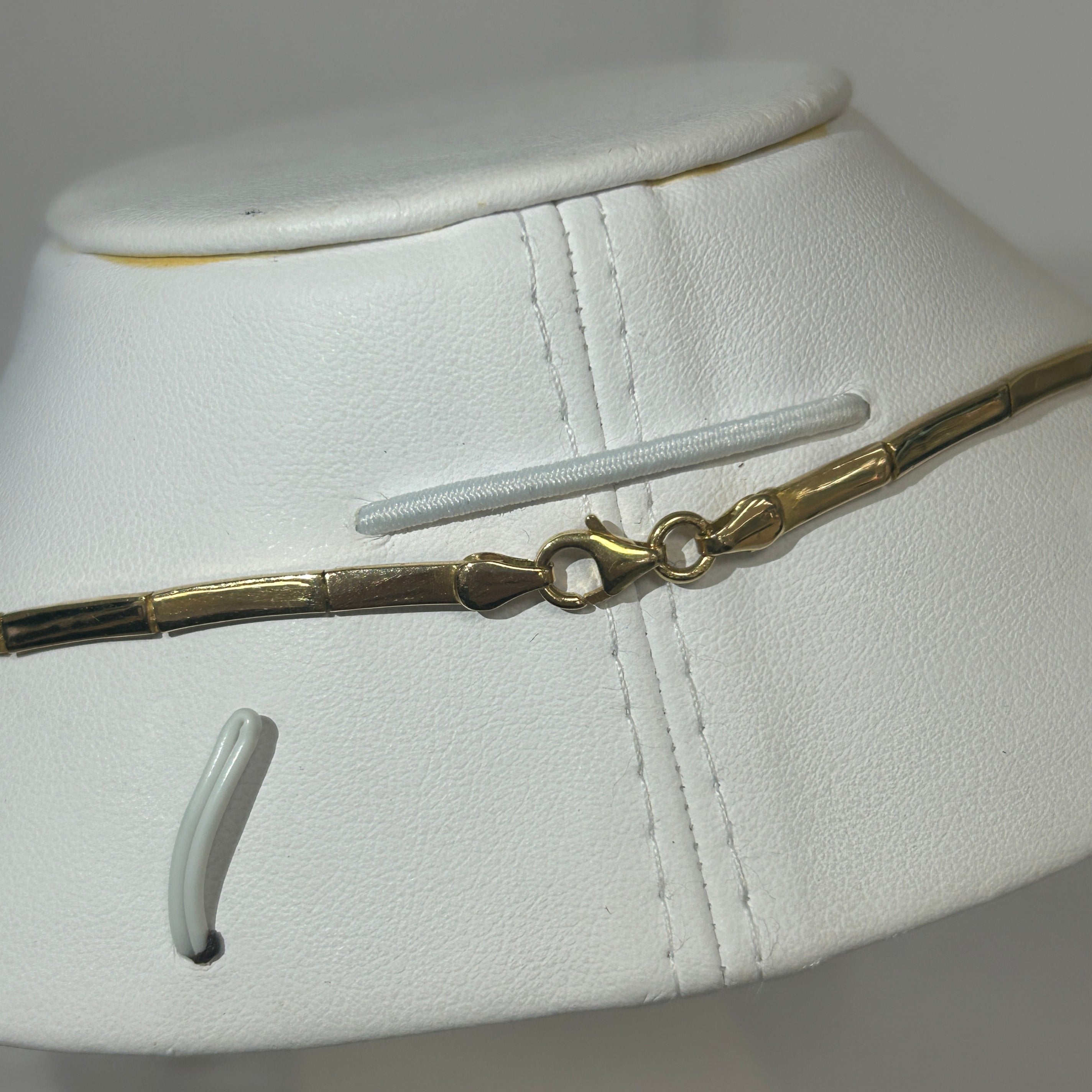 Collier ras du cou en or jaune 750/1000 (18 carats), maille miroir, fermoir mousqueton. Longueur 47 cm, largeur 21 mm, poids 25,34 g. Composé de 114 pierres. Bon état, sans poinçon.