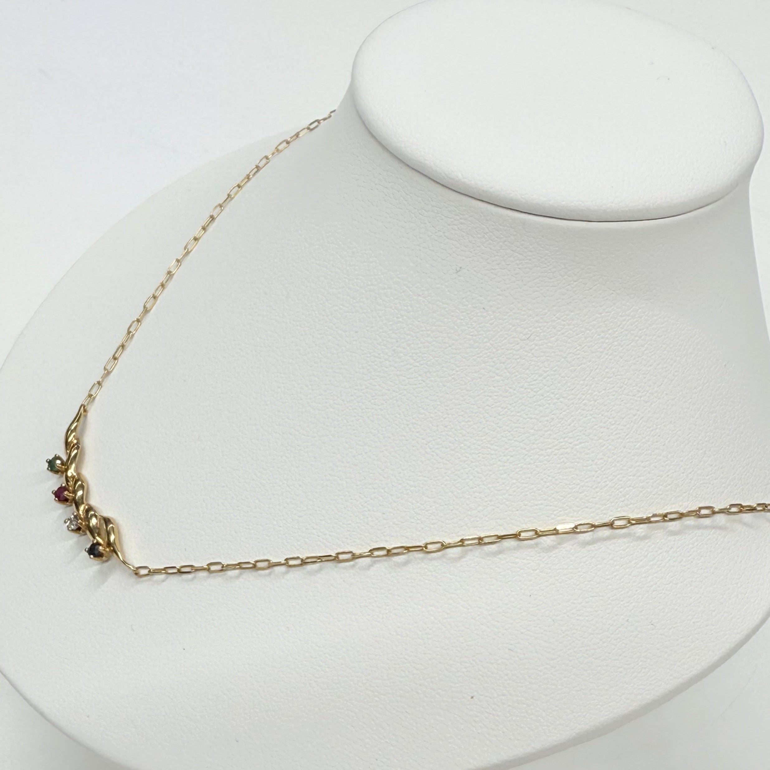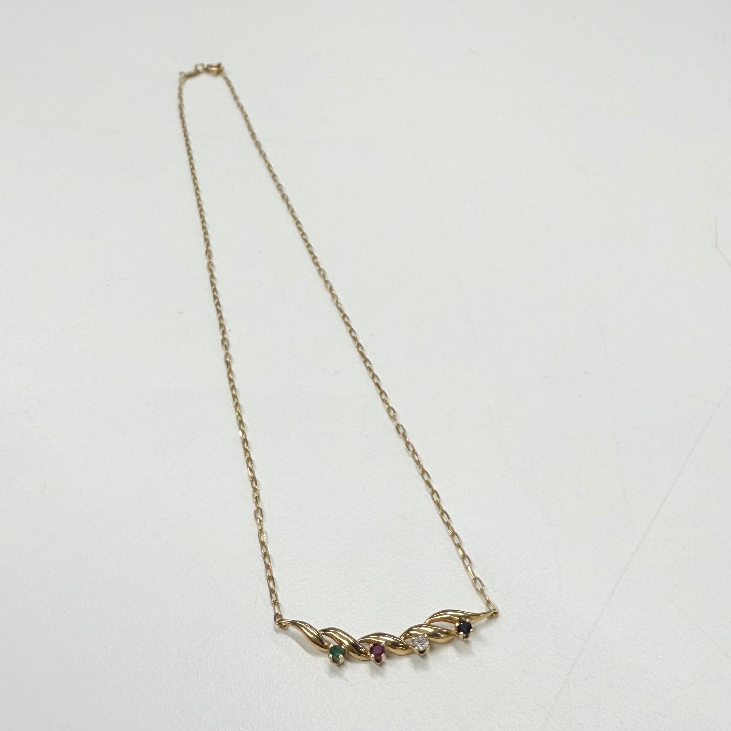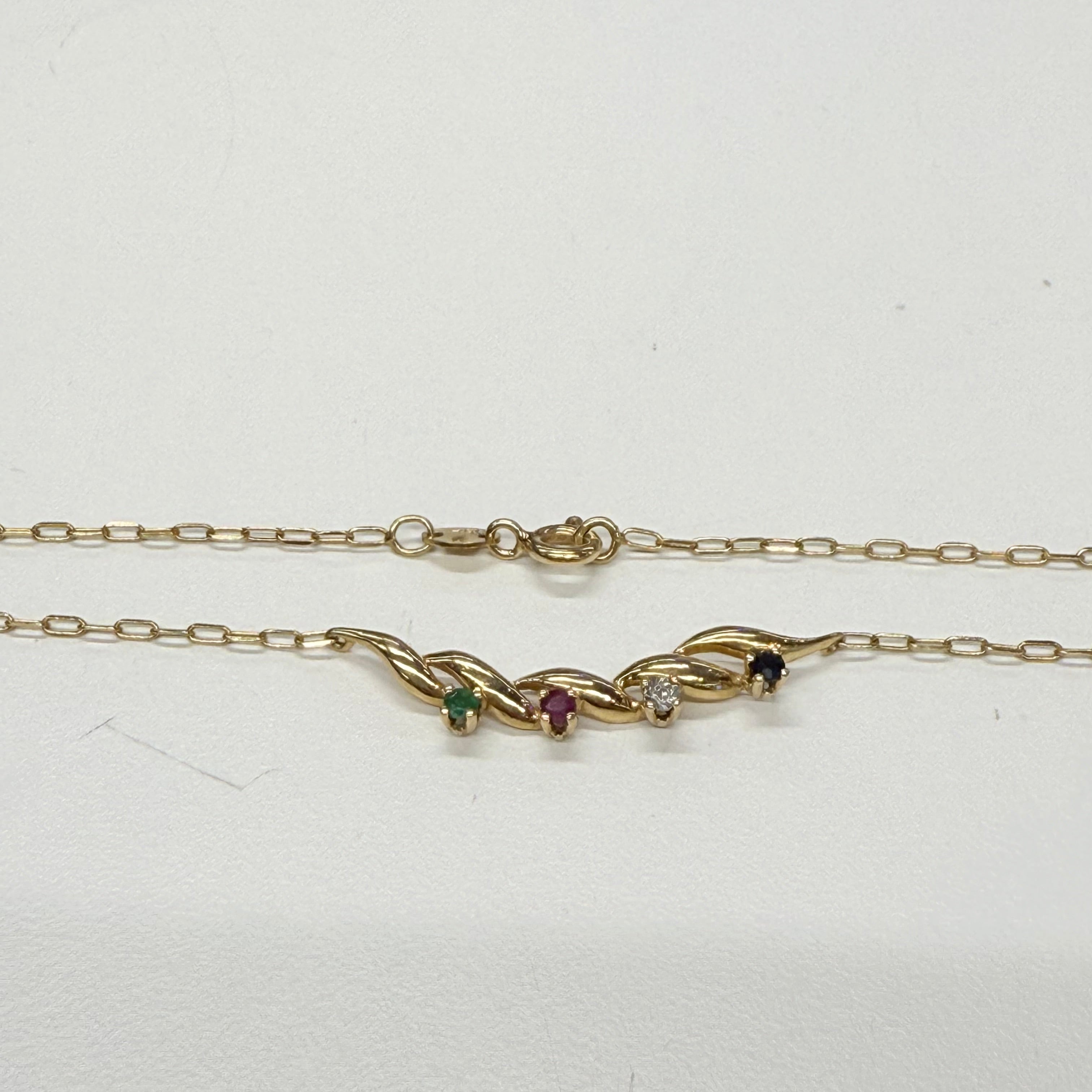 Collier ras du cou en or jaune 18 carats (750/1000), poinçonné 750, incarne l’élégance et le raffinement. Pesant 2,83 grammes, il mesure 43 cm de long et arbore une maille cheval fine avec une largeur et une épaisseur de 0,1 cm. Orné de quatre pierres précieuses — une émeraude, un rubis, un diamant et un saphir, chacune mesurant 0,1 cm — ce bijou rayonne de lumière et de couleur. Doté d’un fermoir anneau ressort pratique, il est en très bon état et constitue un choix parfait pour rehausser vos tenues avec une touche précieuse et intemporelle.