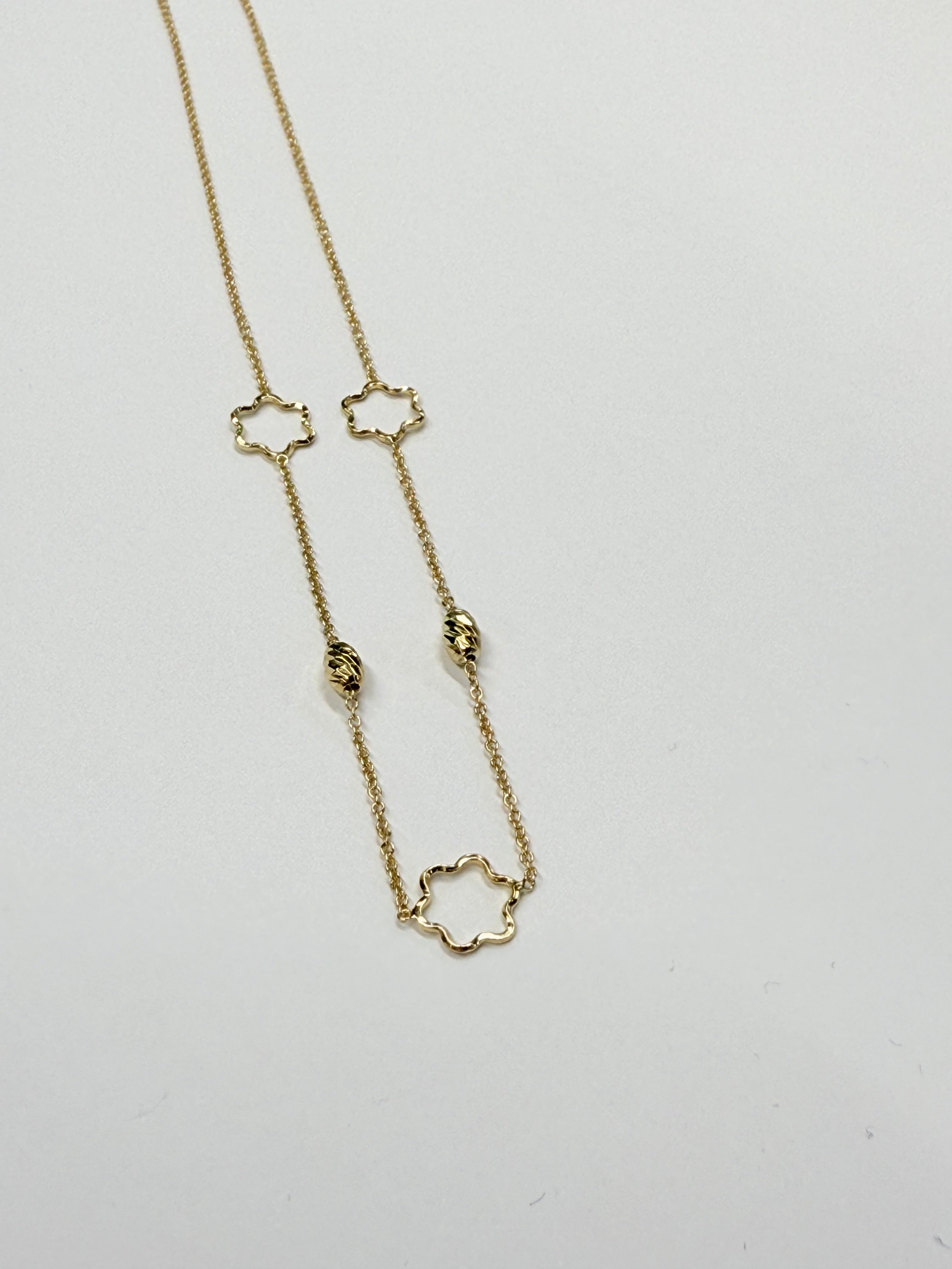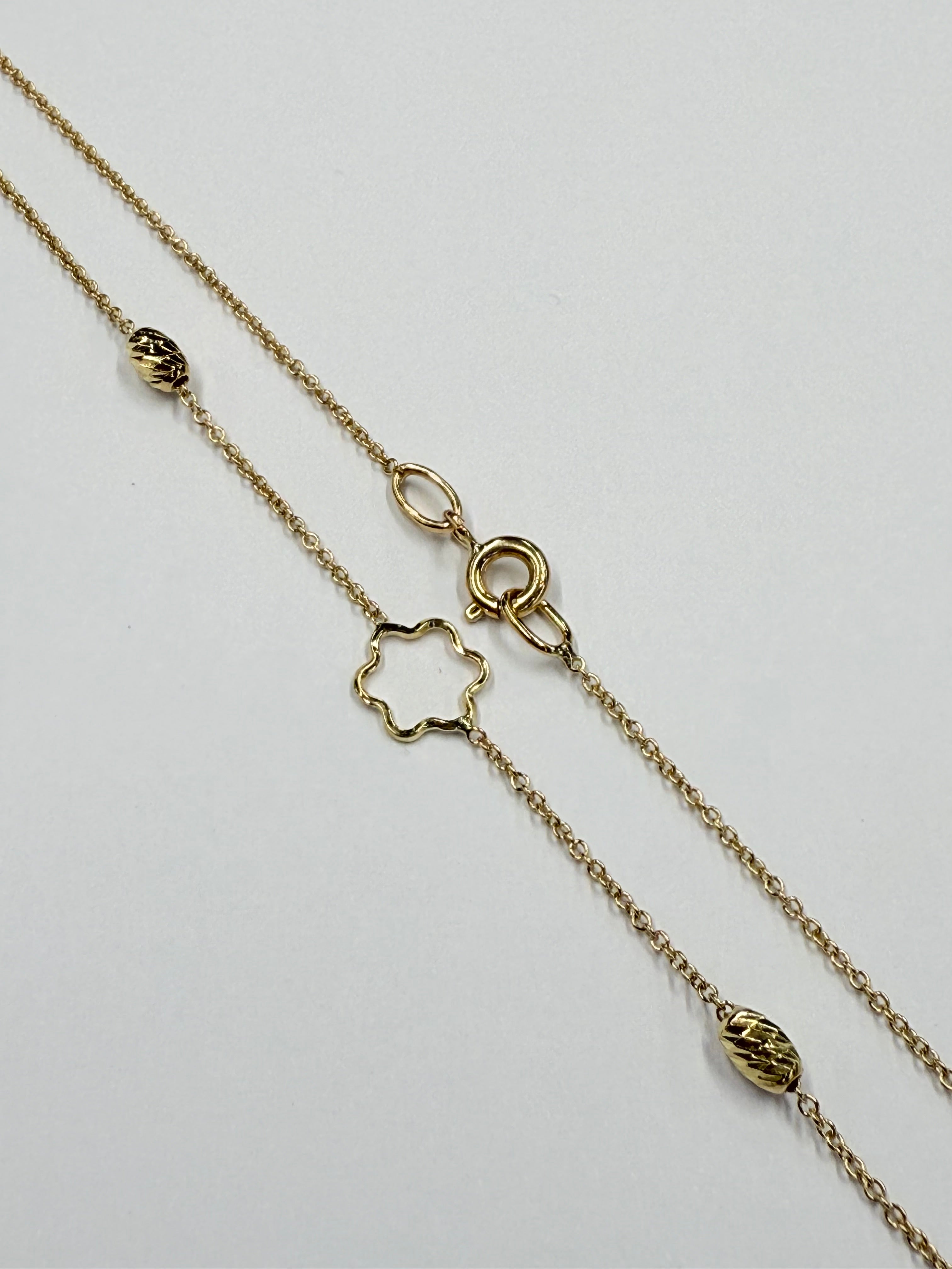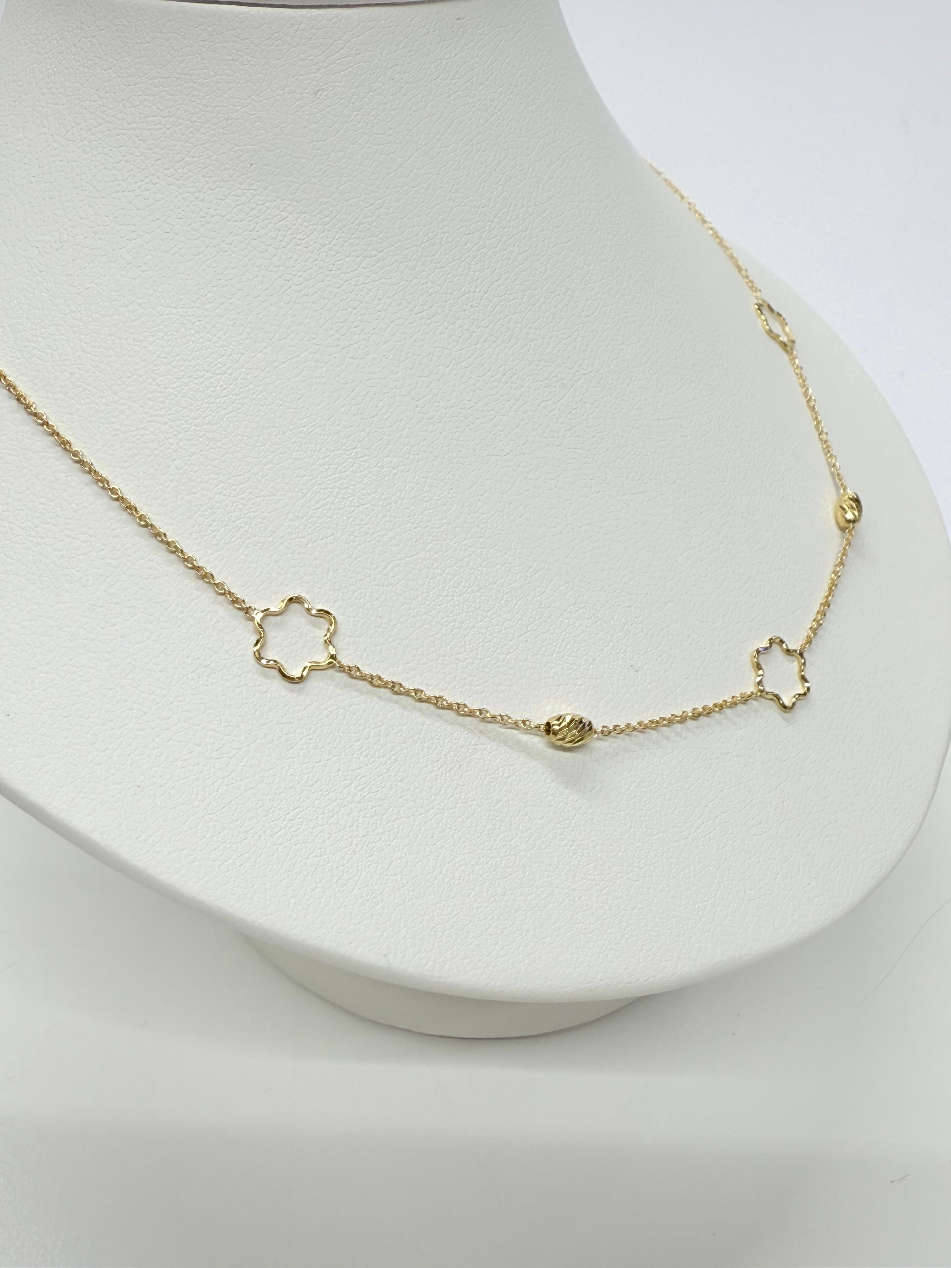 Ravissant collier ras du cou en or jaune 18 carats (750/1000), poinçonné 750. Pesant 2,27 grammes, il mesure 46 cm de longueur, avec une largeur de 0,6 cm et une épaisseur de 0,1 cm. Sa maille forçat classique est agrémentée d’un élégant motif en forme de fleur, qui apporte un charme unique et une note subtile de féminité. Doté d’un fermoir anneau ressort pratique, ce bijou en très bon état est parfait pour compléter une tenue quotidienne ou habillée avec élégance.