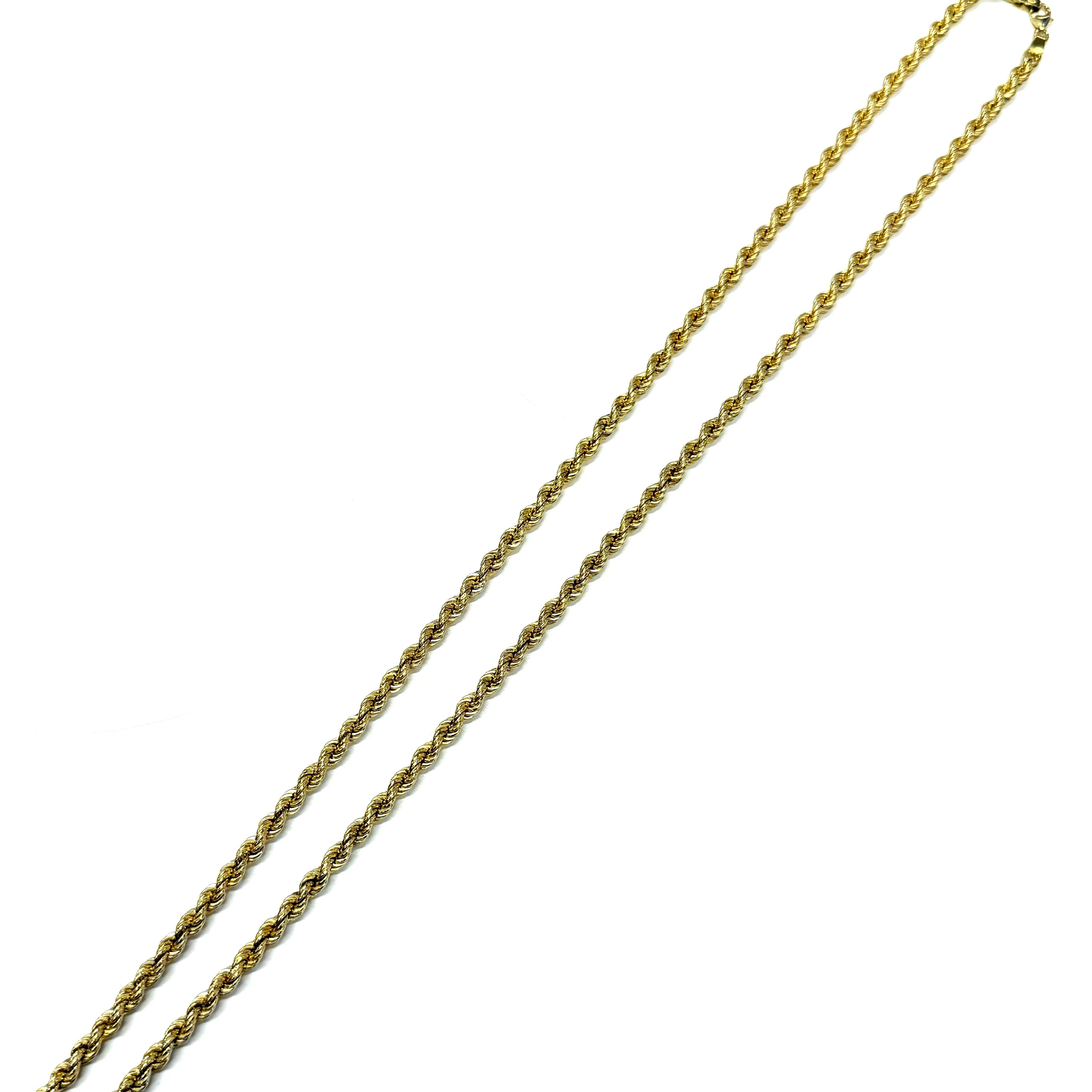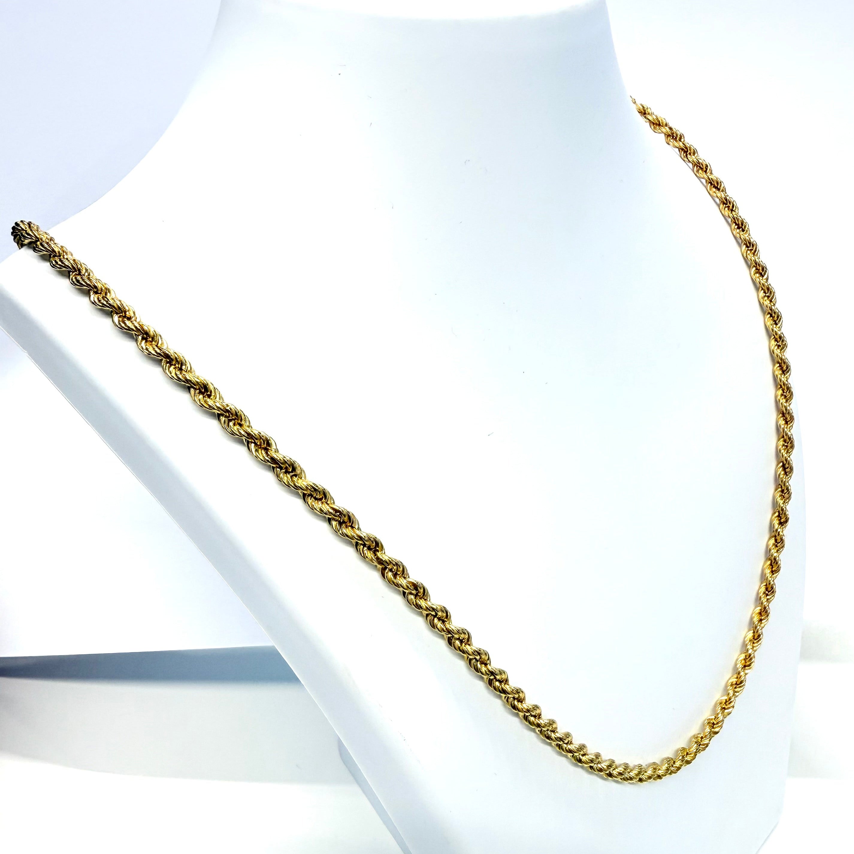 Sautoir en or jaune 750/1000 (18 carats) avec maille corde et fermoir mousqueton. Longueur : 64 cm. Poids : 13,90 g. Largeur : 0,4 cm. Poinçon tête d’aigle. Sans pierres. En très bon état.