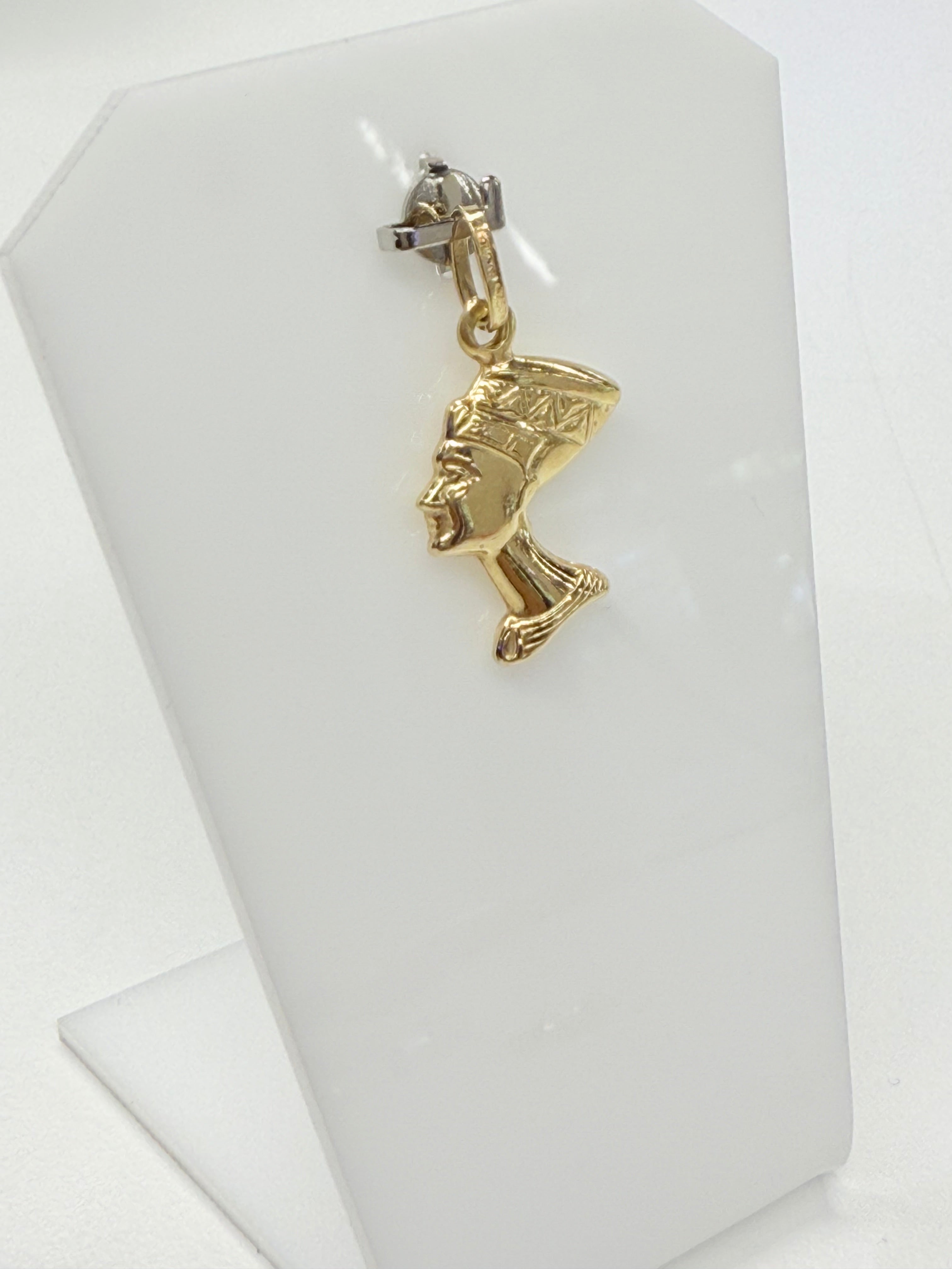 Pendentif Nefertiti, réalisé en or jaune 18 carats (750/1000). Mesurant 2,5 cm de hauteur pour 1,3 cm de largeur et affichant une épaisseur de 0,2 cm, ce bijou léger de 1,44 gramme est un hommage à la beauté intemporelle. Poinçonné Tête d’Aigle, il garantit authenticité et qualité. En très bon état, ce pendentif est parfait pour compléter votre look avec finesse et sophistication.