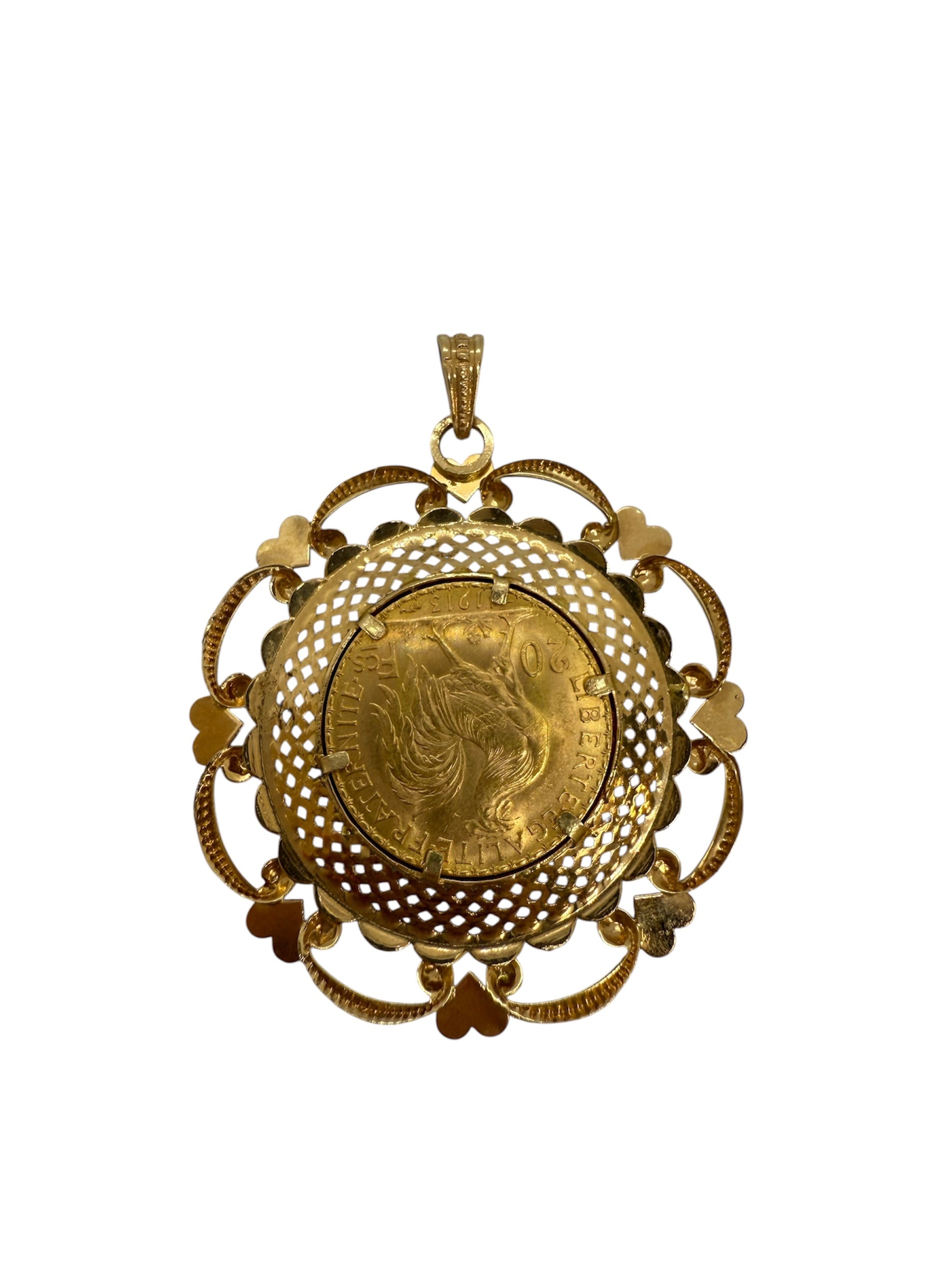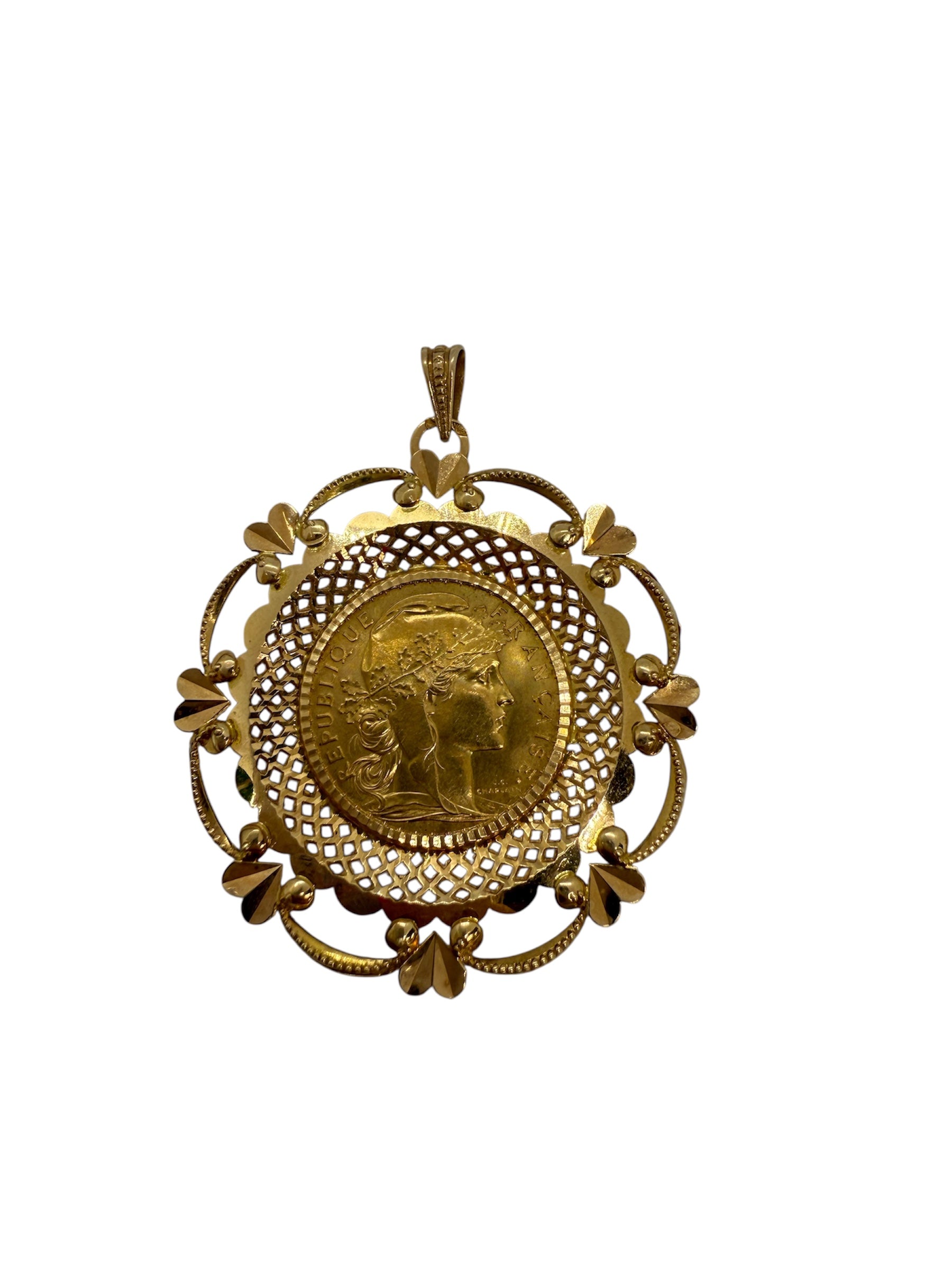 Pendentif porte-pièce en or jaune 18 carats (750/1000), sans poinçon. Il mesure 44 mm de hauteur pour 39 mm de largeur et 1 mm d’épaisseur, avec un poids de 10,31 grammes. État : Très bon.