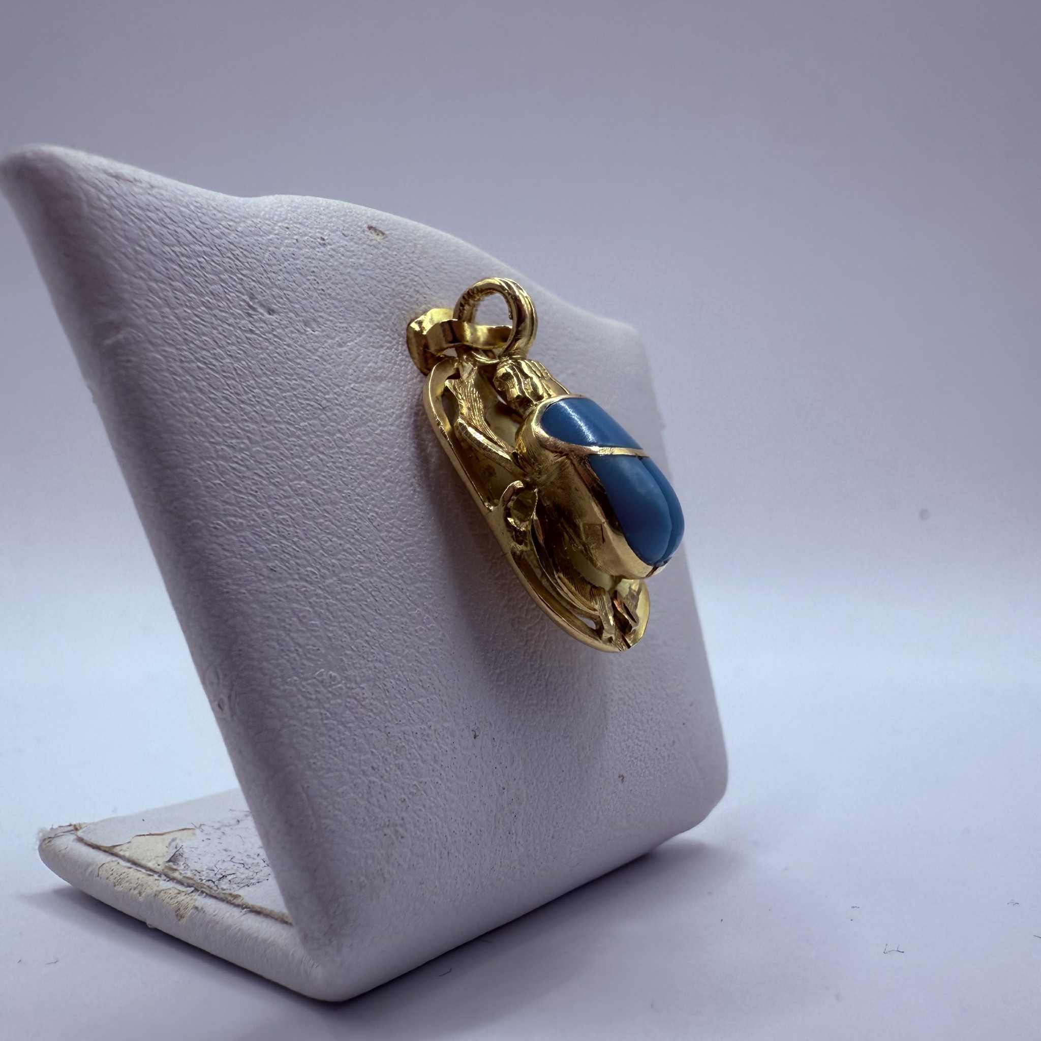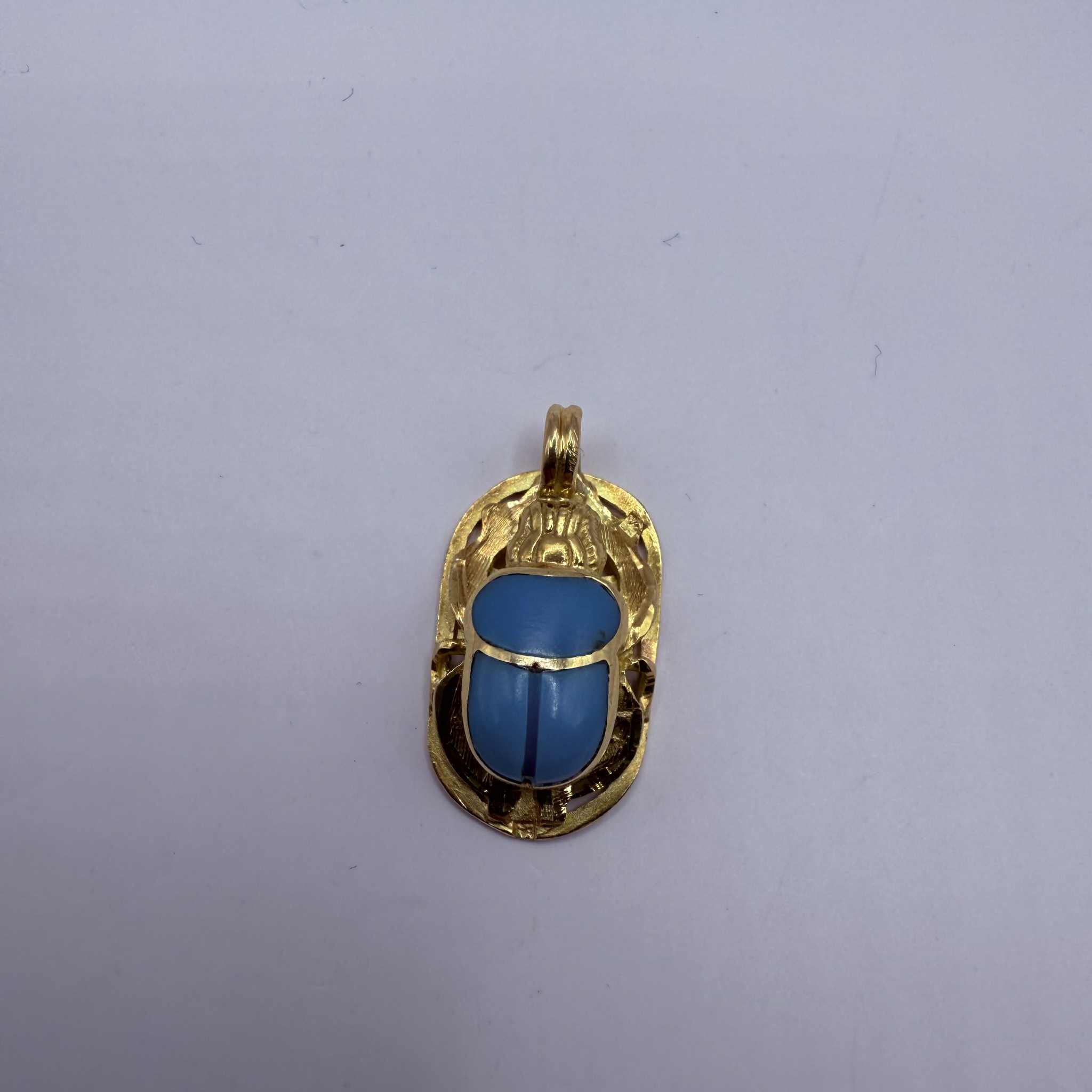 Pendentif raffiné en or jaune 750/1000, représentant un scarabée au dos bleu éclatant — un symbole de protection et d’éternité inspiré de l’Égypte ancienne.
