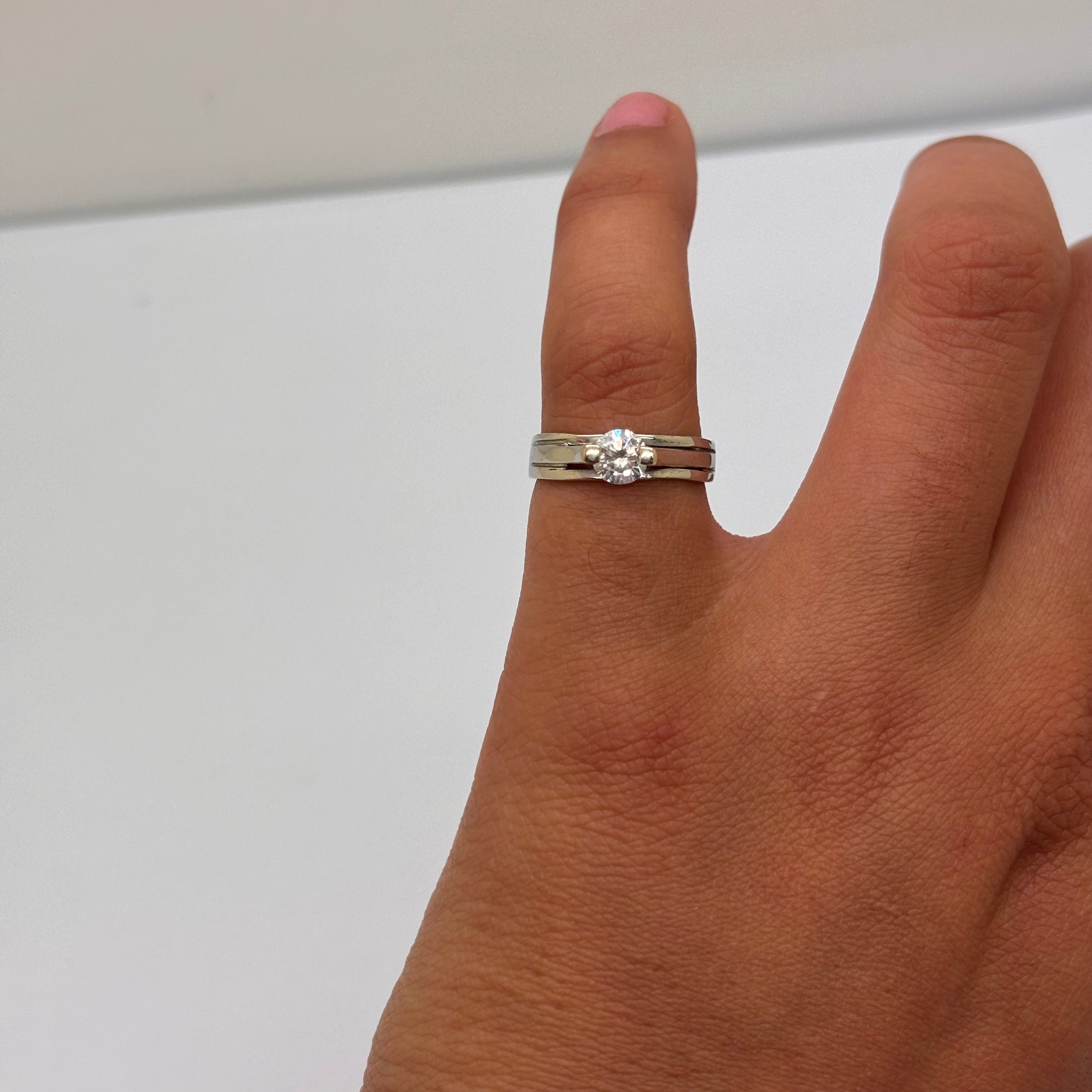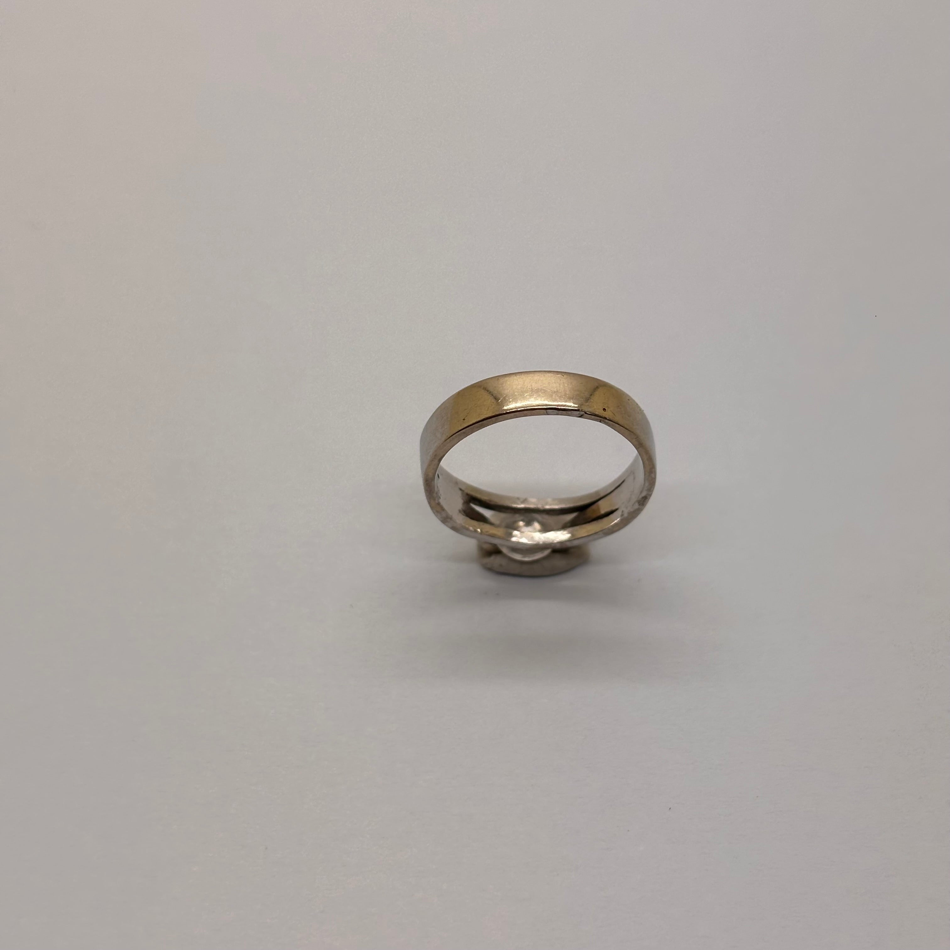 Bague solitaire en or blanc 18 carats (750/1000), d’un poids de 3,15 grammes. Elle est de taille 48 et ne présente pas de poinçon. La bague est sertie d’un oxyde de zirconium unique. Elle est en bon état général.