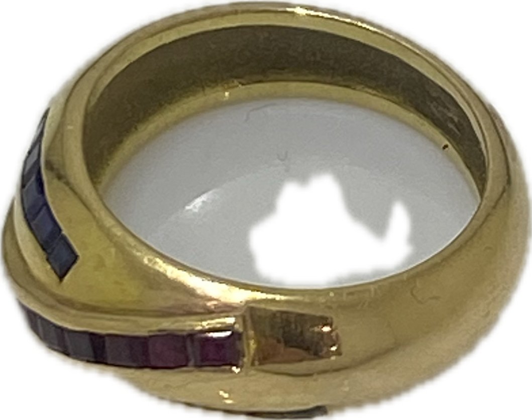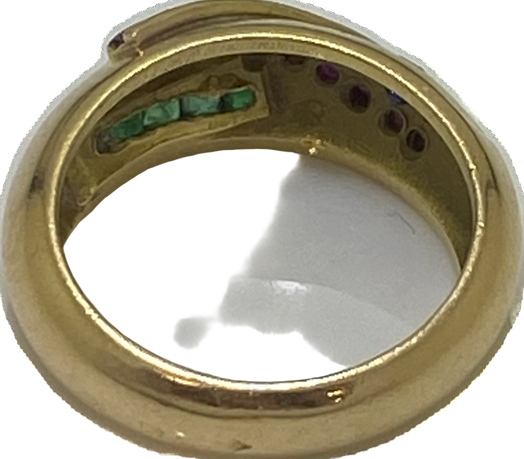 Sublime alliance en or jaune 18 carats (750/1000) sertie de rubis, saphirs et émeraudes, offrant un éclat coloré et raffiné. Avec un poids de 8,17 g et une taille 56, cette bague associe élégance et confort. Composée de 5 émeraudes, 5 saphirs et 9 rubis, elle séduit par son charme intemporel et son équilibre harmonieux. Un bijou en très bon état, idéal pour celles et ceux qui aiment les créations précieuses et authentiques.