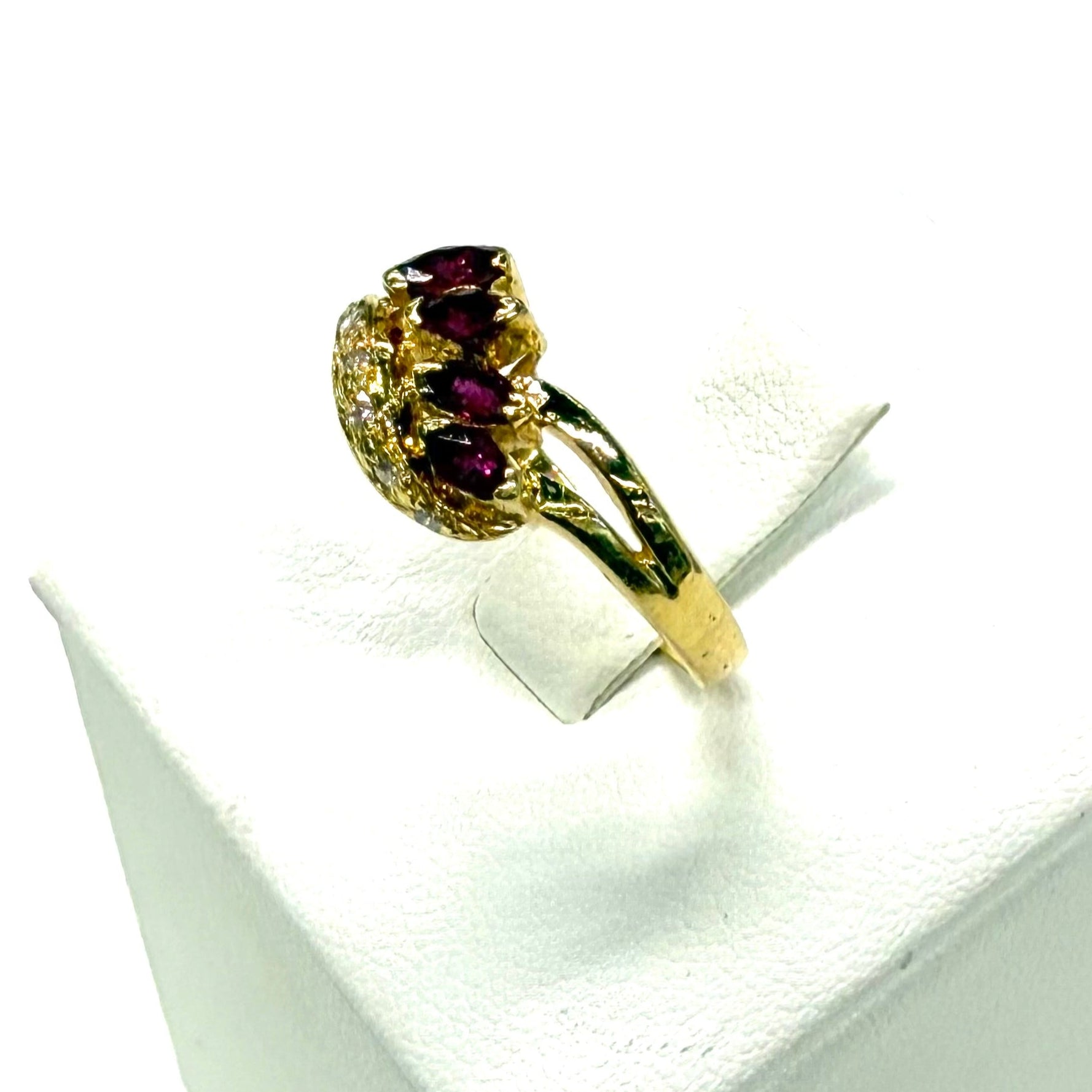 Bague empierrée en or jaune 18 carats (750/1000), poinçonnée 18K. Elle pèse 3,49 grammes et est de taille 54. Le bijou est serti de 4 rubis et de 5 éclats de diamants, offrant un contraste élégant entre les pierres. La bague est en très bon état général.