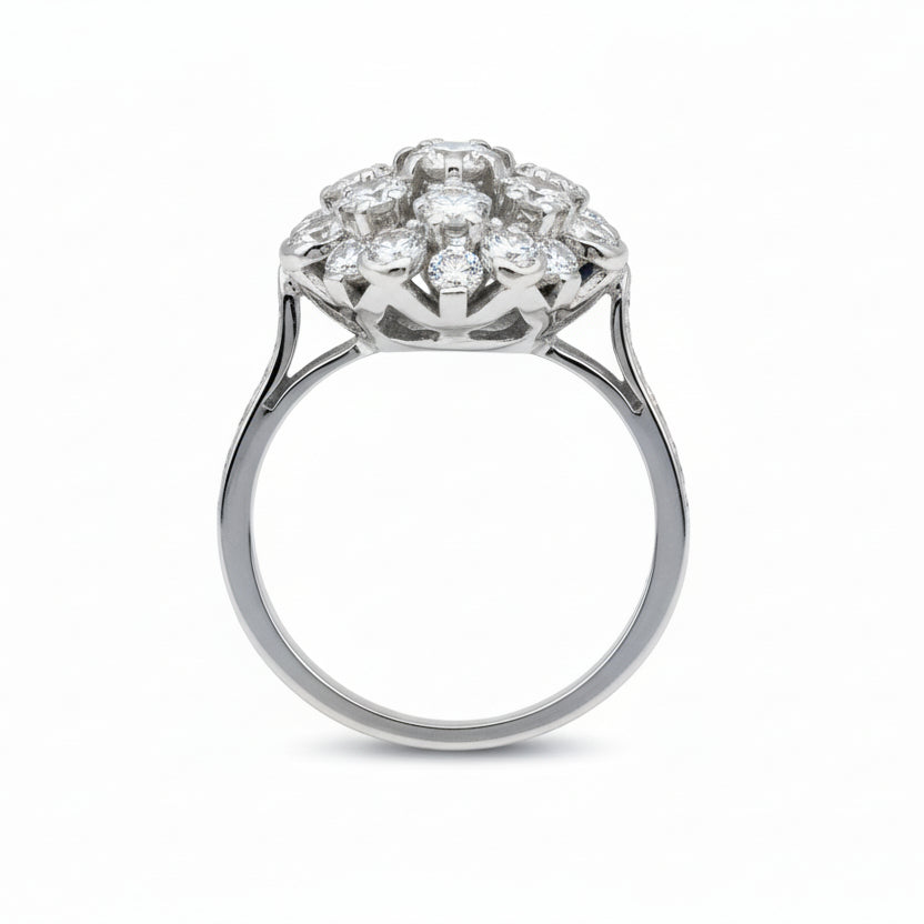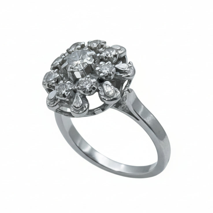 Bague chou en or blanc 750/1000, poinçonnée tête d’aigle. Poids 3,58 g, taille 47. Elle est sertie d’un diamant central de 4 mm et de 8 diamants de 2 mm. En bon état. Un bijou raffiné au style intemporel.