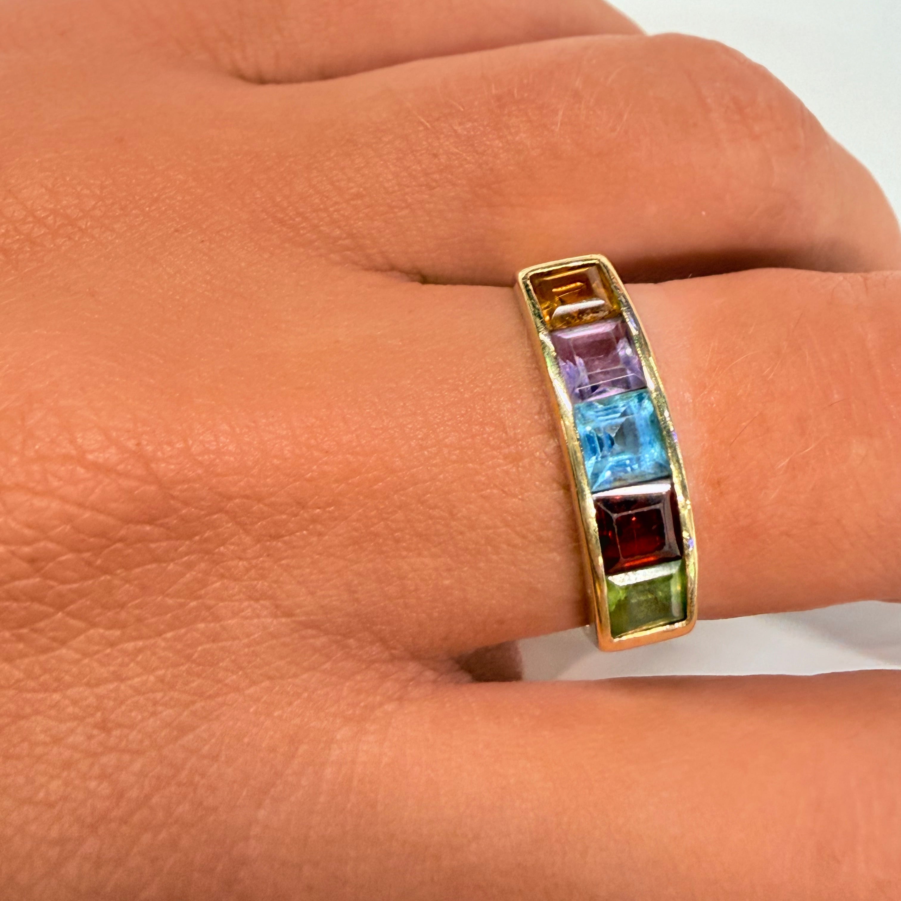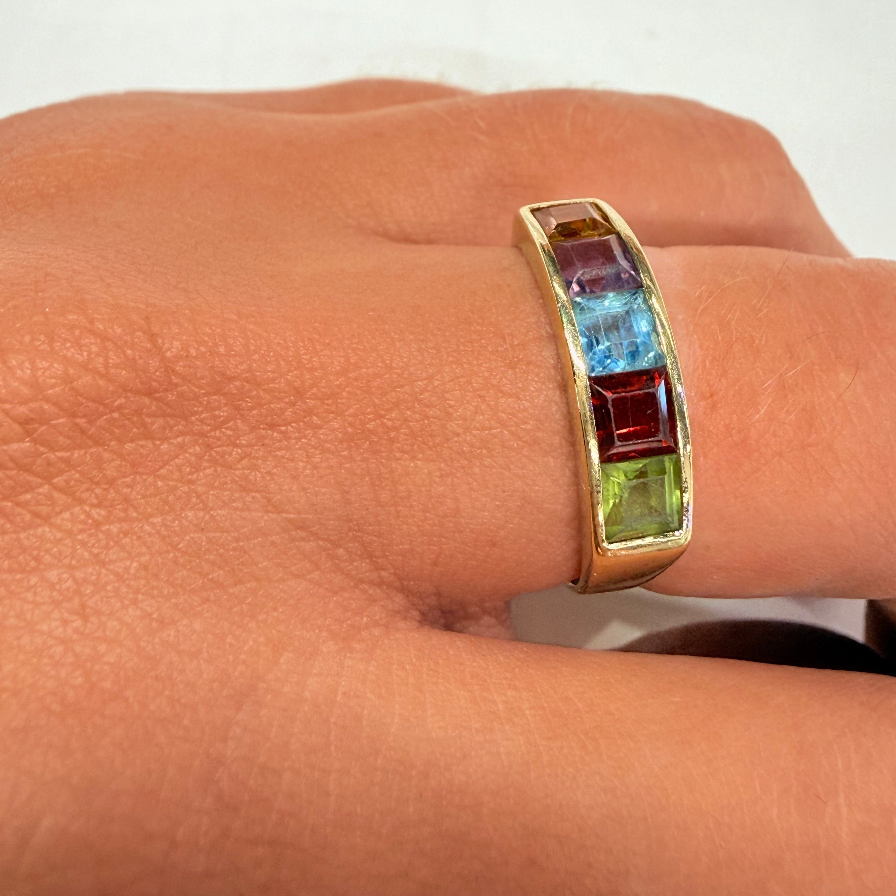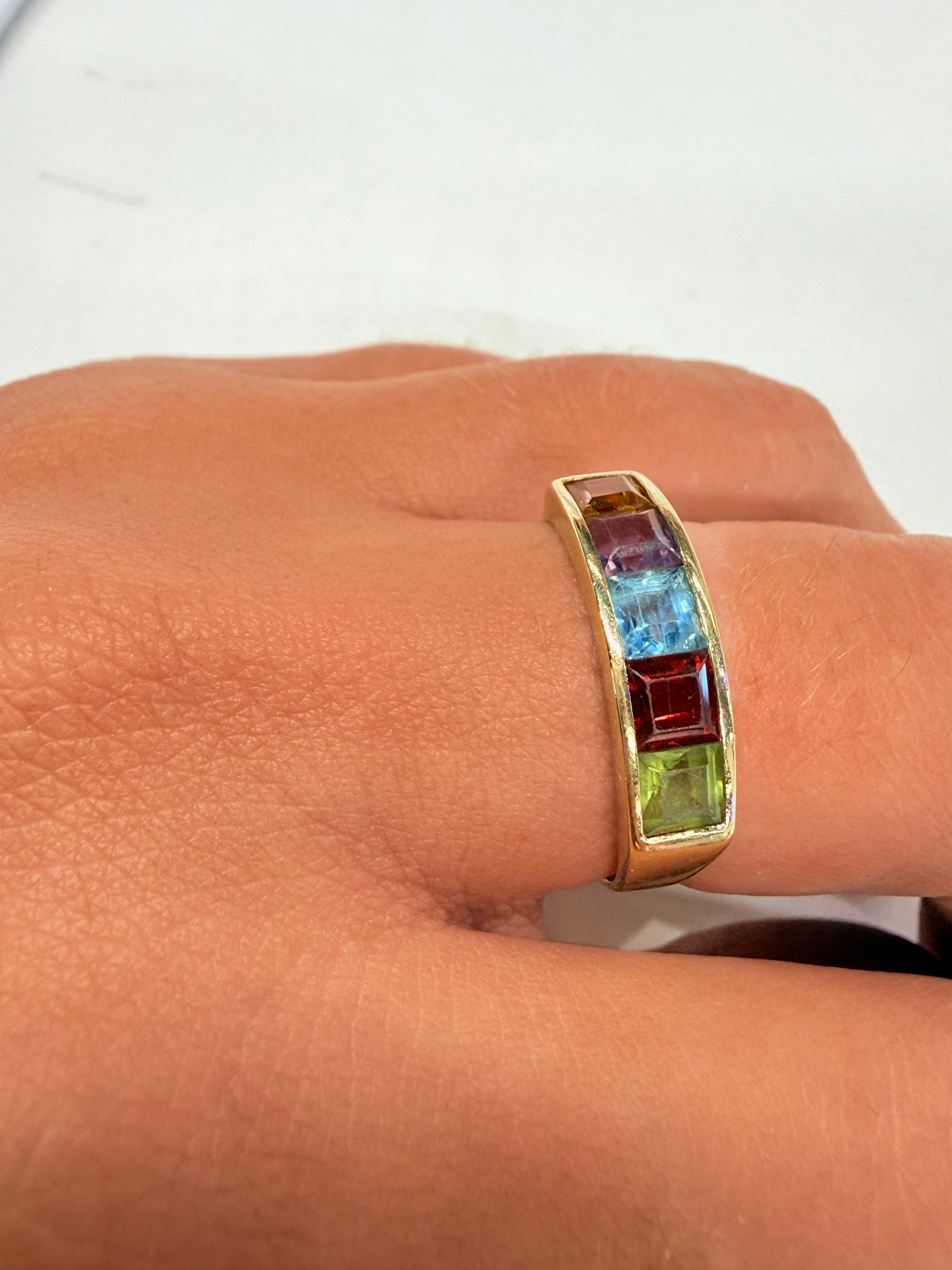 Bague empierrée en or jaune 18 carats (750), poids 7,38 g, taille 58. Monture solide sertie de 5 pierres semi-précieuses colorées de 0,4 cm. Pièce élégante, lumineuse et en très bon état, idéale pour apporter une touche de couleur et de raffinement.