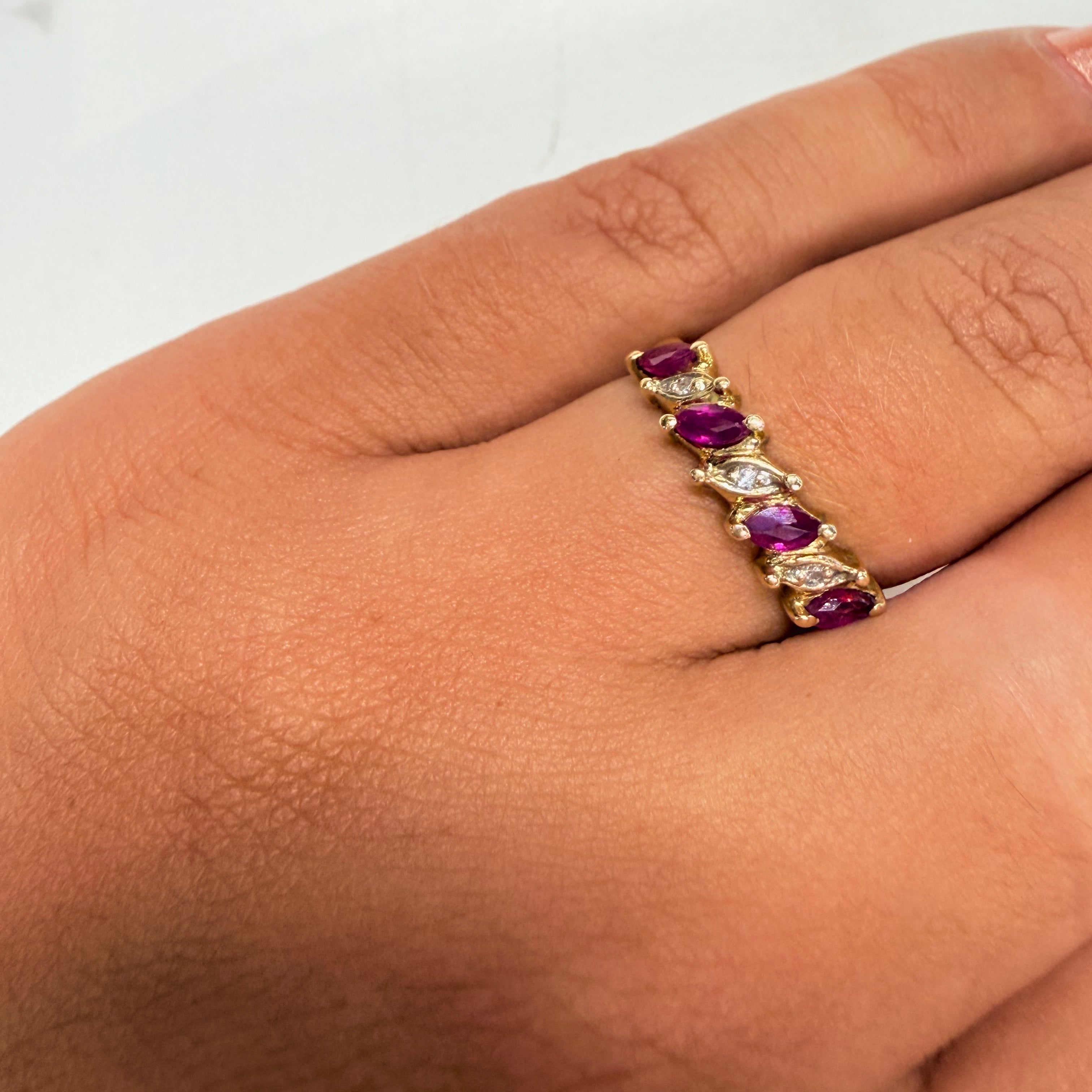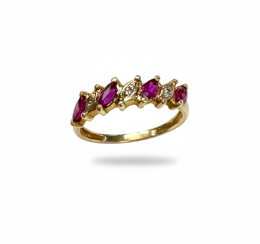 Bague empierrée en or jaune 18 carats, poinçon Tête d’Aigle, poids 1,88 g, taille 51. Sertie de 4 rubis de 0,3 cm et de 3 éclats de diamants, elle offre un contraste lumineux et élégant. Une pièce raffinée et harmonieuse, en très bon état, idéale pour apporter une touche de couleur et de sophistication.