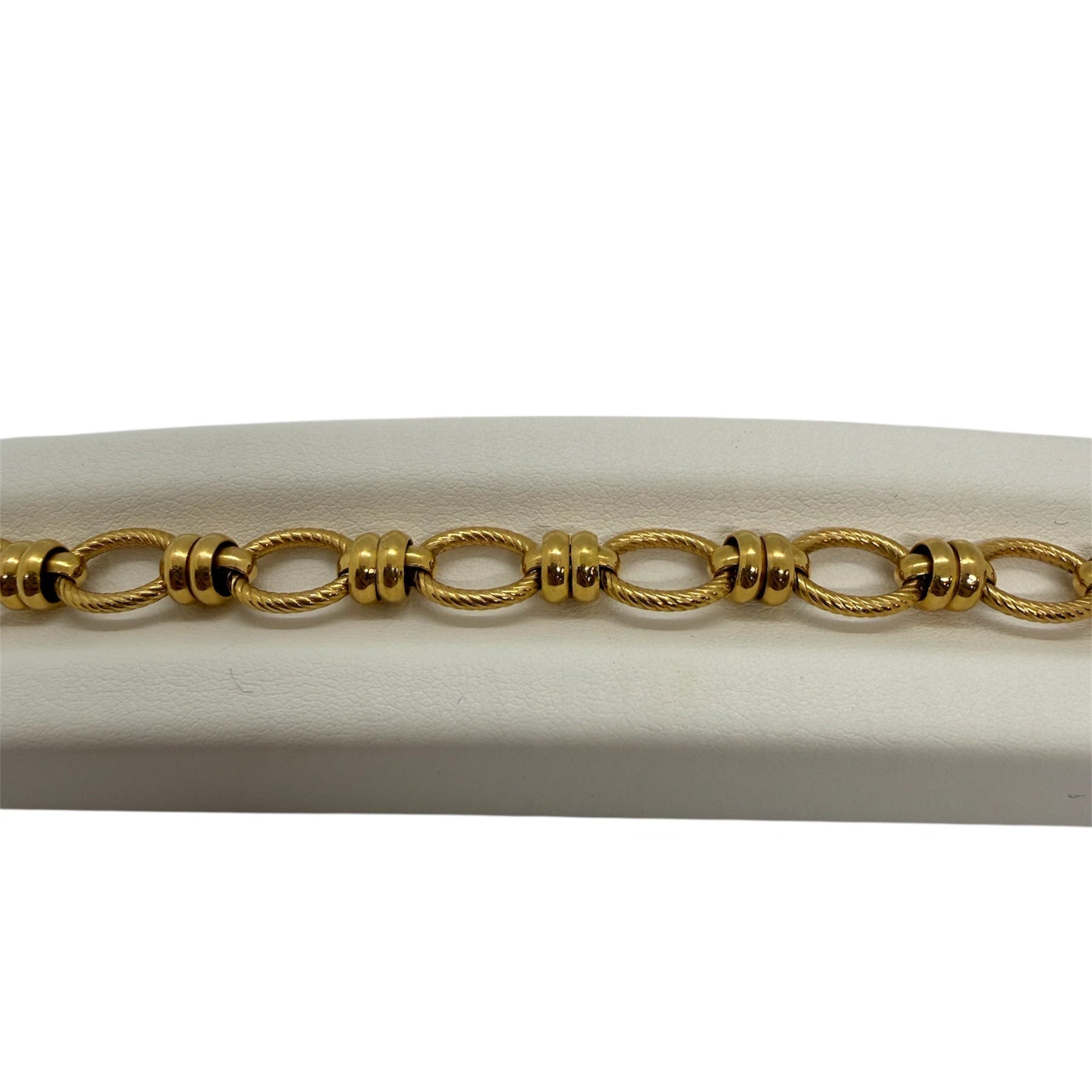Bracelet à maillons fantaisie en or jaune 750/1000, d’un poids de 13,54 g et d’une longueur de 20 cm. Largeur 7 mm, épaisseur 3 mm, fermoir anneau ressort. Sans poinçon mais testé conforme. En très bon état, il offre un style élégant et solide.