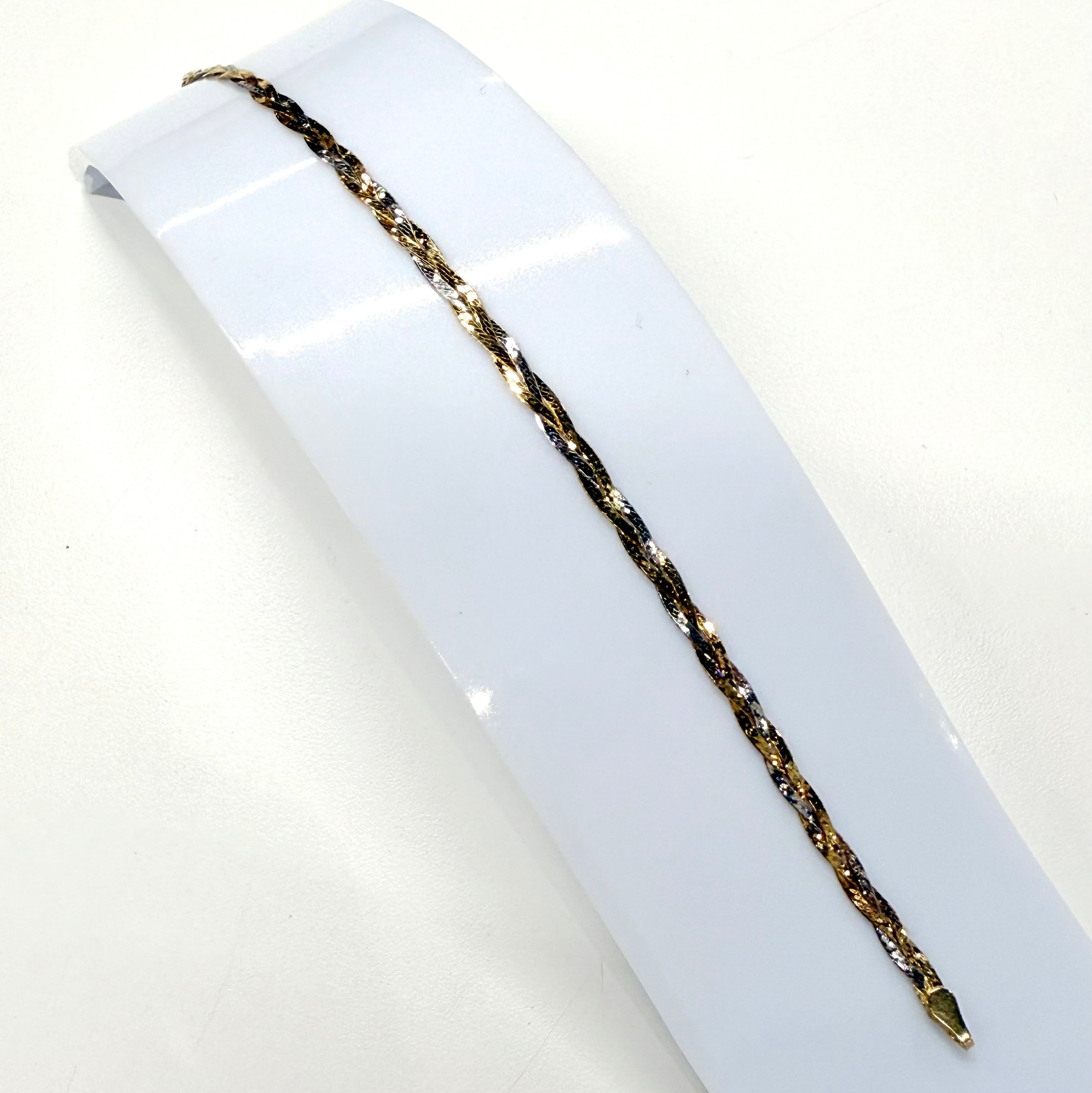 Bracelet tressé en or 18 carats (750/1000), poinçonné 750, alliant finesse et élégance. Sa maille tressée met en valeur l’éclat de l’or jaune, blanc ou rose. D’une longueur de 18 cm pour un poids de 2,17 g, il offre un porté léger et confortable. Fermoir anneau ressort sécurisé. Bijou en très bon état, idéal pour un style raffiné au quotidien.