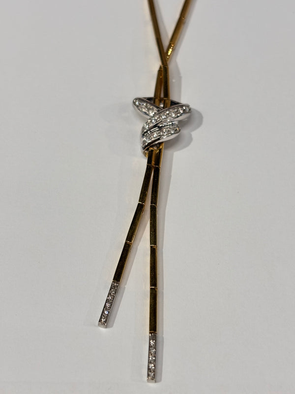 Sautoir en or jaune et or gris 18 carats (750/1000), poinçonné "750", d’un poids de 22,65 grammes. Il est composé de mailles miroir et doté d’un fermoir à cliquet. Le collier mesure 43 cm de longueur, avec une largeur et une épaisseur de 0,2 mm. Il est orné de 15 diamants, apportant une touche de brillance élégante. L’ensemble est en très bon état.