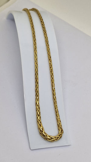 Collier princesse en or jaune 18 carats (750/1000) avec maille palmier, fermoir mousqueton et poinçon 750. Il pèse 10,93 g, mesure 42 cm de longueur, avec une largeur et une épaisseur de 3 mm. Sans pierres, en bon état.