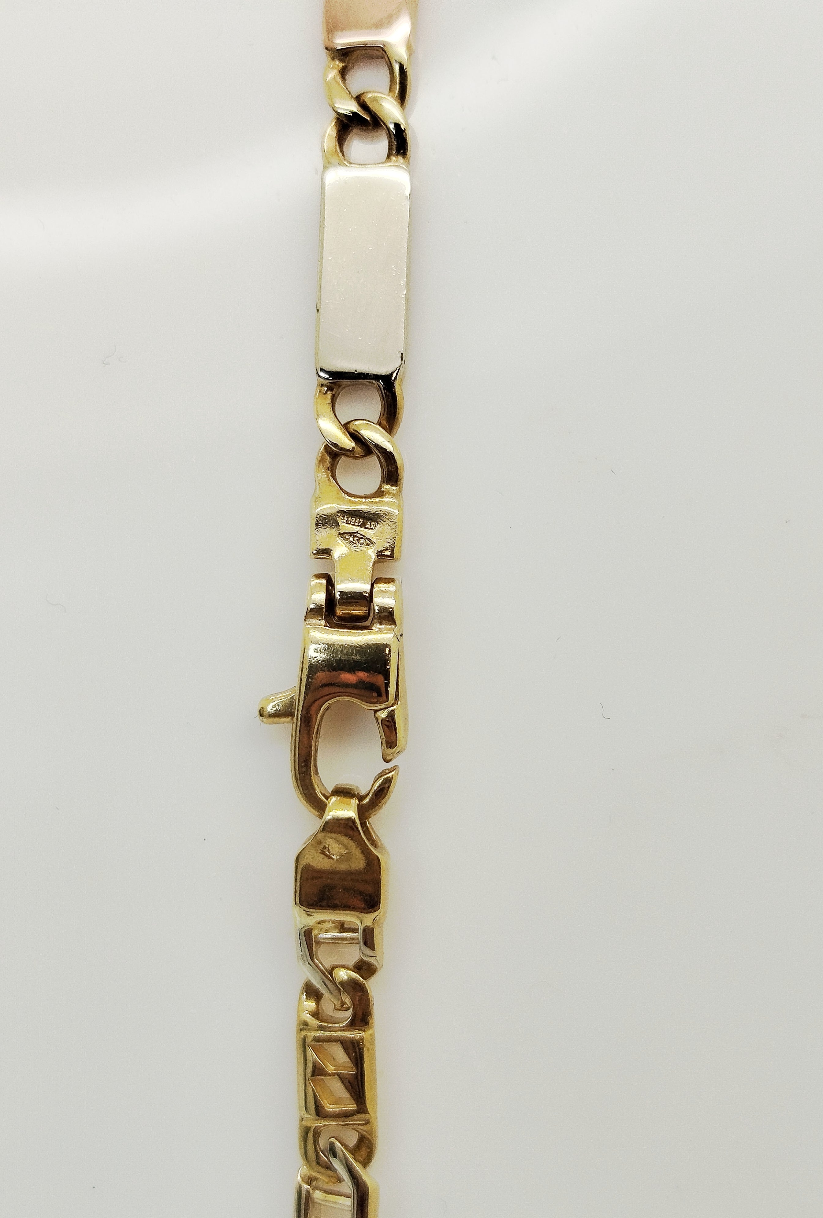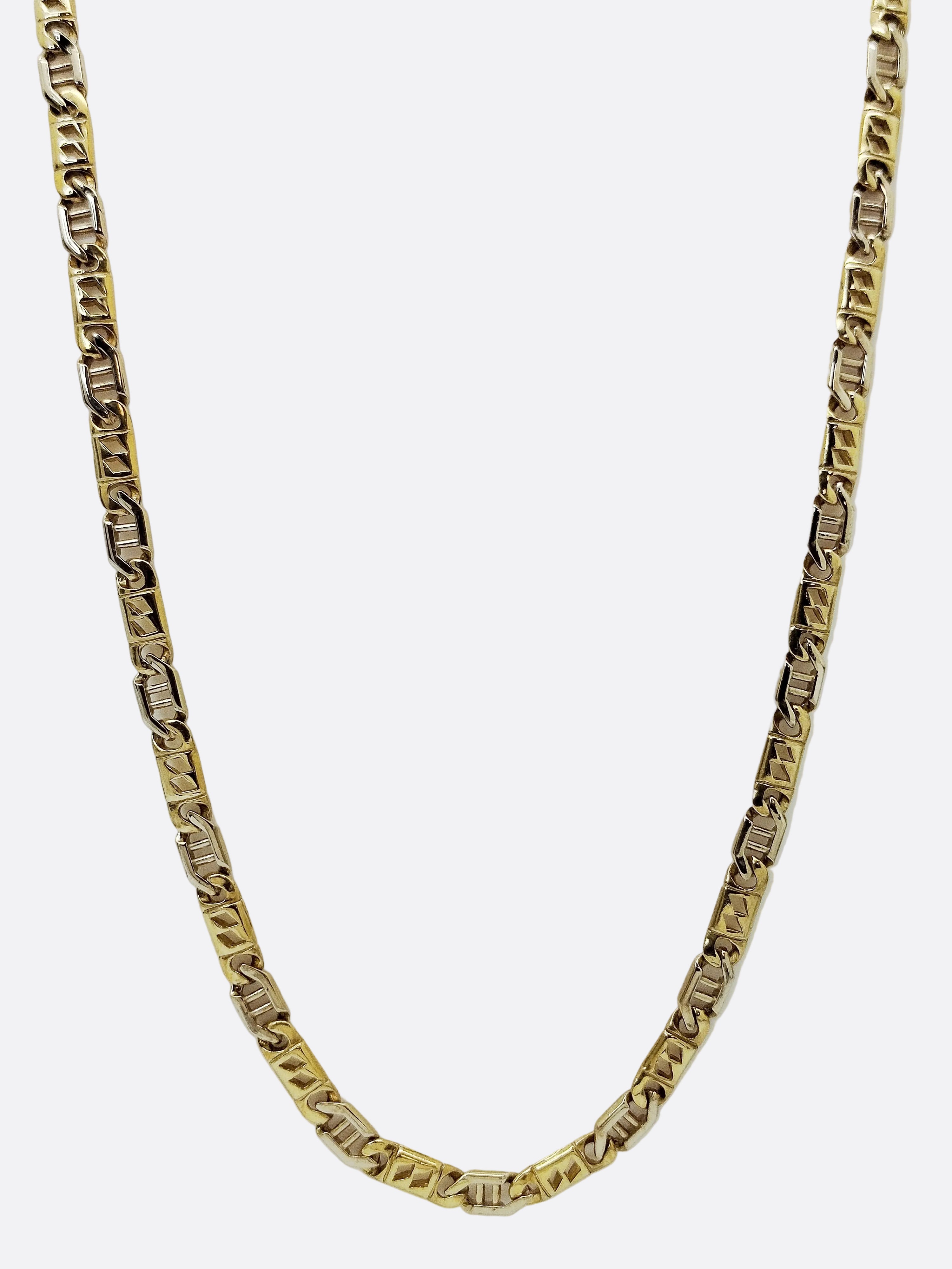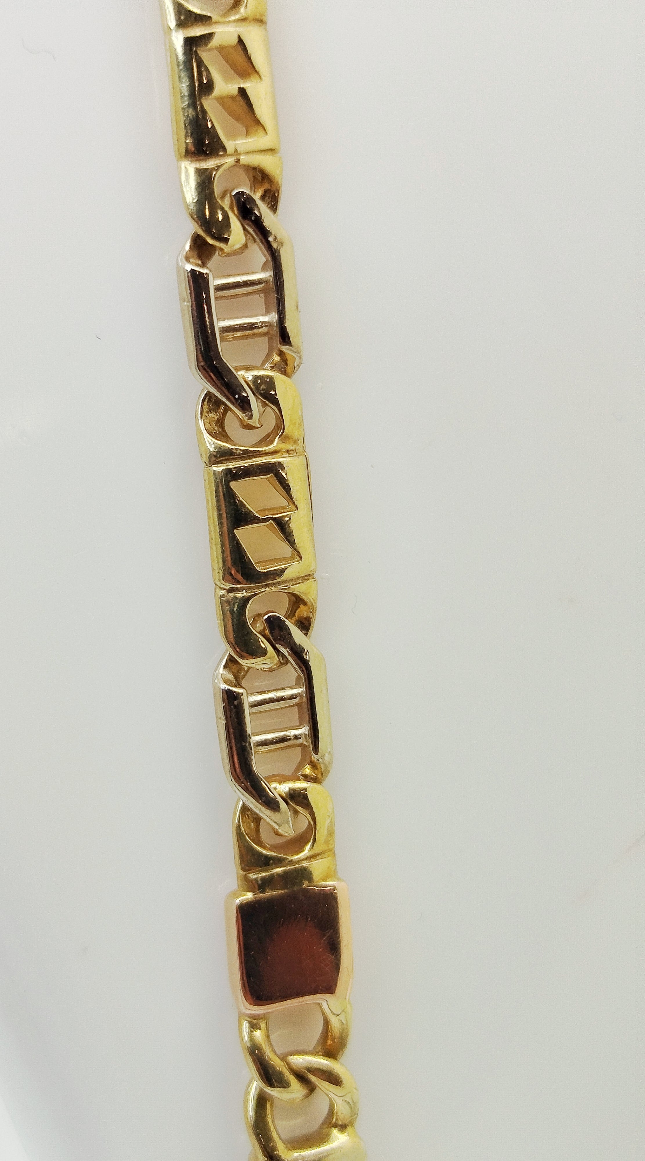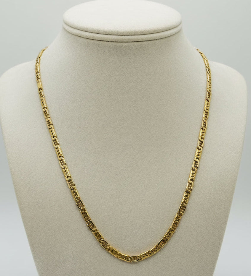 Collier en or jaune 18 carats (750/1000), poinçonnée 750, équipée d’un fermoir mousqueton sécurisé. Poids 28,33 g, longueur 52 cm, largeur 0,4 cm, épaisseur 0,2 cm. En bon état, chaîne en or massif offrant solidité, confort et élégance intemporelle.