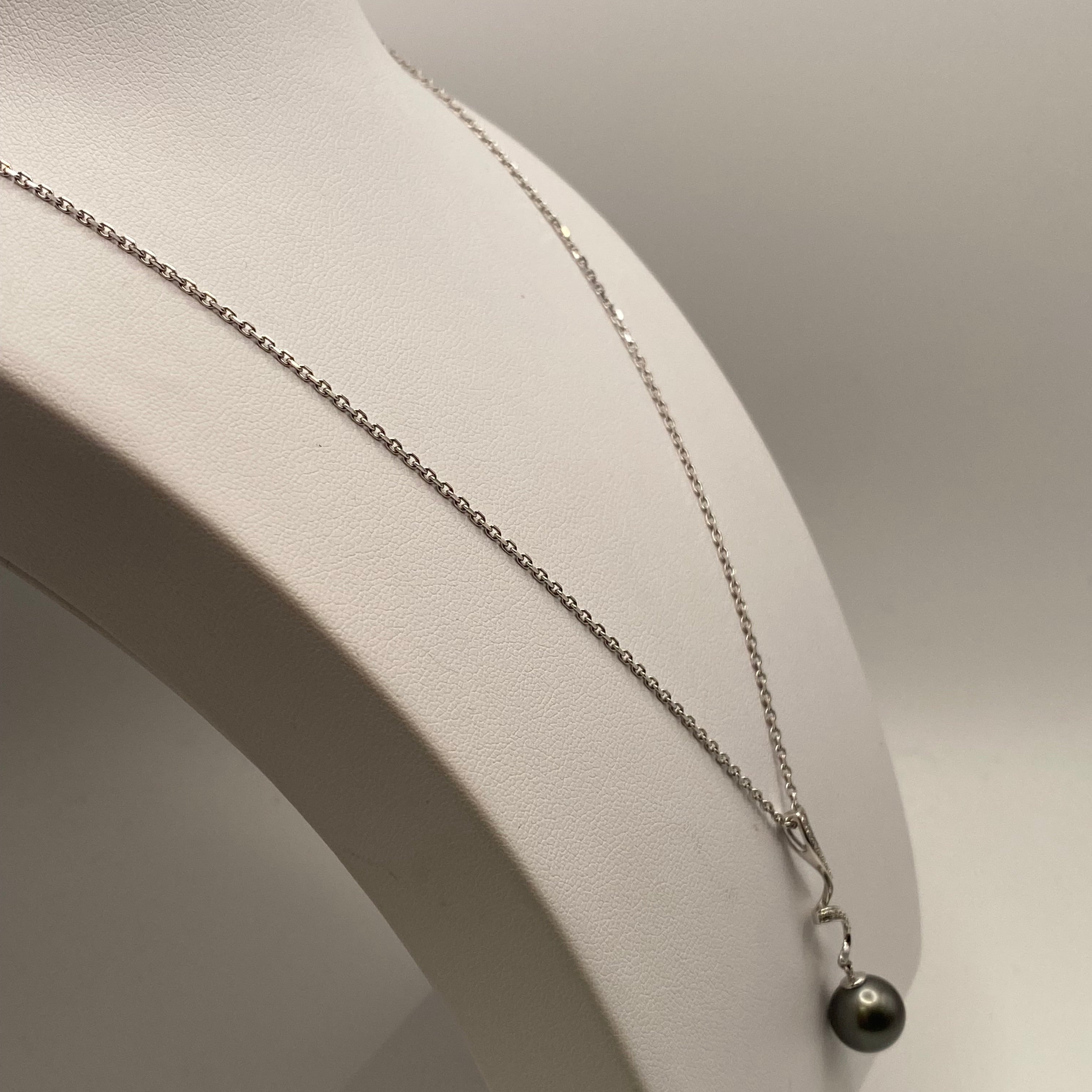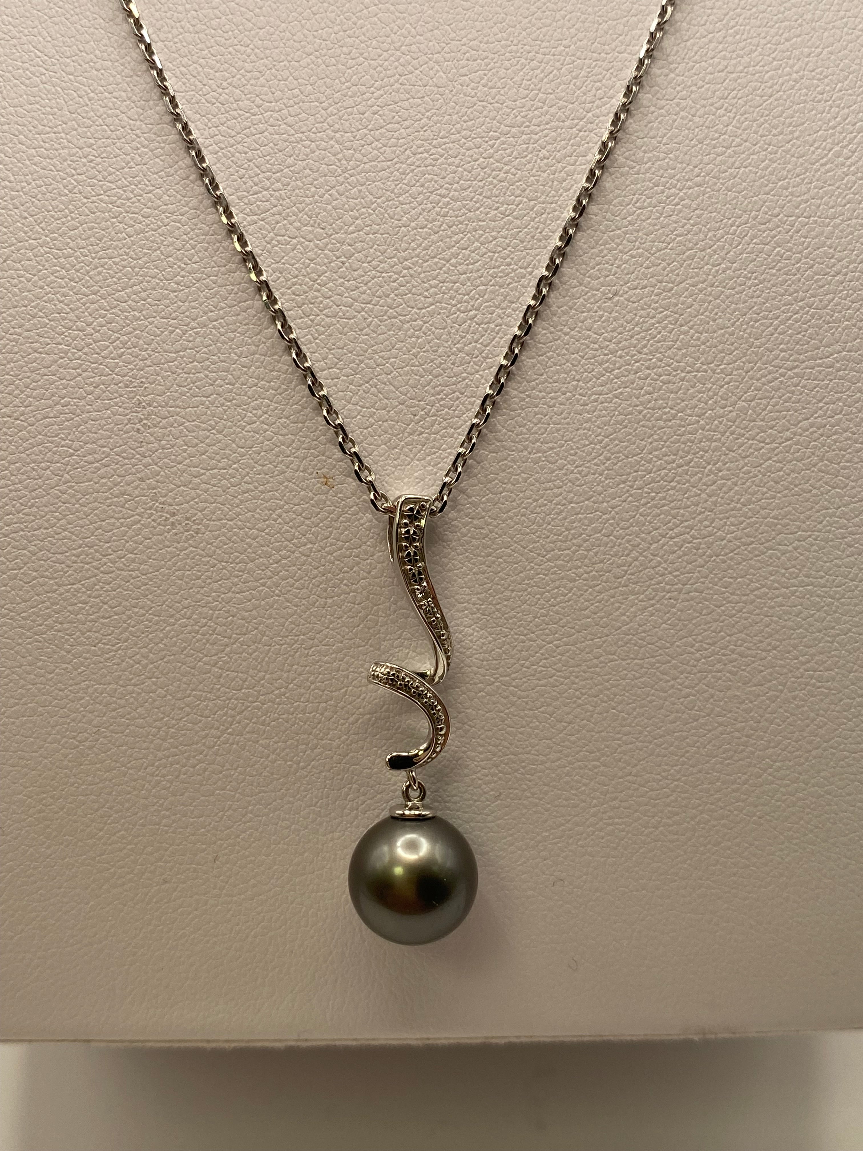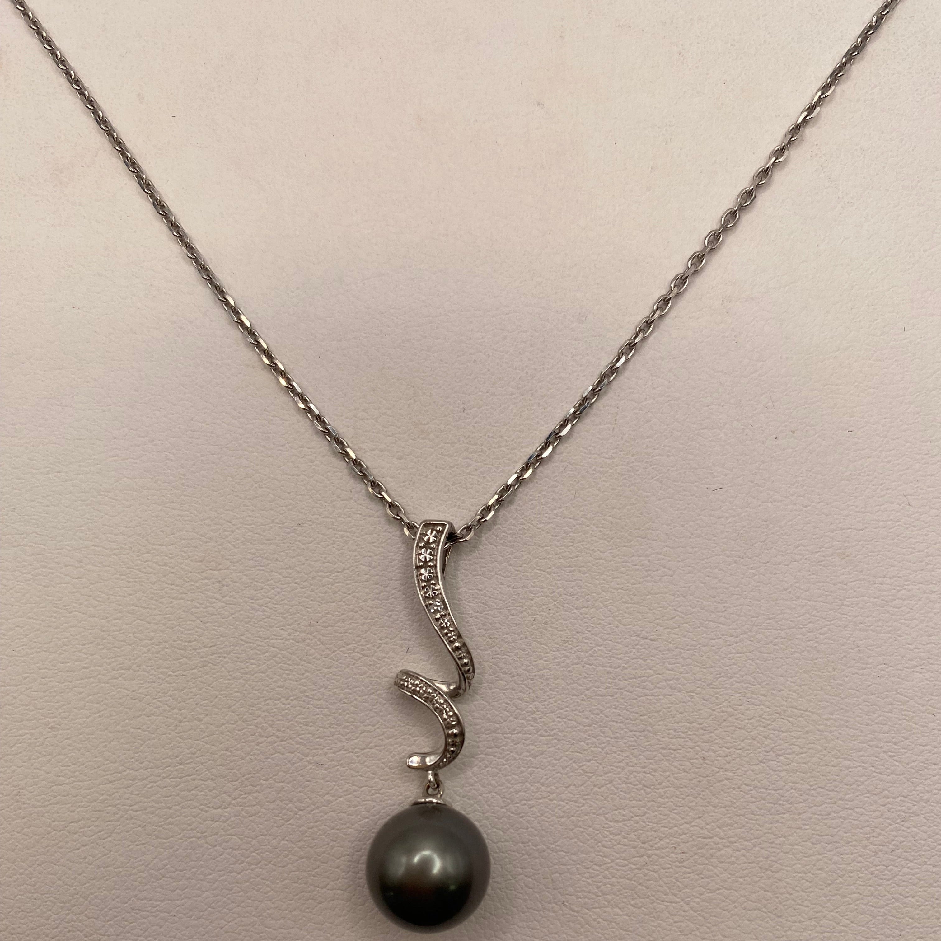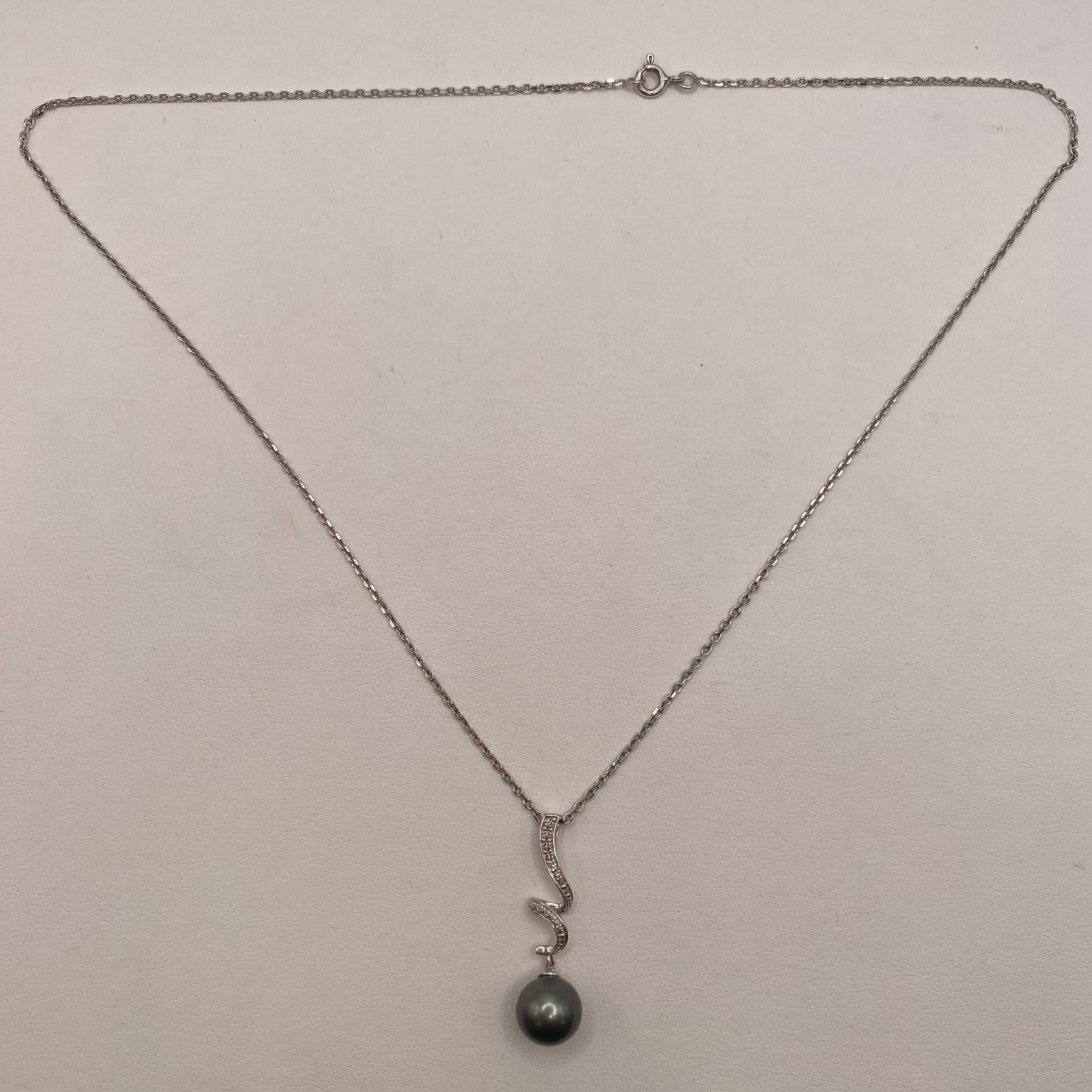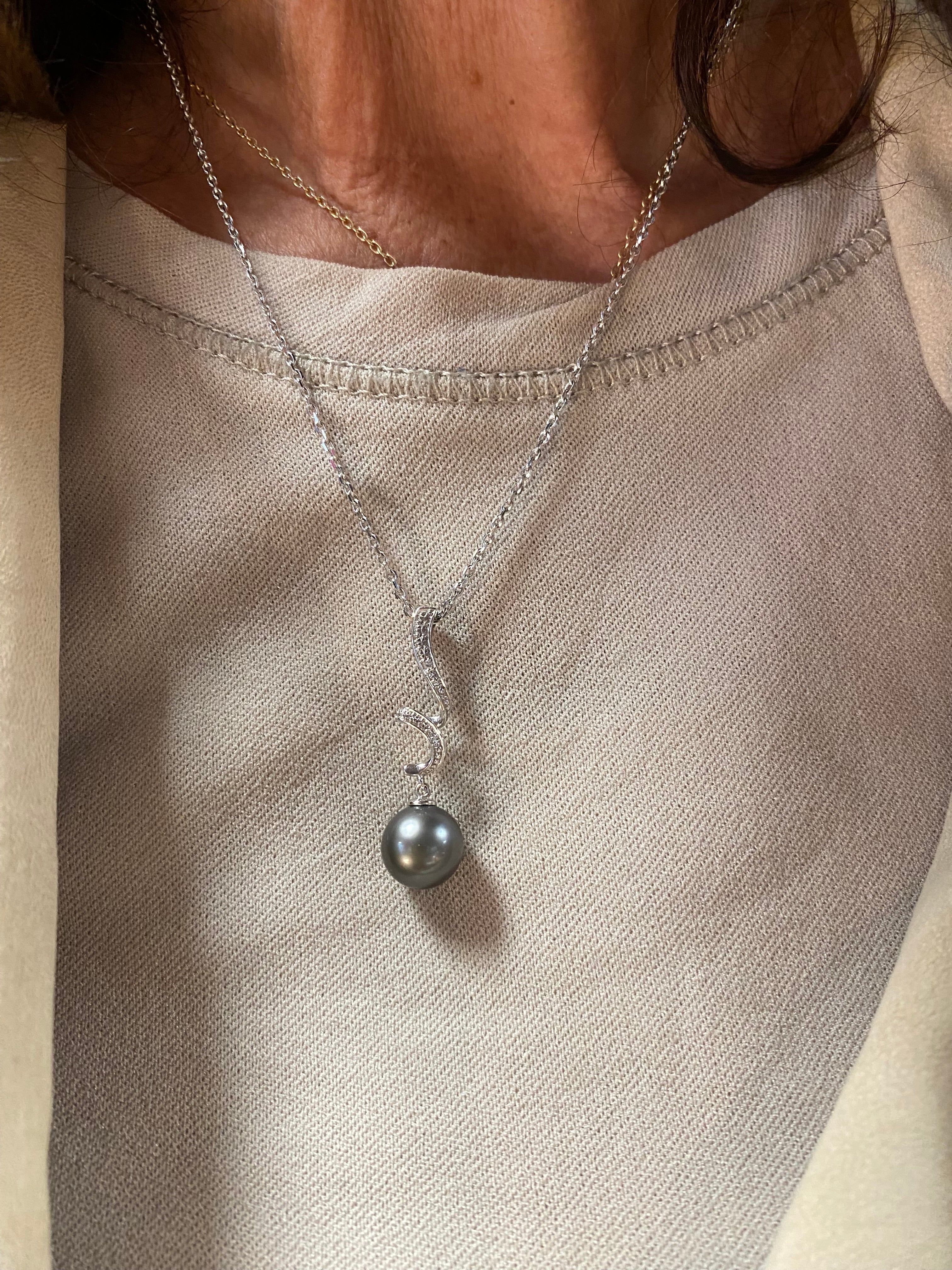 Collier princesse en or blanc 18 carats (750), maille forçat, longueur 45,5 cm, poids 5,39 g. Pendentif de 3,2 cm serti d’un diamant brillant et d’une perle de Tahiti grise de 9 mm. Fermoir anneau ressort.