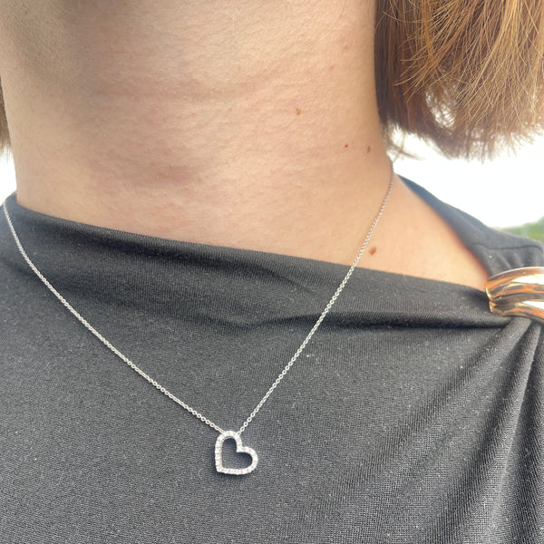 Collier de type princesse en or blanc 18 carats (750/1000), avec maille jaseron et fermoir à anneau ressort. Il mesure 42 cm de long pour un poids de 2,78 g. Serti de 20 éclats de diamants, il est en très bon état.