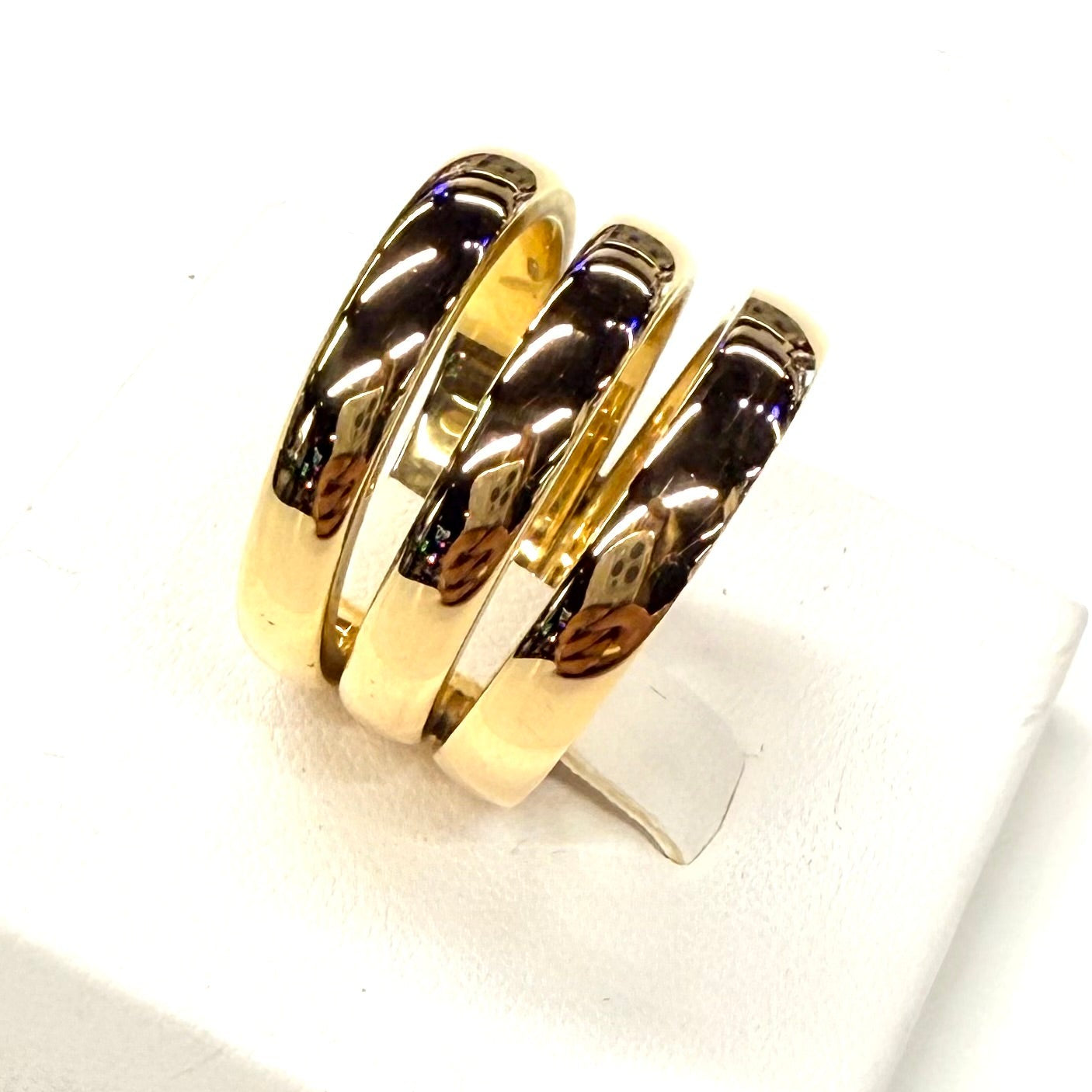 Bague 3 jonc en or jaune 750/1000 (18 carats), poinçonnée tête d’aigle, offrant une allure élégante et intemporelle. Avec son poids de 19,48 g et sa taille 53, elle présente une belle présence au doigt tout en restant confortable. Proposée en très bon état.