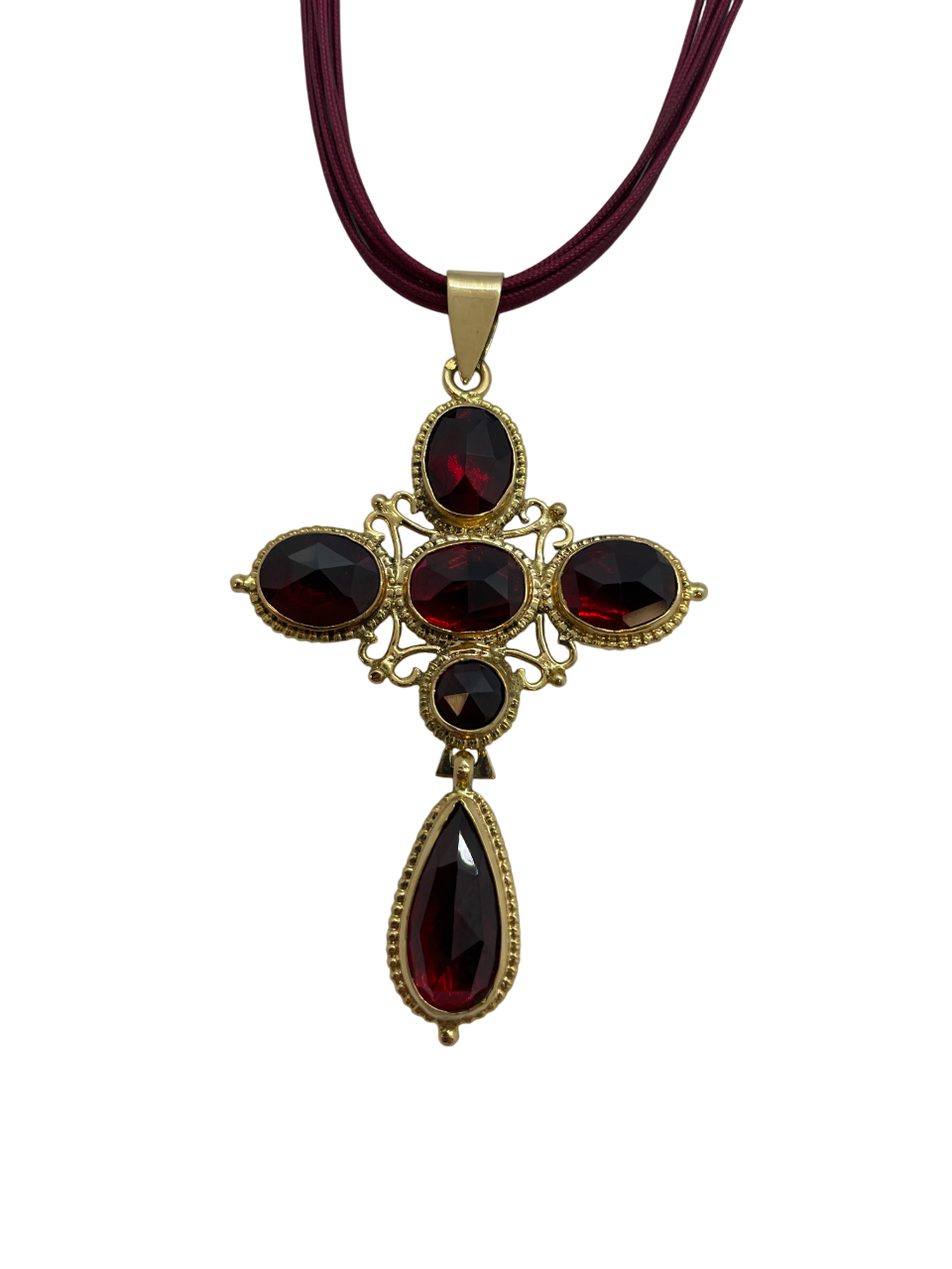 Collier ras du cou en corde tissu avec attaches en or jaune 18 carats (750/1000), poinçonné Tête d’Aigle. Orné d’un pendentif serti de 6 grenats, il mesure 27,5 cm de long. Le pendentif fait 6,5 cm de haut, 4 cm de large et 0,4 cm d’épaisseur. Fermoir anneau ressort. Poids total : 10,52 g. Bon état.