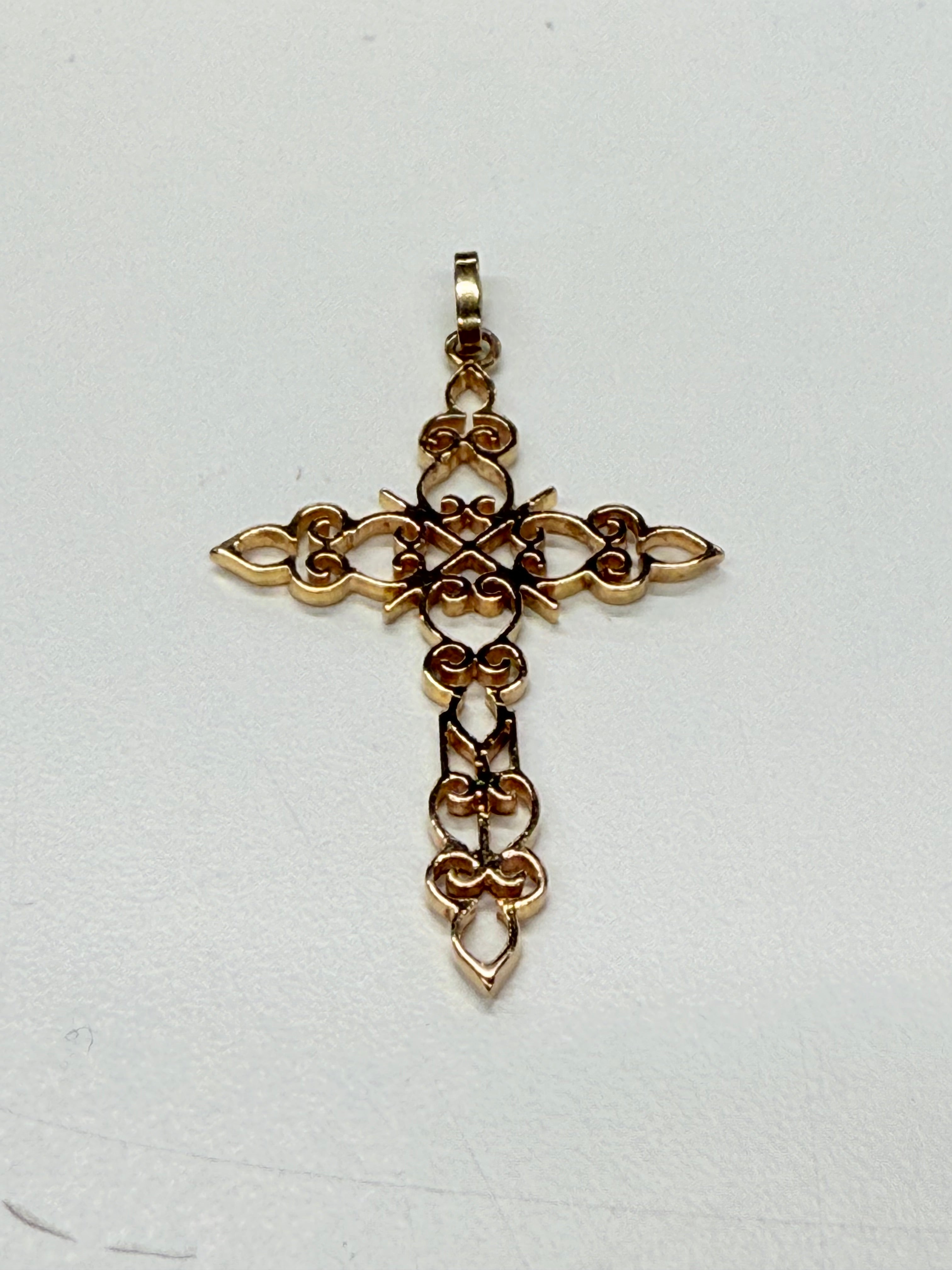 Pendentif croix en or jaune 18 carats (750/1000). Pesant 3,15 grammes, il présente des dimensions élégantes avec une hauteur de 4,5 cm, une largeur de 2,7 cm, et une épaisseur fine de 0,1 cm. Sans pierres, son design pur et raffiné met en valeur la beauté naturelle de l'or jaune. En très bon état, ce pendentif est une pièce intemporelle, idéale pour compléter une chaîne en or et sublimer votre collection de bijoux.