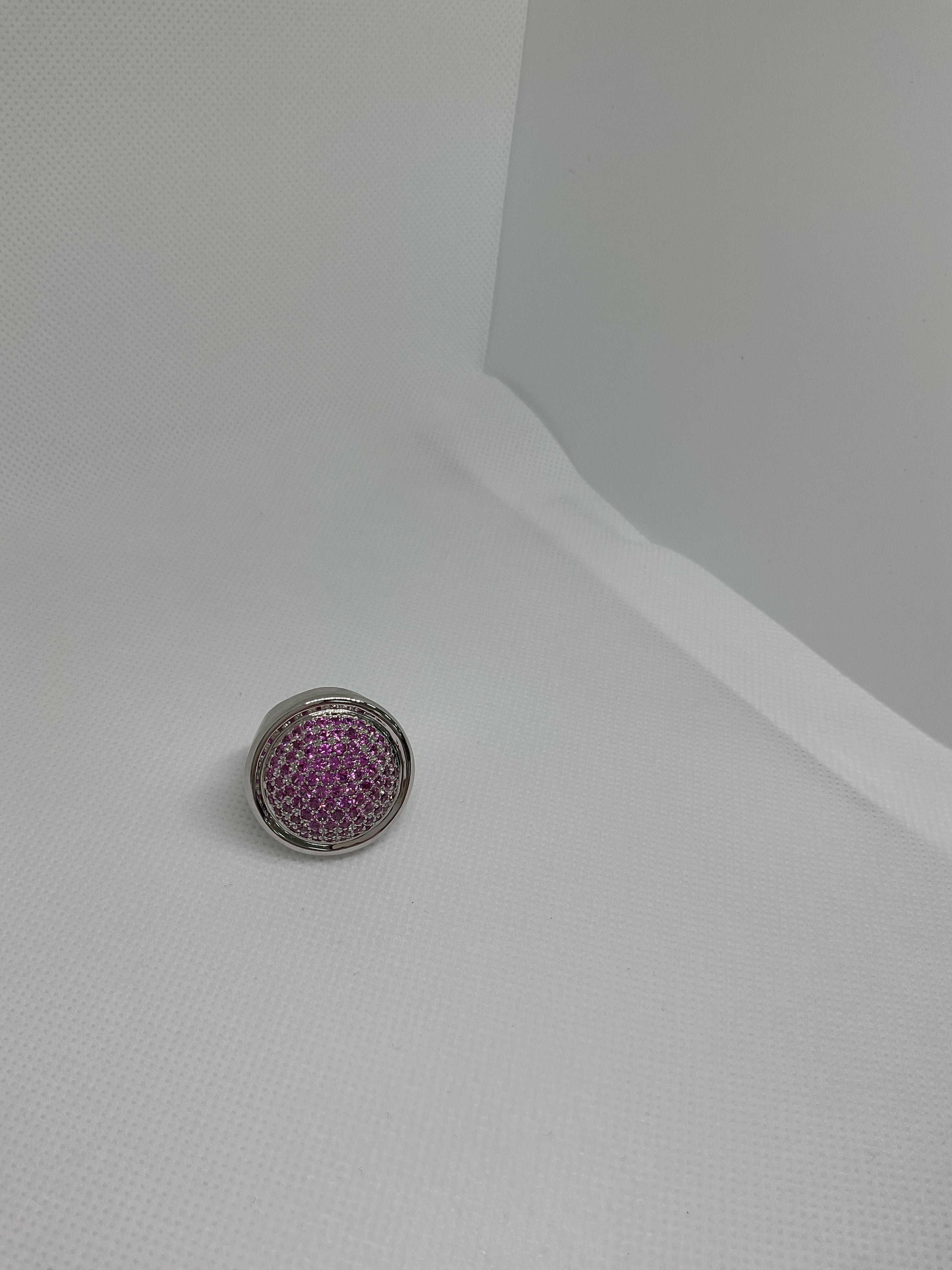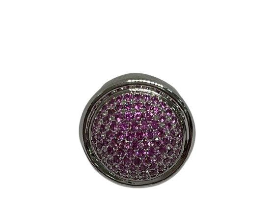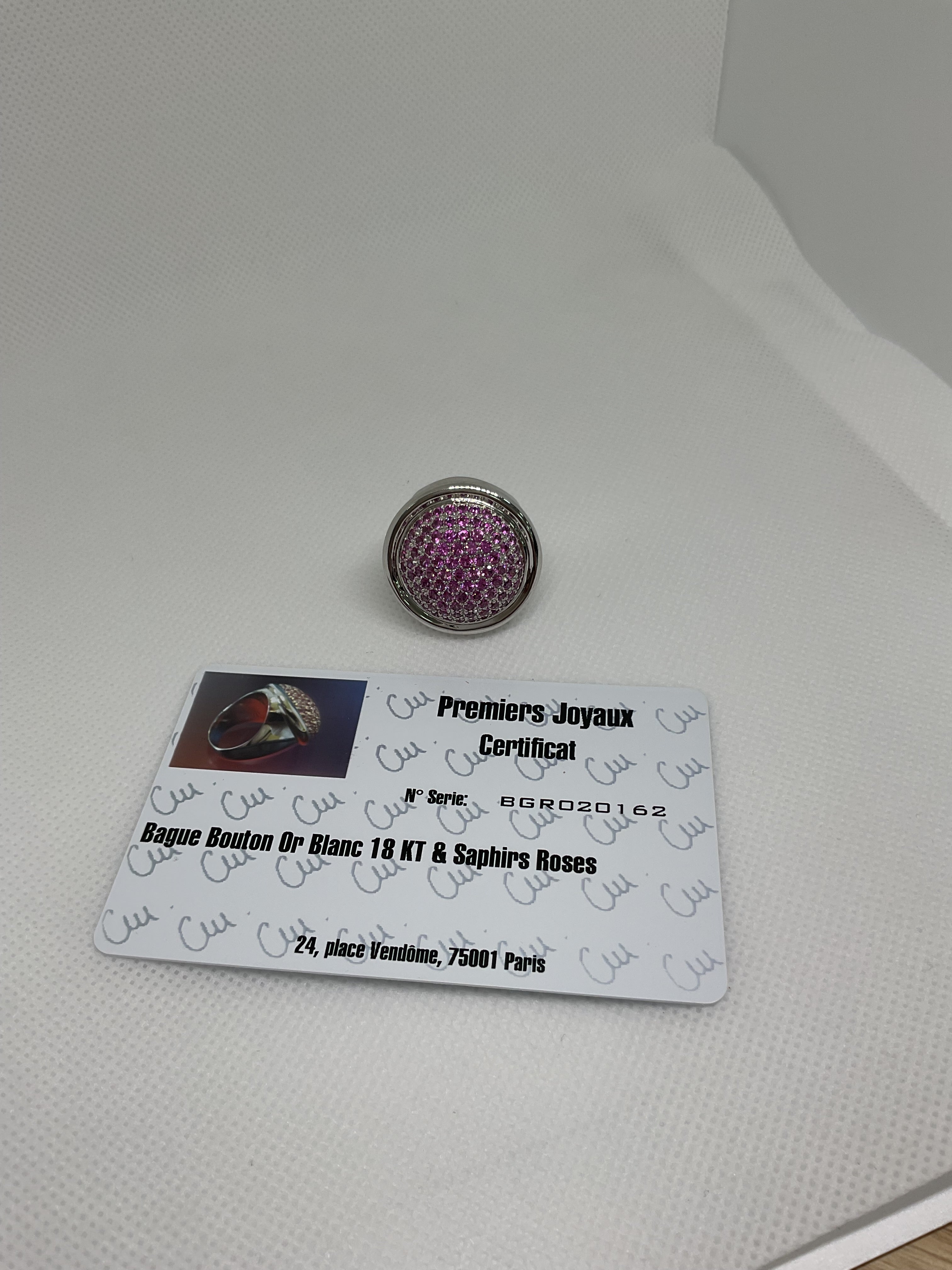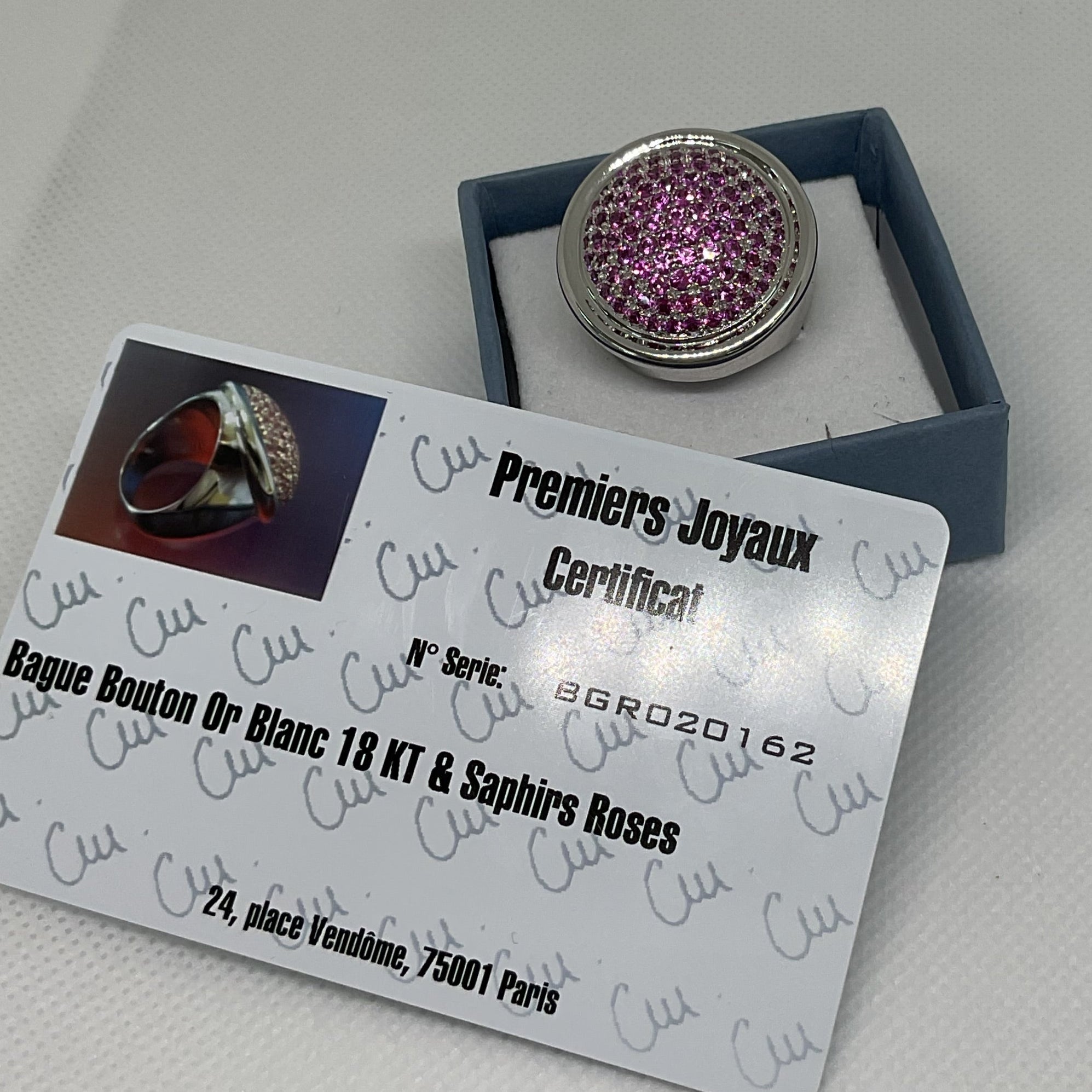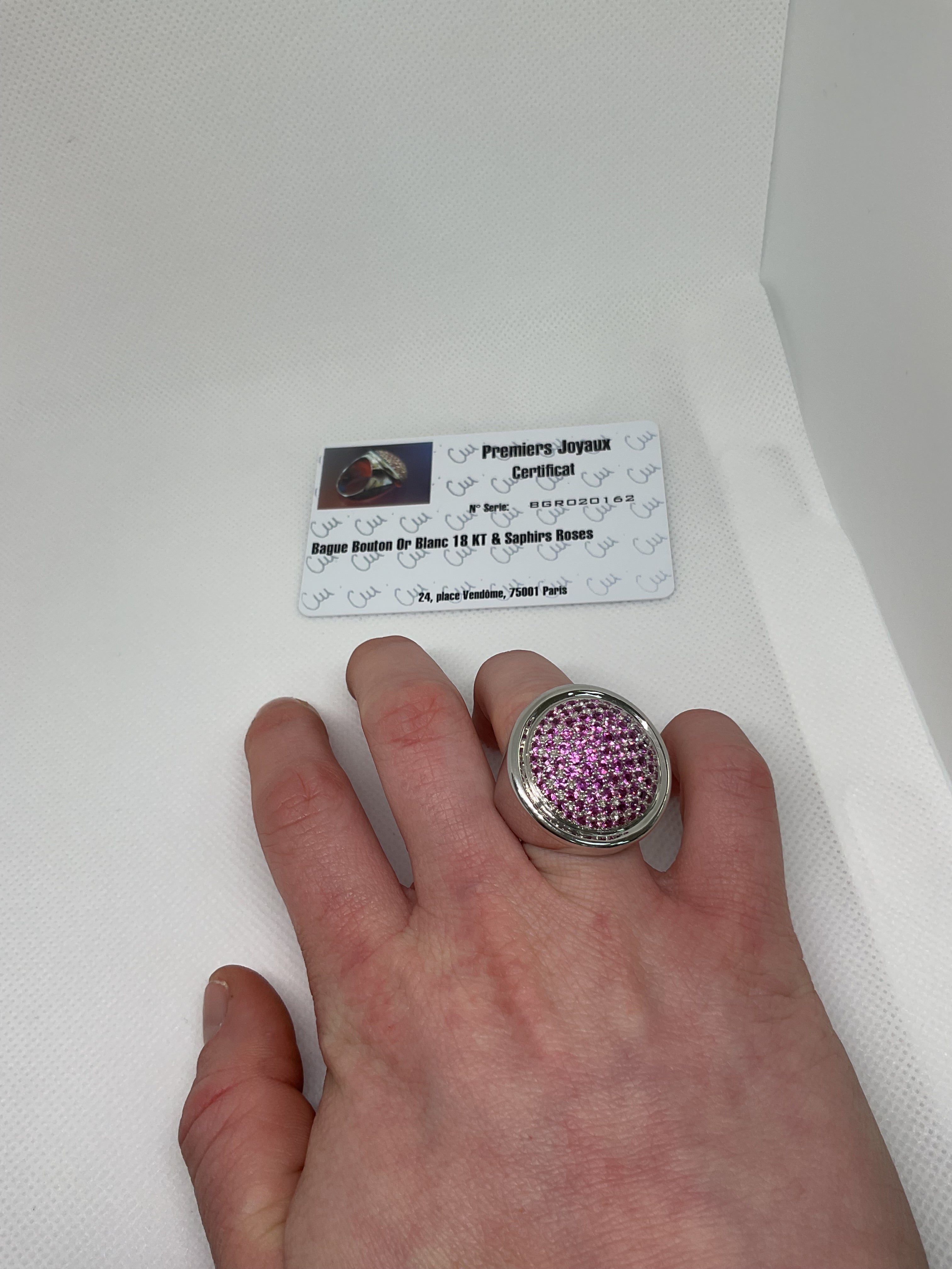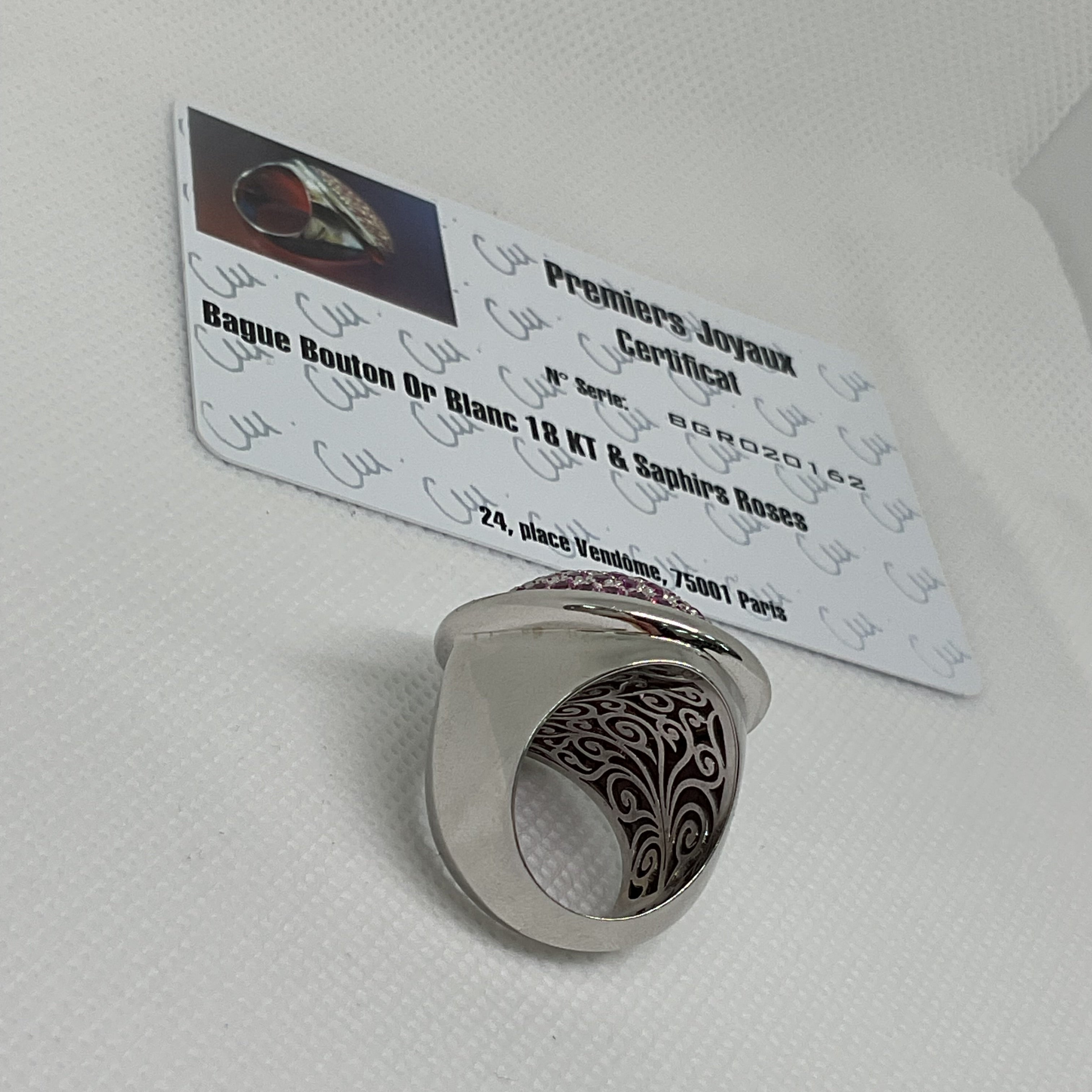 Magnifique bague bouton signée Premiers Joyaux en or blanc 18 carats (750/1000). Pesant 25,08 grammes et de taille 54, elle est ornée de 60 saphirs roses éclatants qui subliment son design unique et magique. En état comme neuf, cette pièce de haute joaillerie est idéale pour les amateurs de bijoux luxueux et élégants.