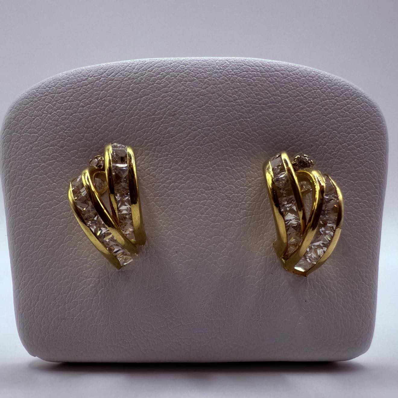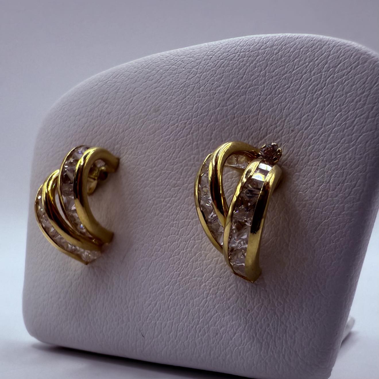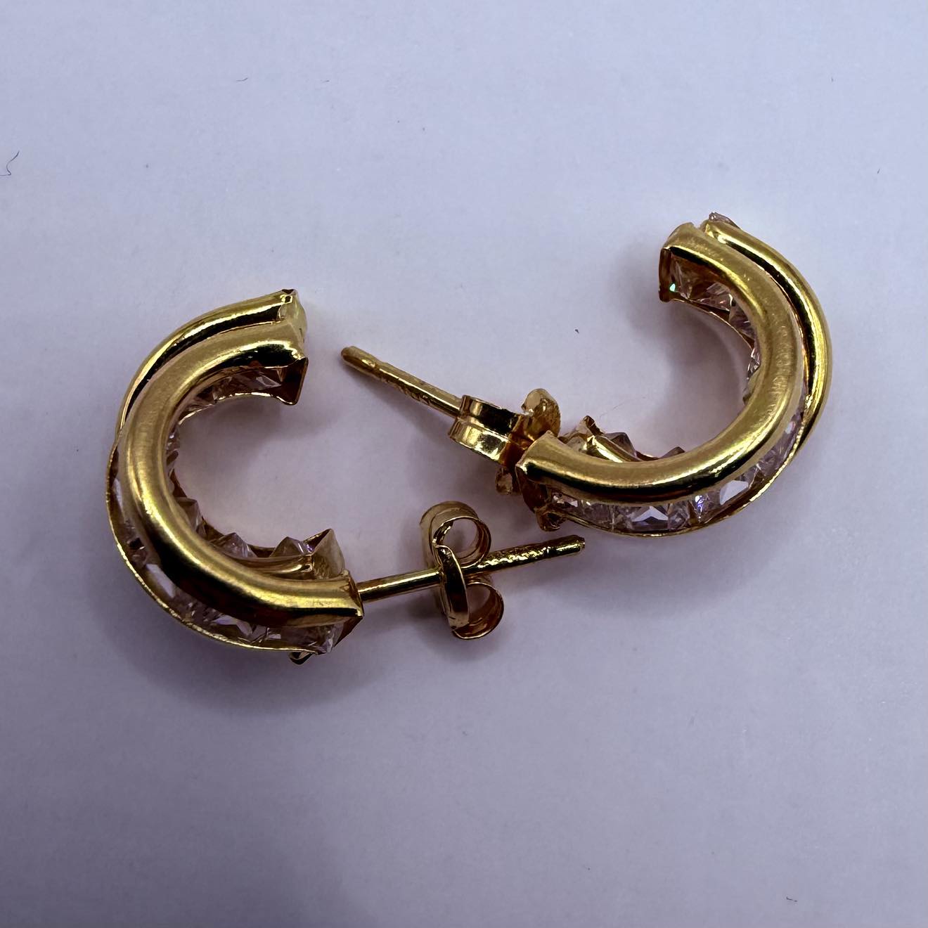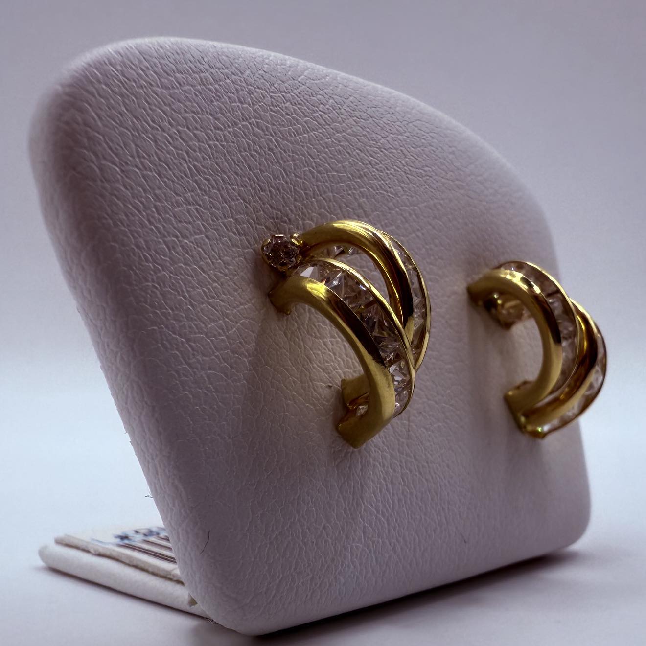 Boucles d’oreilles de type créoles/demi-créoles en or jaune 18 carats (750/1000), poinçonnées 750. Elles mesurent 1 cm de hauteur, 6 mm de largeur et 1 mm d’épaisseur, pour un poids total de 1,94 gramme. Fermoirs poussettes. Bon état.