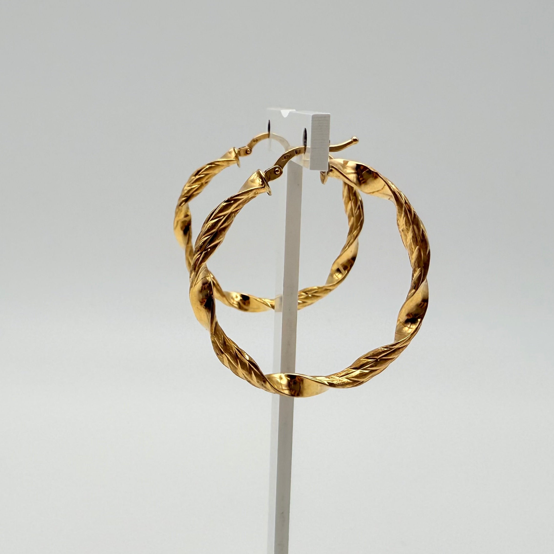 Boucles, de type créoles ou demi-créoles, sont en or jaune 18 carats (750/1000) et portent le poinçon 750. Elles mesurent 3,2 cm de hauteur, avec une largeur et une épaisseur de 0,3 cm, pour un poids total de 3,2 grammes. Équipées de fermoirs à cliquets, elles sont dépourvues de pierres et présentées en bon état.