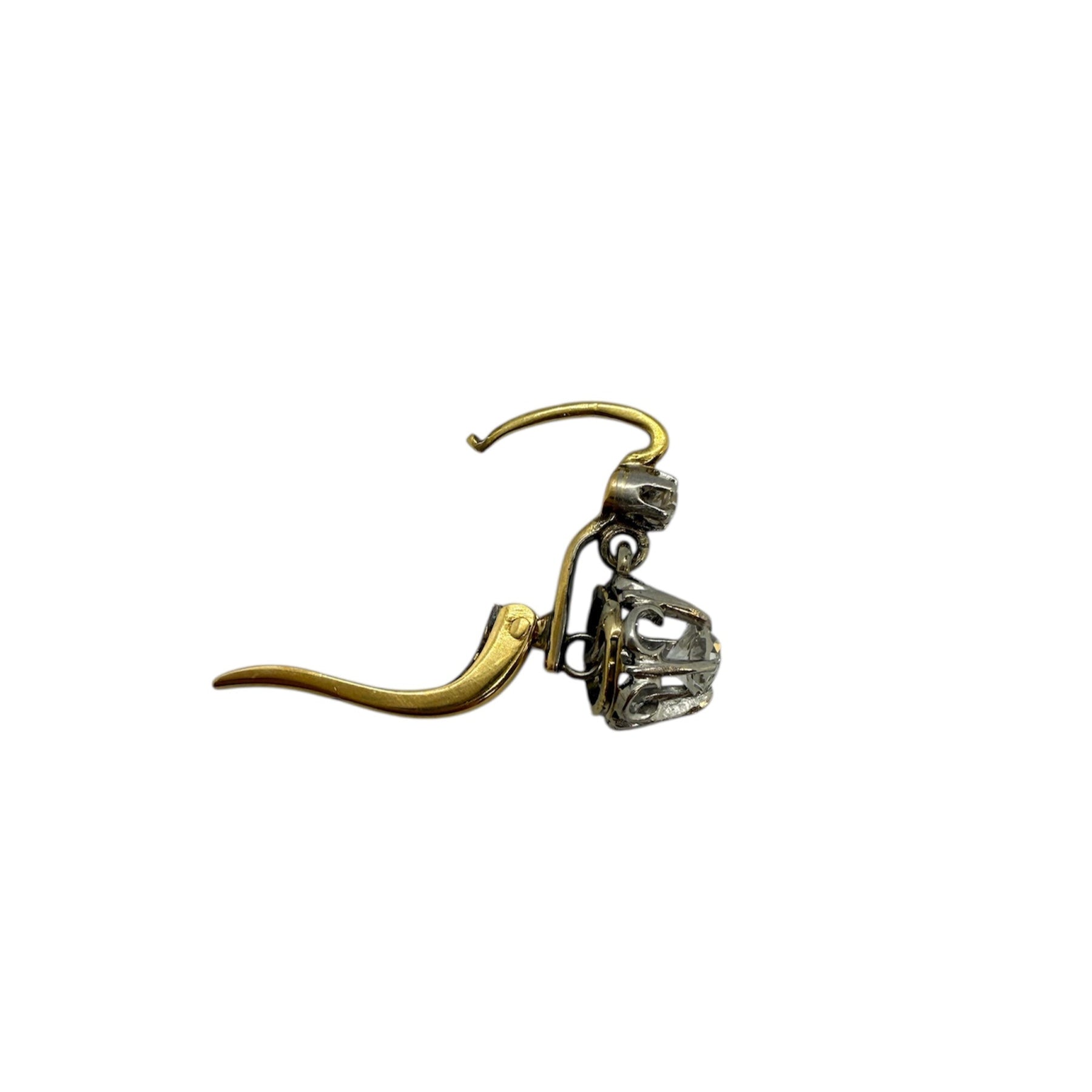 Dormeuses en or jaune et or blanc 18 carats, sans poinçon. Serties de 2 diamants (0,10 ct chacun) et 2 éclats (0,01 ct). Dimensions : 11 x 9 mm, poids 2,87 g. Élégantes et lumineuses, en bon état.