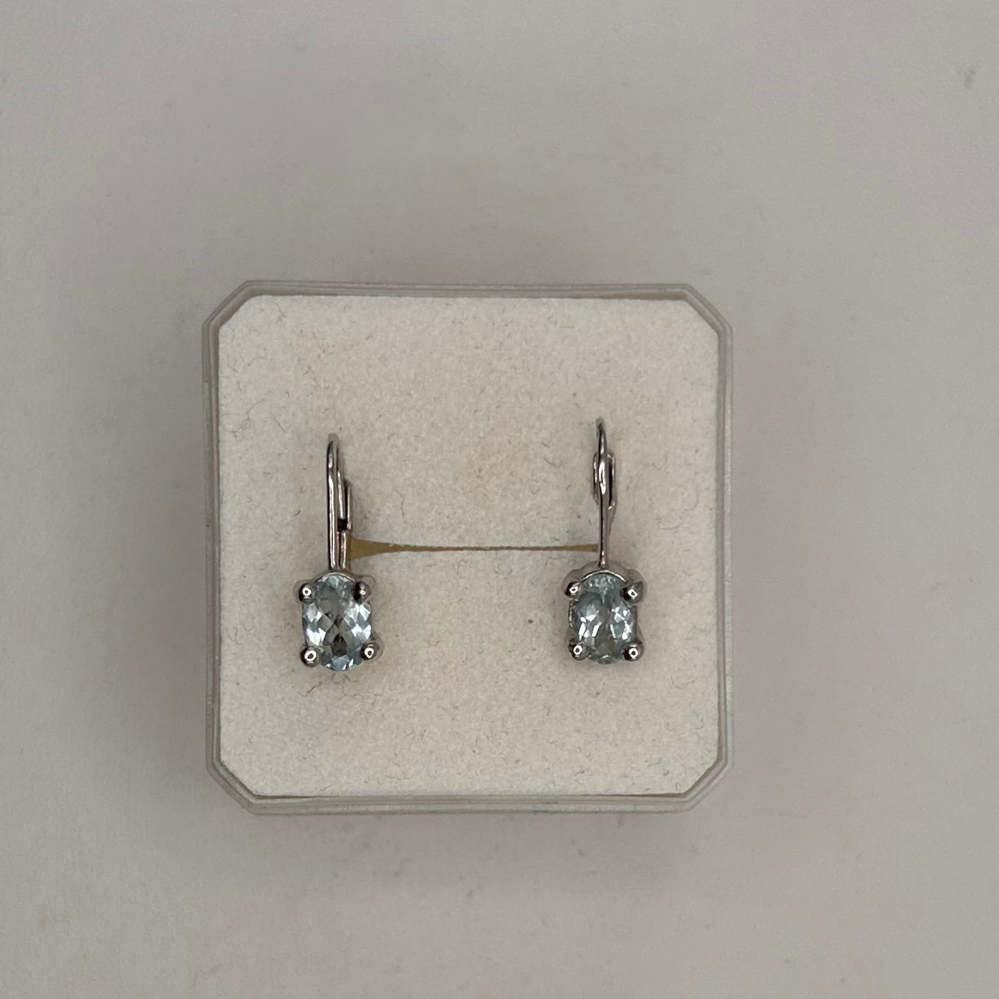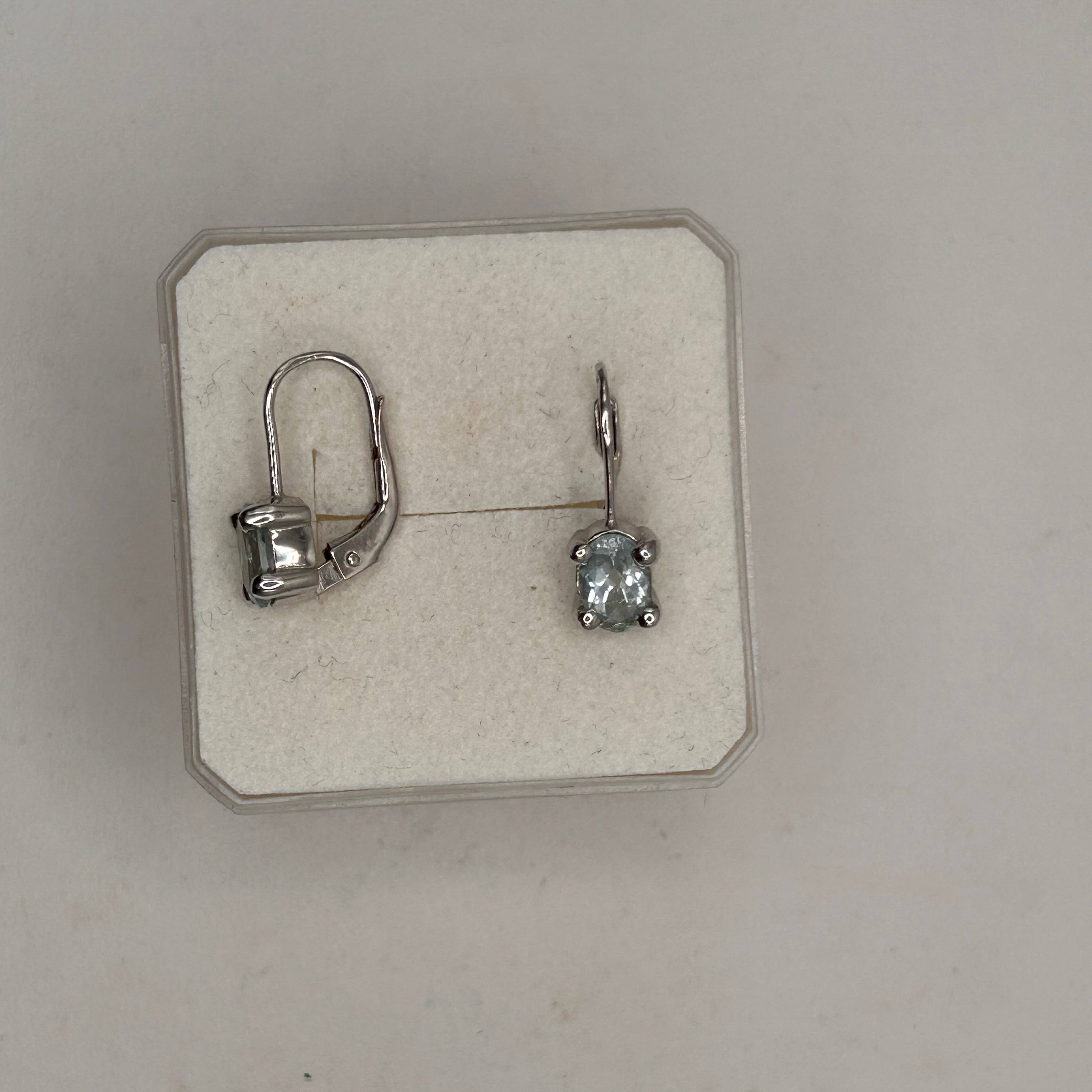 Élégantes créoles (1,6 cm) en or blanc 750‰ (2,85 g) serties de 2 aigues-marines (0,7 x 0,5 cm). Avec leur fermoir dormeuse et leur épaisseur discrète (1,2 cm), ces boucles en très bon état allient minimalisme et éclat naturel.