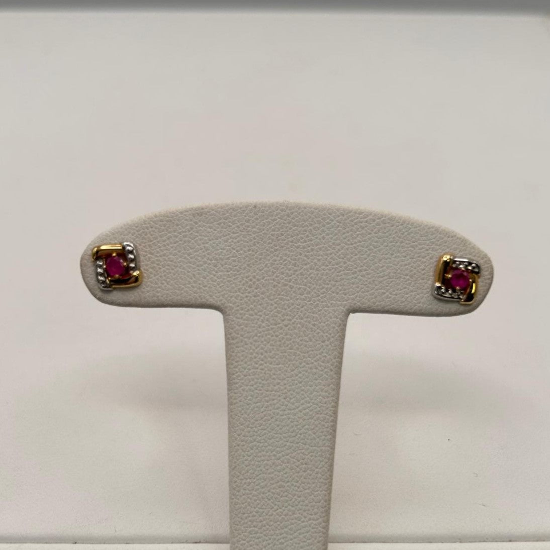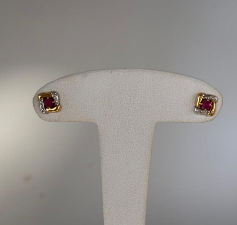 Ces boucles d’oreilles de type clou sont en or jaune 18 carats (750/1000) avec un fermoir à poussettes, poinçonnées 750. Chaque boucle est ornée d’un rubis, pour un total de deux pierres, et pèse 0,56 gramme. En bon état, elles mesurent 0,65 cm de hauteur et de largeur, avec une épaisseur de 1,15 cm.